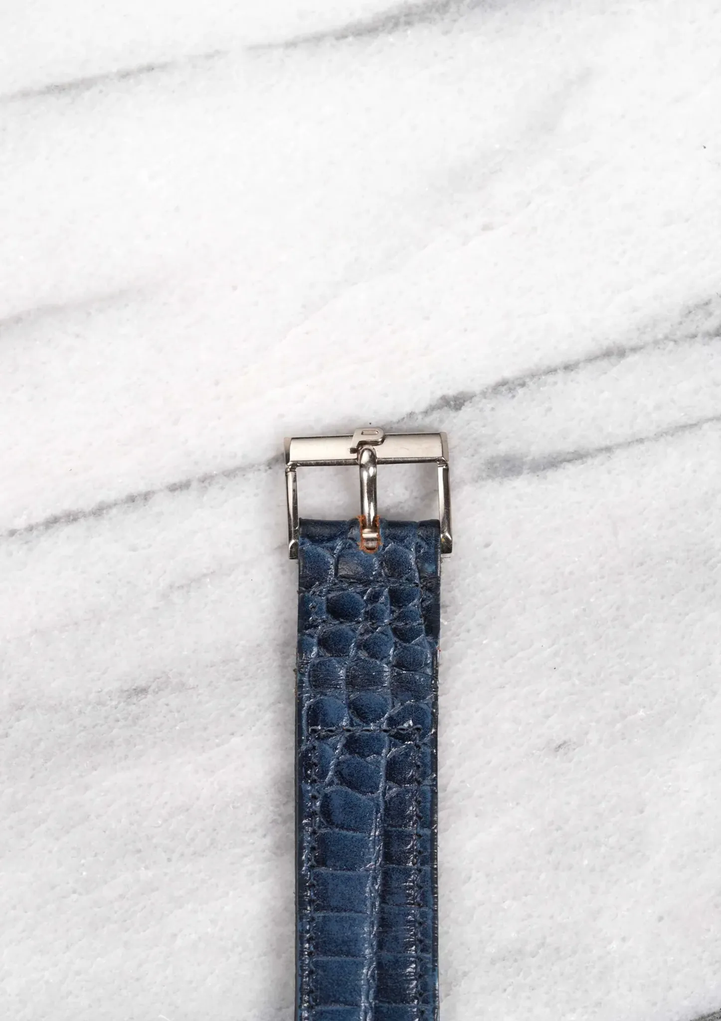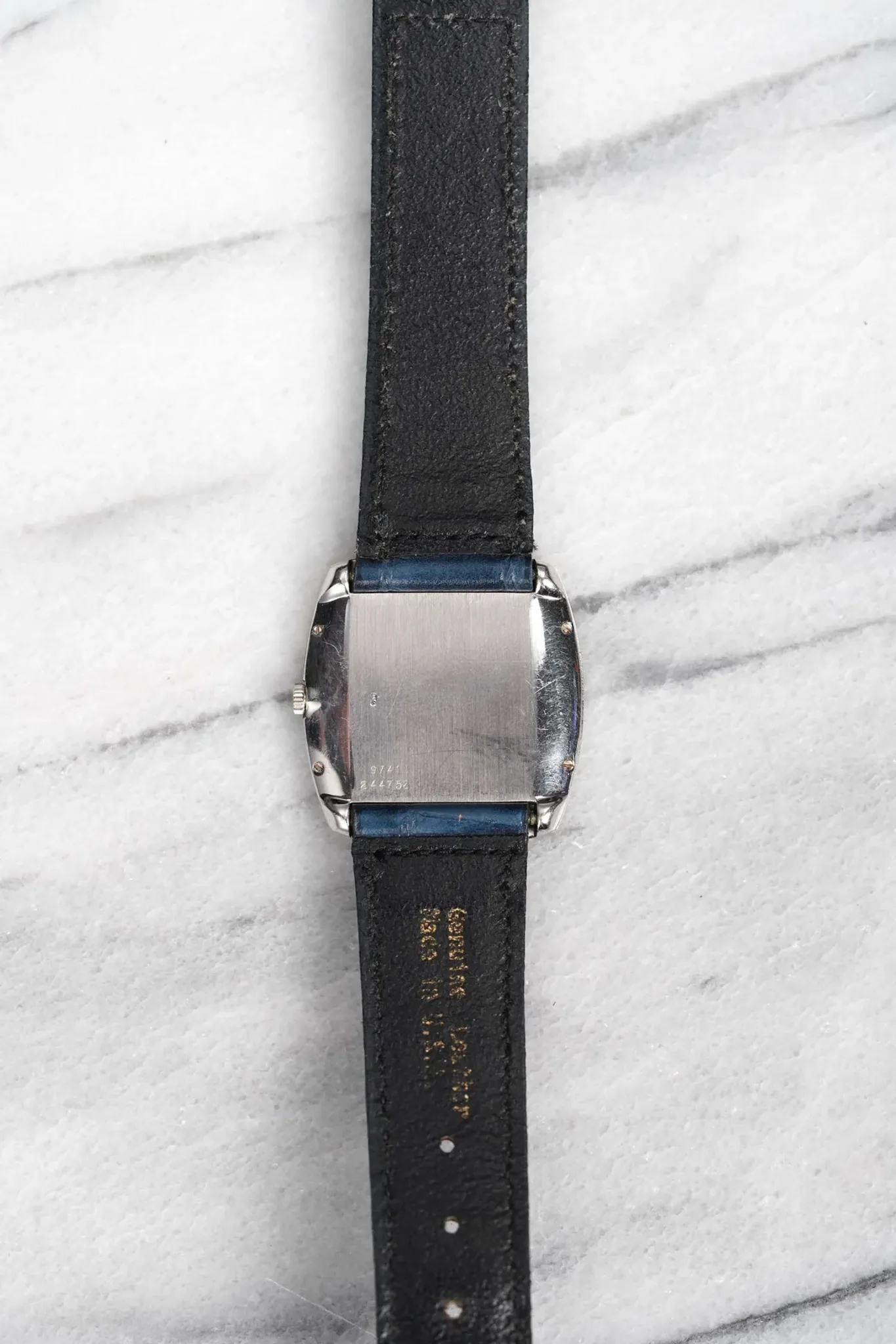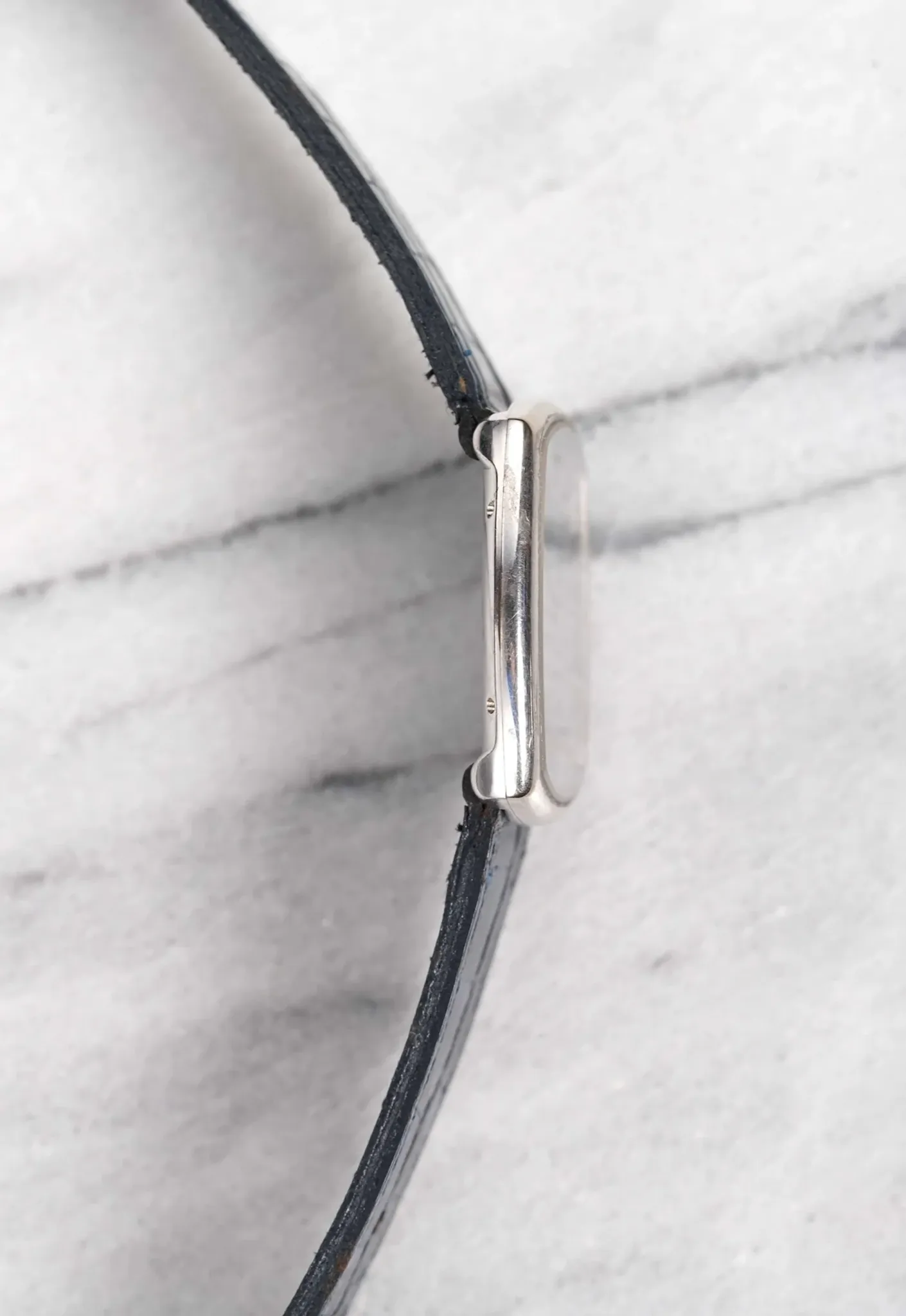 Here's a vintage Piaget tank reference 9741 manual wind in 18K white gold with a blue sunburst dial from the 1970s. Tonneau case. Keeps great time and is fully functional. Measurements include a 30mm case size and 19mm lug width. It’s on an aftermarket blue leather strap and signed gold buckle. Time only. White gold case and screw down caseback. These tanks are quite uncommon. Thick bezel. The dial and crystal is free from any scratches or marks. All parts are original including the dial, crown, movement, and caseback. Both the dial and case are in great cosmetic, untouched condition.