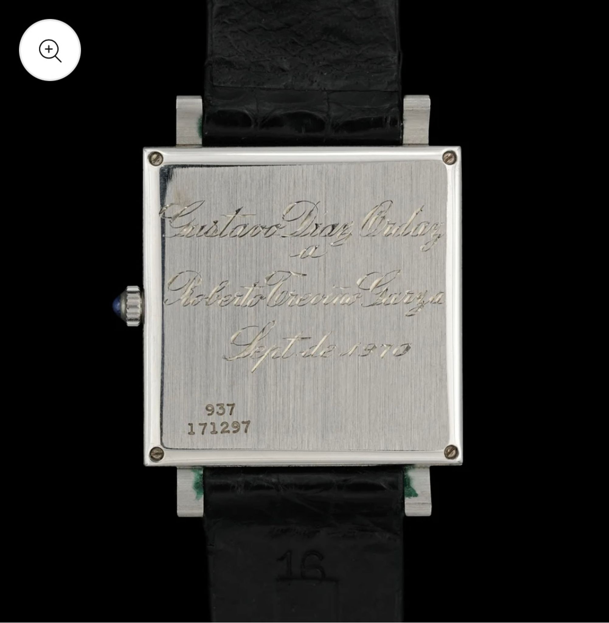 This exquisite square watch, adorned with a hobnail finish on the case and a black lacquered dial, boasts a caseback engraving that tells a tale steeped in history. The watch was presented by Gustavo Díaz Ordaz Bolaños, a distinguished Mexican lawyer and statesman who held the office of President of Mexico from December 1, 1964, to November 30, 1970. In a gesture of profound respect and admiration, Díaz Ordaz bestowed this remarkable Piaget timepiece upon Roberto Treviño Garza in September 1970, just months before concluding his presidential tenure. The engraving, rendered with impeccable hand-crafted calligraphy, not only commemorates a significant political alliance but also captures a moment of historical import. This watch stands as a testament to the legacy of a pivotal era in Mexican history.