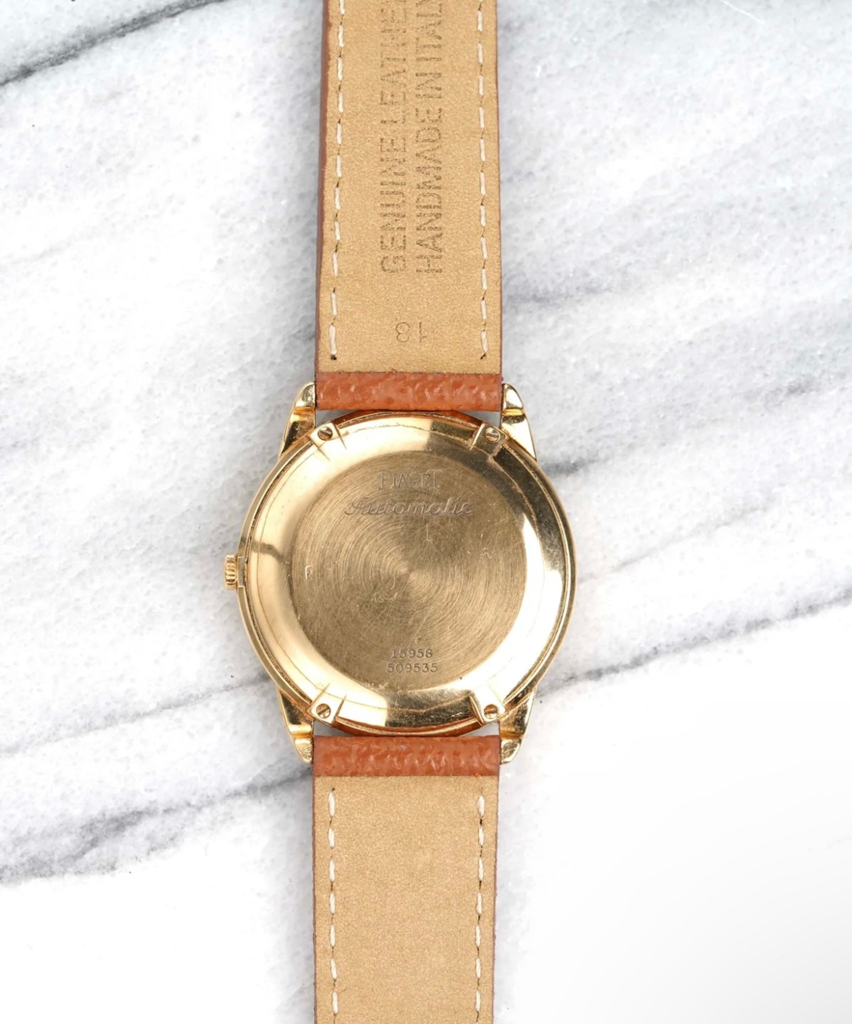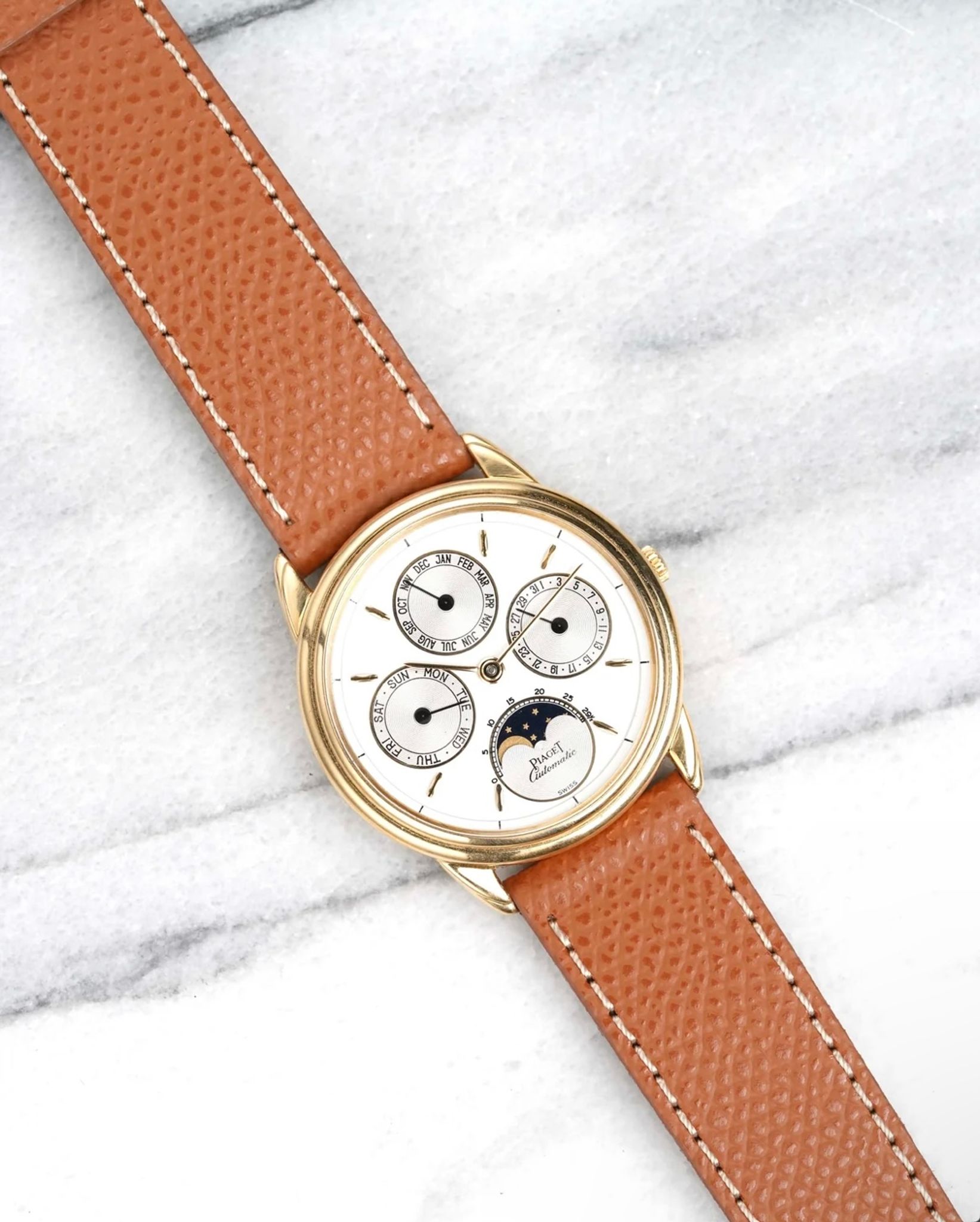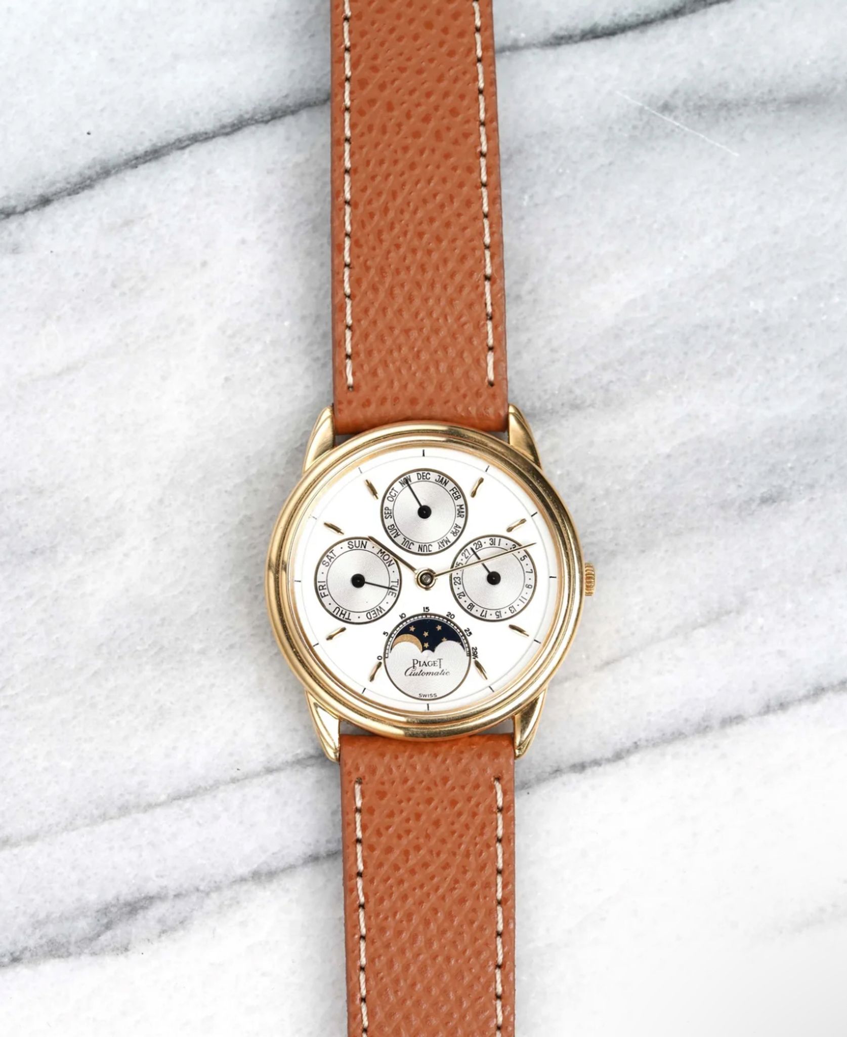 Here's a vintage Piaget reference number 15958 triple calendar moon phase in 18k yellow gold automatic from the late 1980s, early 1990s. Keeps great time and is fully functional. Measurements include a 34mm case size and 18mm lug width. On an aftermarket brown pebble textured leather strap (Made in Italy) with its signed gold buckle. White dial. Gold stick hands and Roman numerals. The month indicator is at 12 a clock, the day is at 9 a clock and the date is at 3 a clock. Moon phase indicator at 3 a clock. 18k yellow gold case and caseback. Hard to find these examples. All other parts are original including the signed caseback, dial, and movement. Both the dial and case are in great cosmetic, untouched condition.