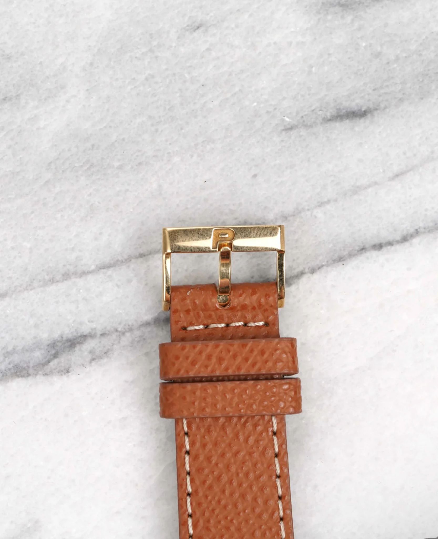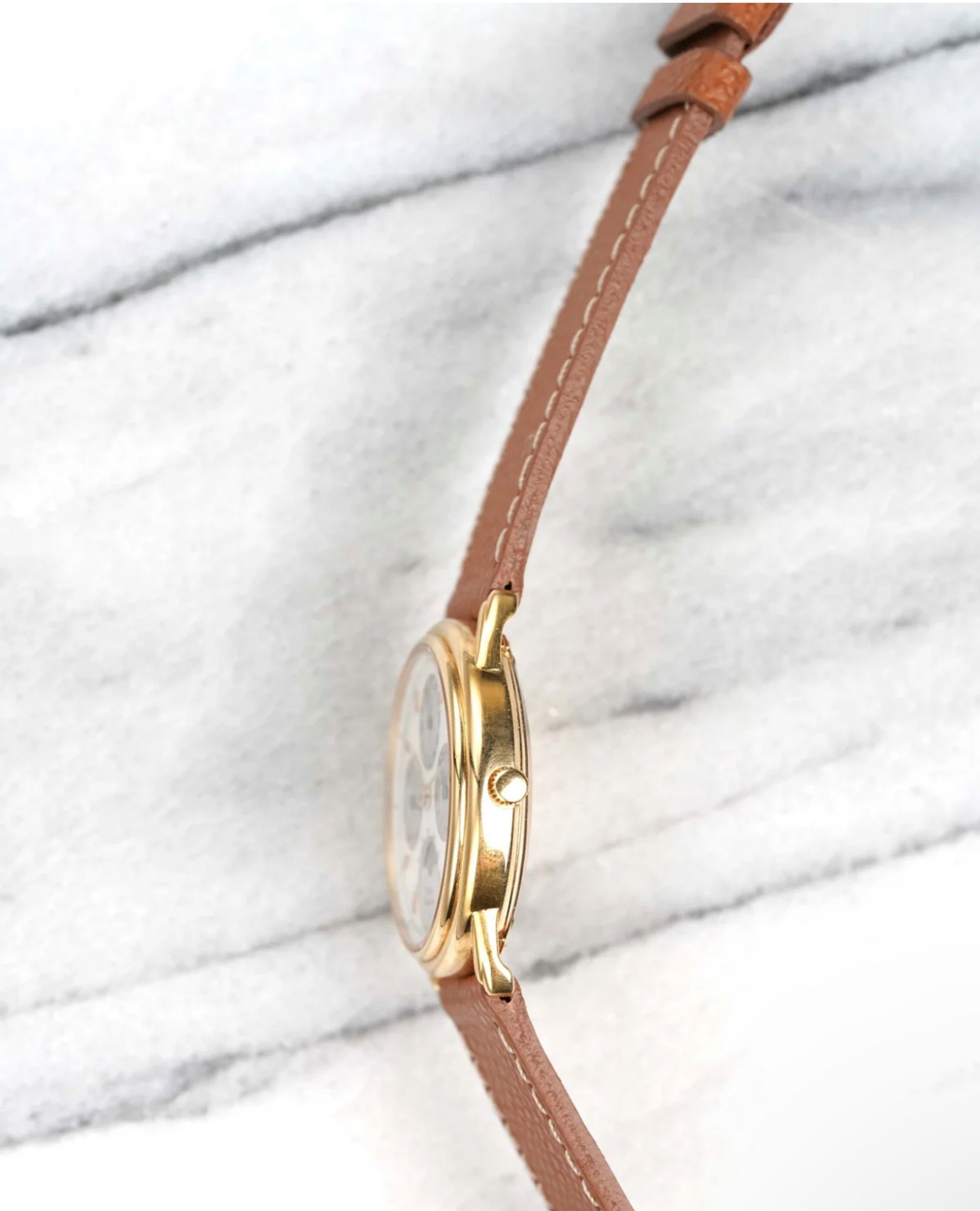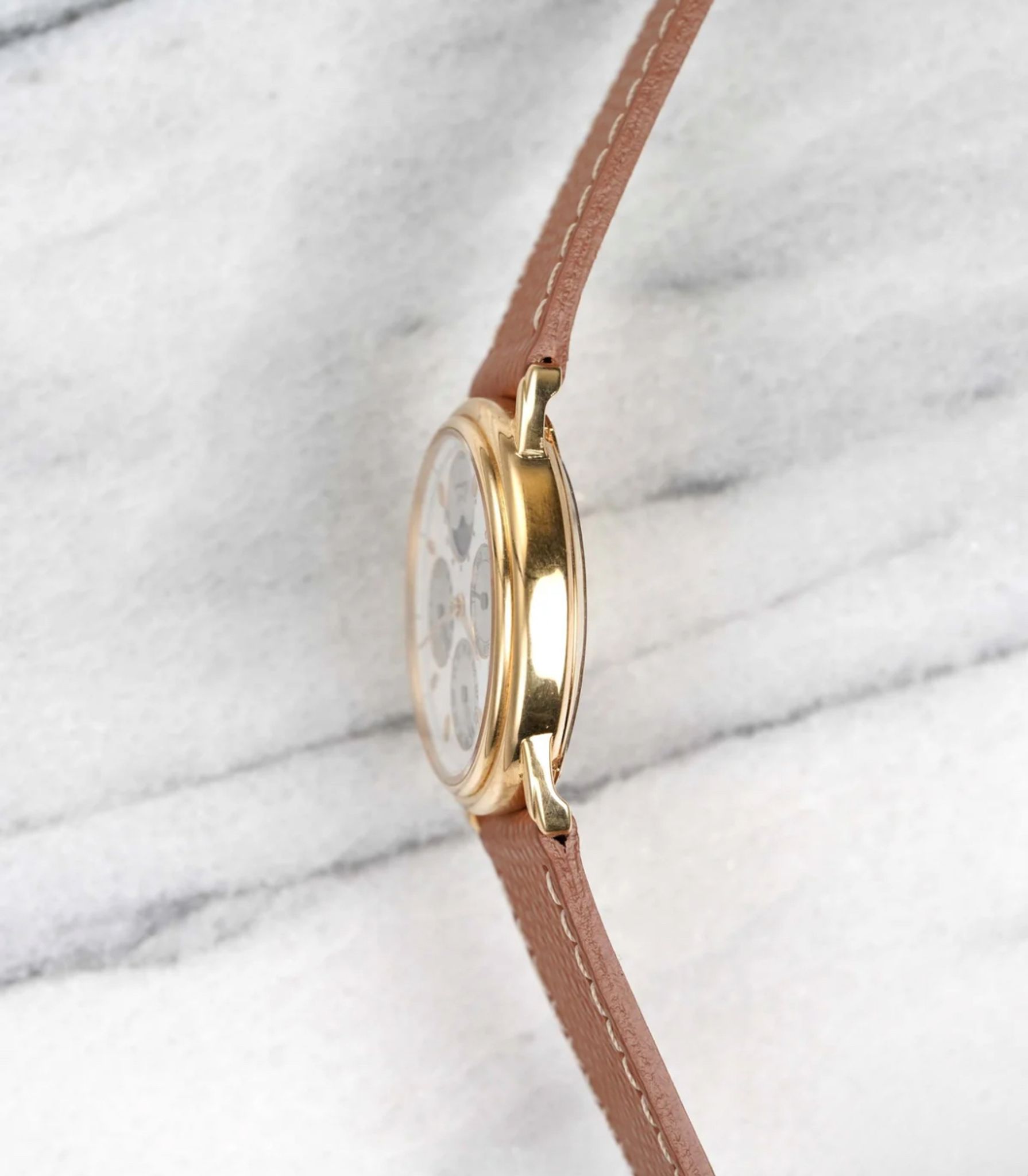 Here's a vintage Piaget reference number 15958 triple calendar moon phase in 18k yellow gold automatic from the late 1980s, early 1990s. Keeps great time and is fully functional. Measurements include a 34mm case size and 18mm lug width. On an aftermarket brown pebble textured leather strap (Made in Italy) with its signed gold buckle. White dial. Gold stick hands and Roman numerals. The month indicator is at 12 a clock, the day is at 9 a clock and the date is at 3 a clock. Moon phase indicator at 3 a clock. 18k yellow gold case and caseback. Hard to find these examples. All other parts are original including the signed caseback, dial, and movement. Both the dial and case are in great cosmetic, untouched condition.