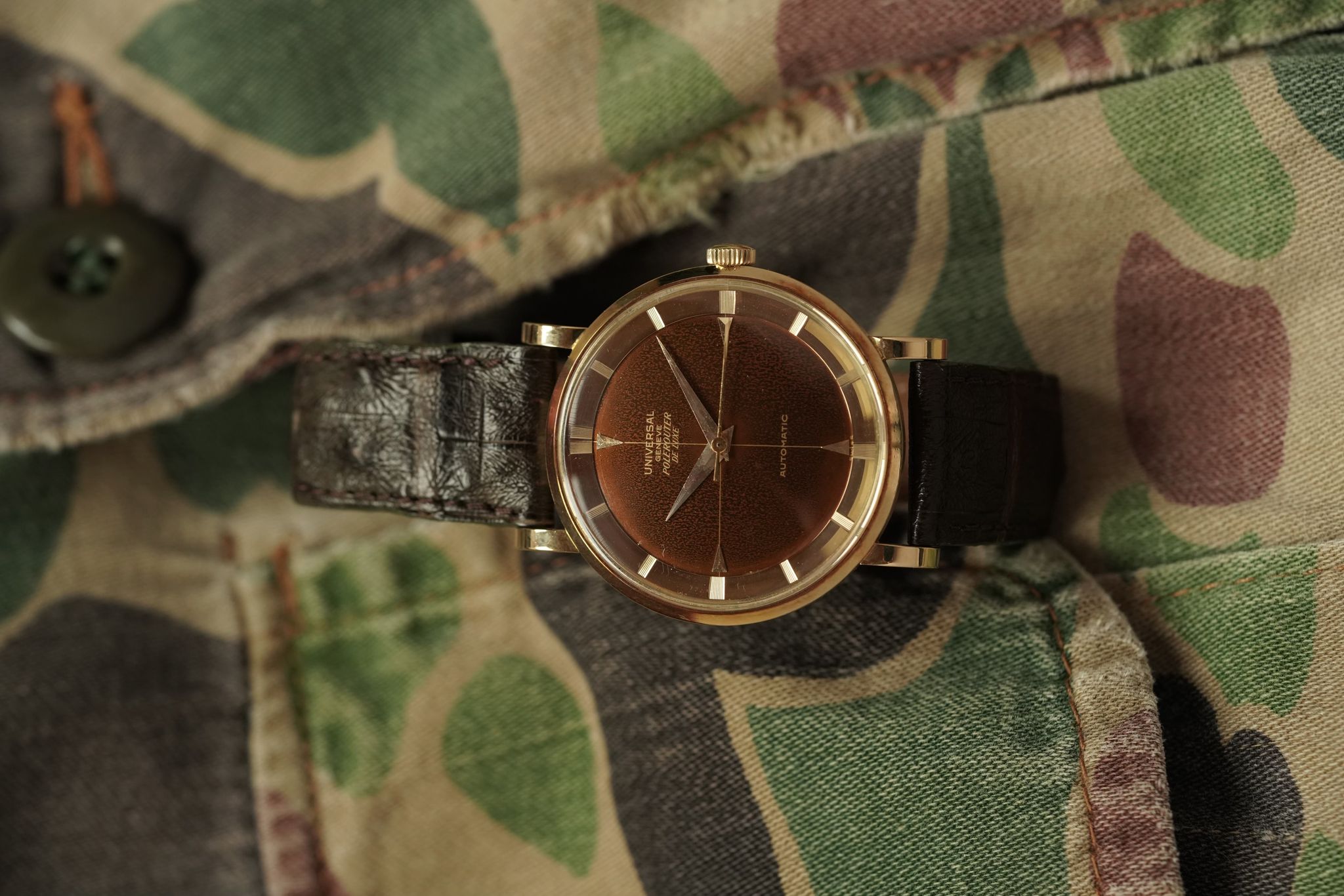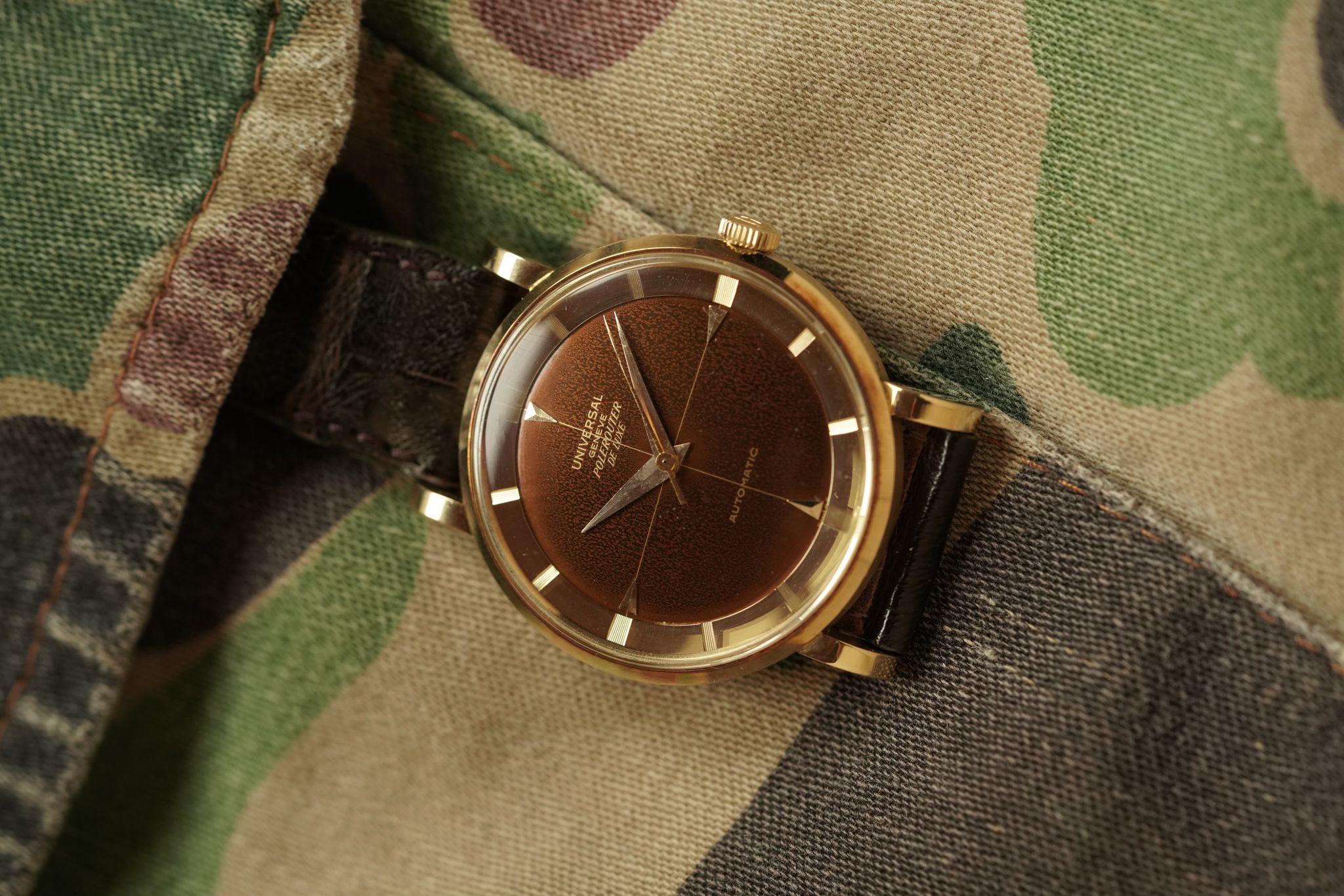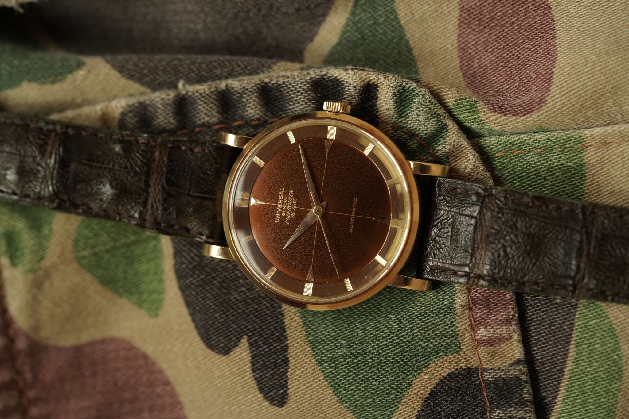 The absolute best example of the Polerouter DeLuxe ref. 10234-3 we have ever seen or found. A superb 18k yellow gold screw back case, original crown, non-luminous hands and the craziest, most tropically insane leopard brown dial ever.