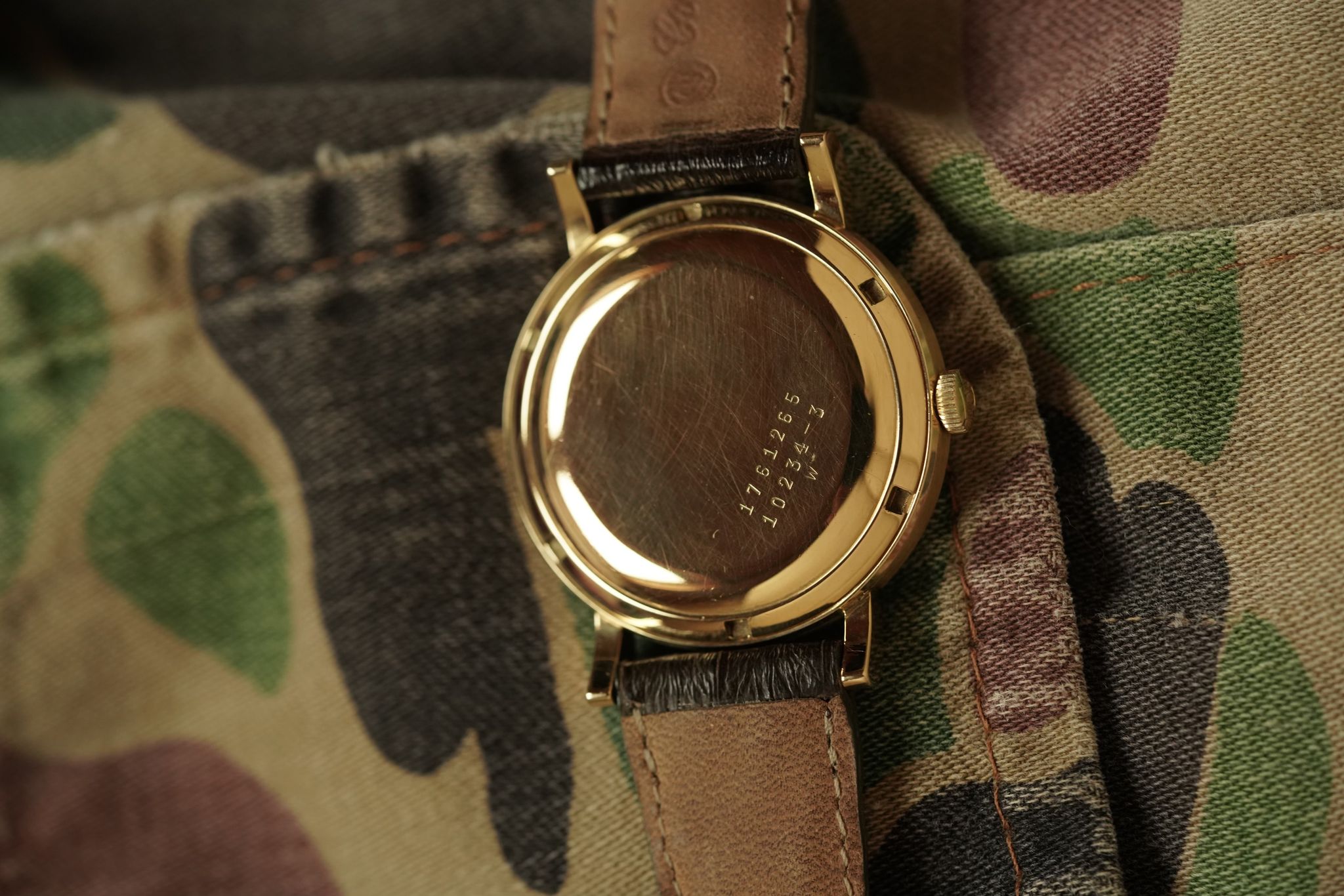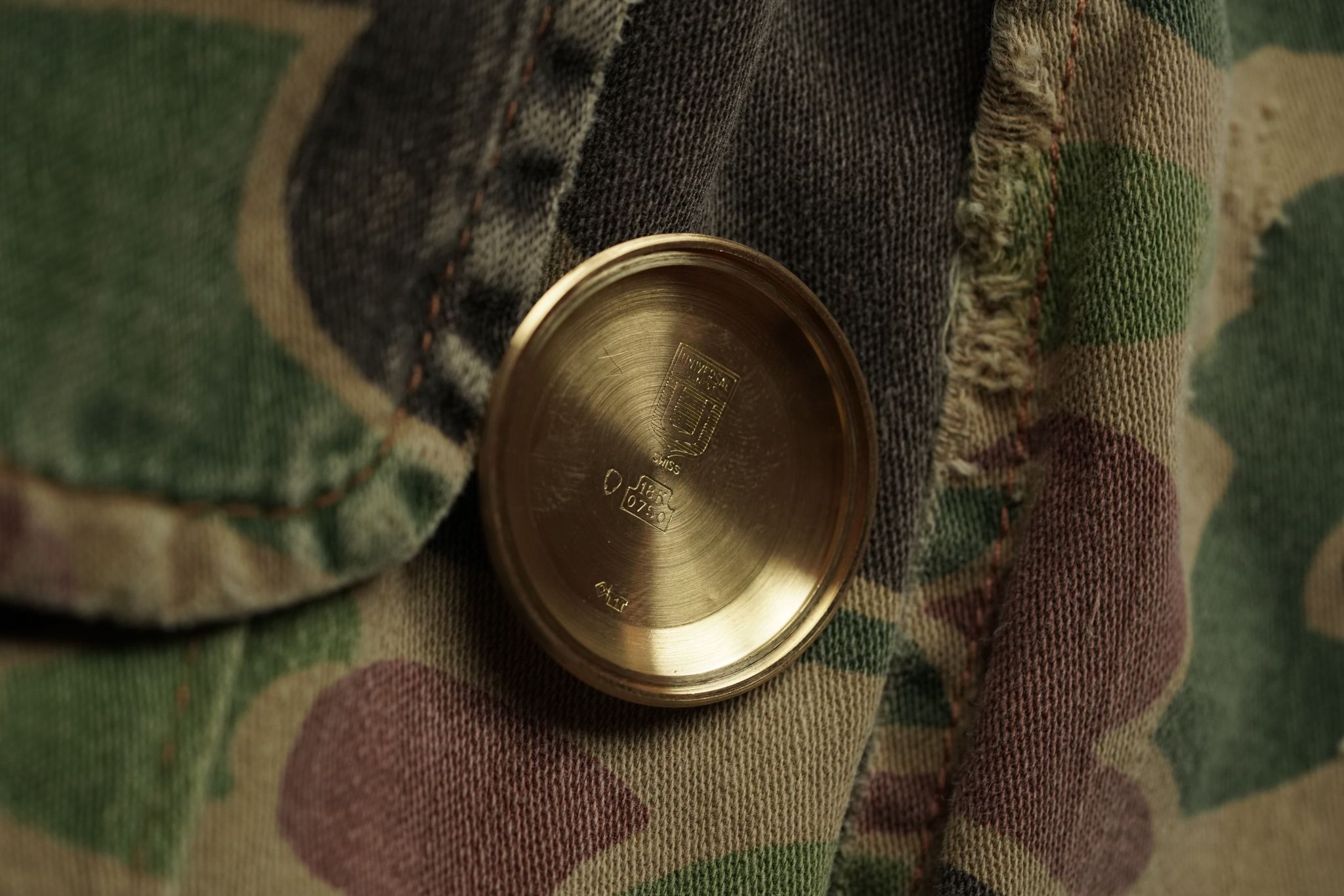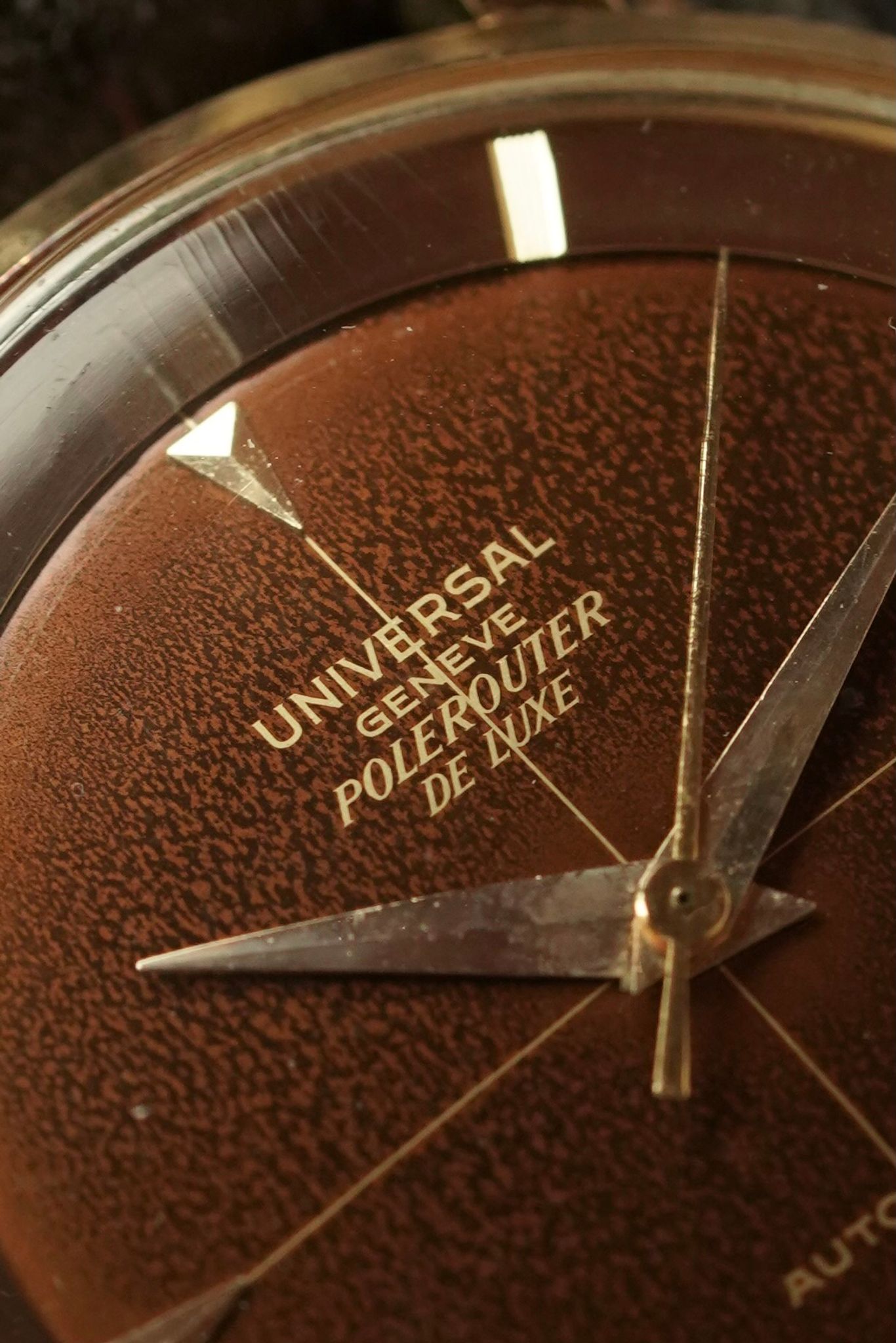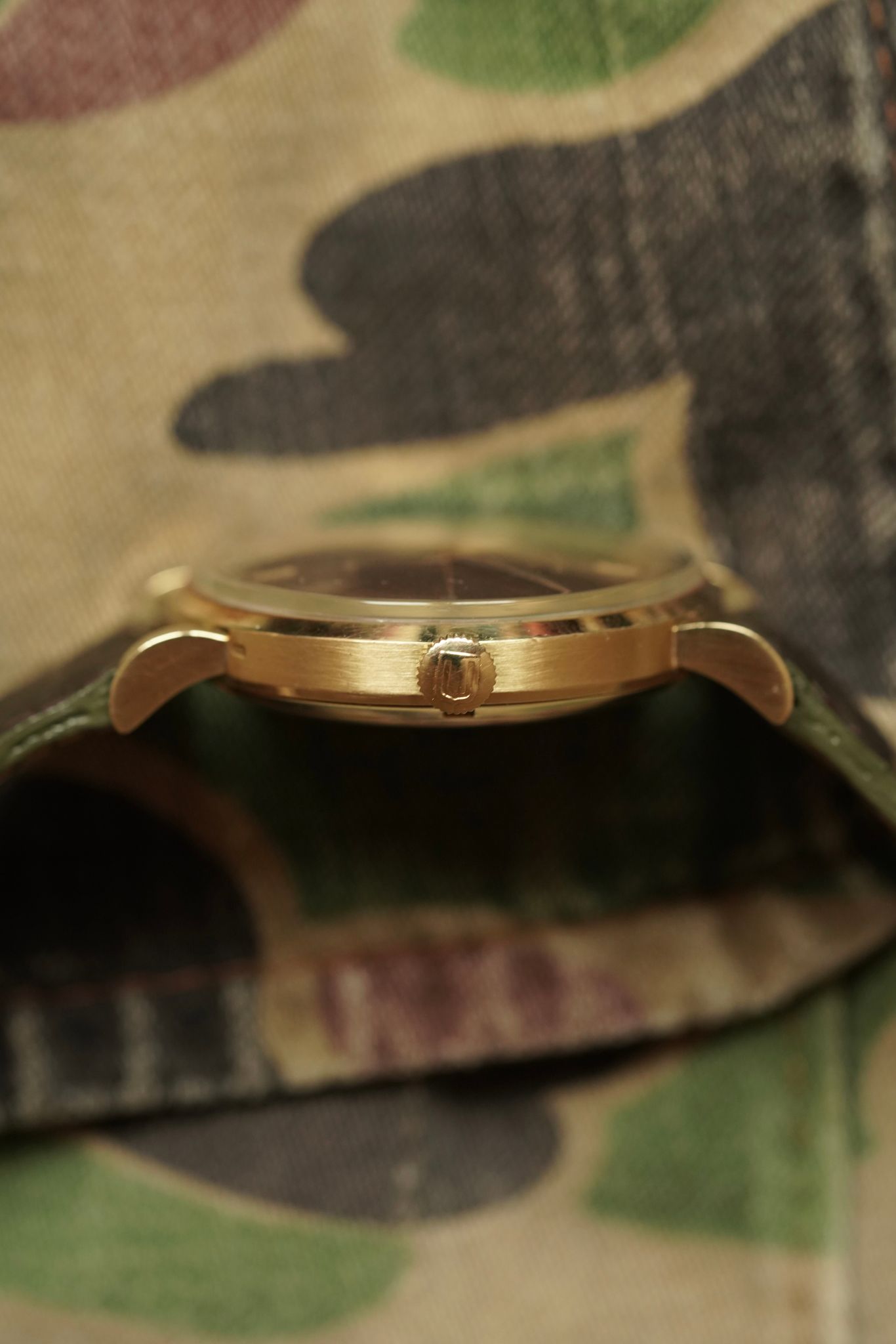 The absolute best example of the Polerouter DeLuxe ref. 10234-3 we have ever seen or found. A superb 18k yellow gold screw back case, original crown, non-luminous hands and the craziest, most tropically insane leopard brown dial ever.