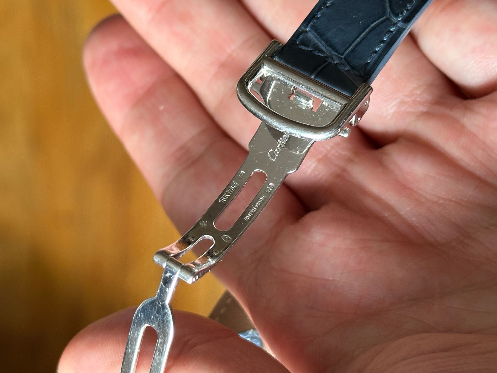 Reference 1575 Ultra-thin 1990s Pre-CPCP collection platinum Santos Dumont in classic men’s size. Correct white gold Cartier deployant buckle on beautiful ABP Paris leather strap. Classic FP21 ultra thin movement. See photos for condition and DM any additional questions.