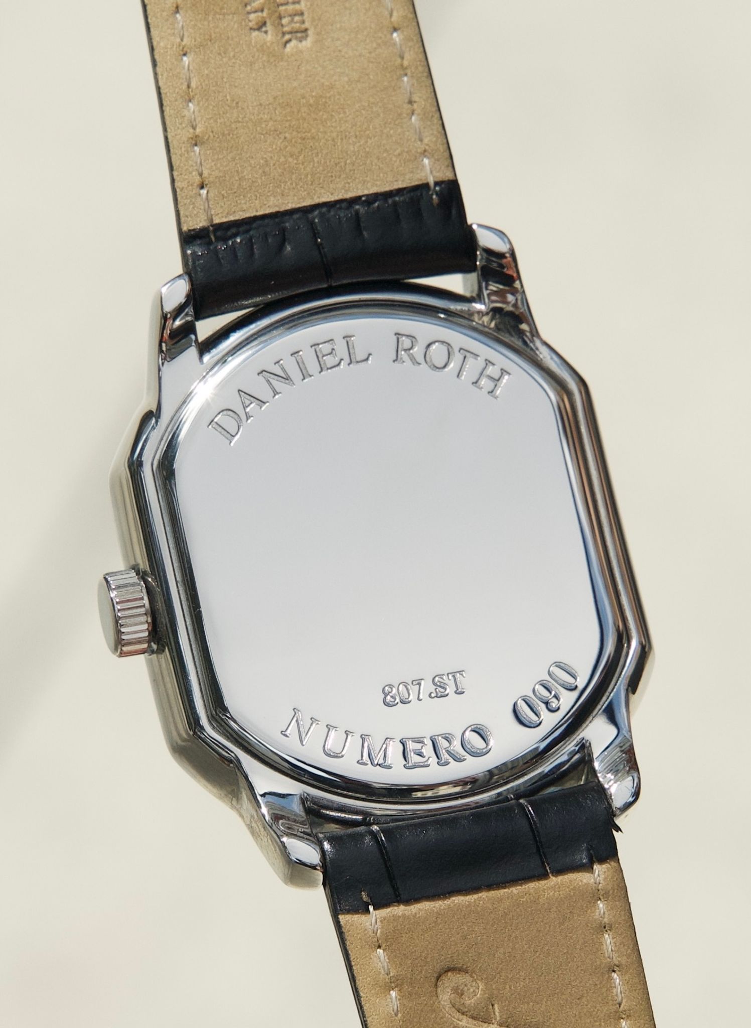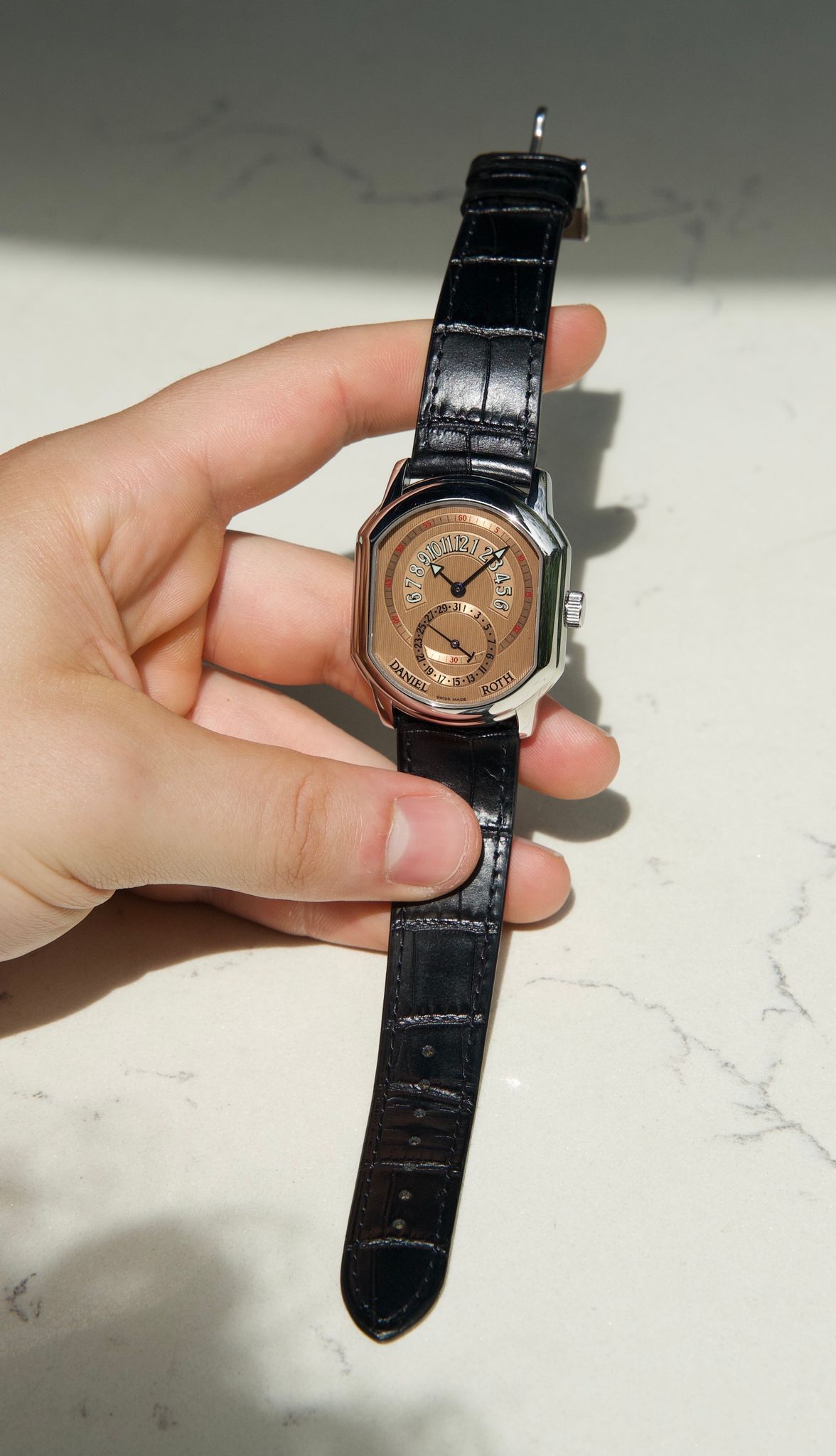 The Daniel Roth Reference 807.ST is a well-crafted, understated watch from the late 1990s to early 2000s. It features a unique double-ellipse stainless steel case and a clean guilloché dial with a retrograde hour display and date sub-dial. Powered by the reliable automatic DR700/10 movement (based on a Lemania caliber), it combines thoughtful design with solid mechanics making it a quiet favorite among collectors who appreciate independent watchmaking.