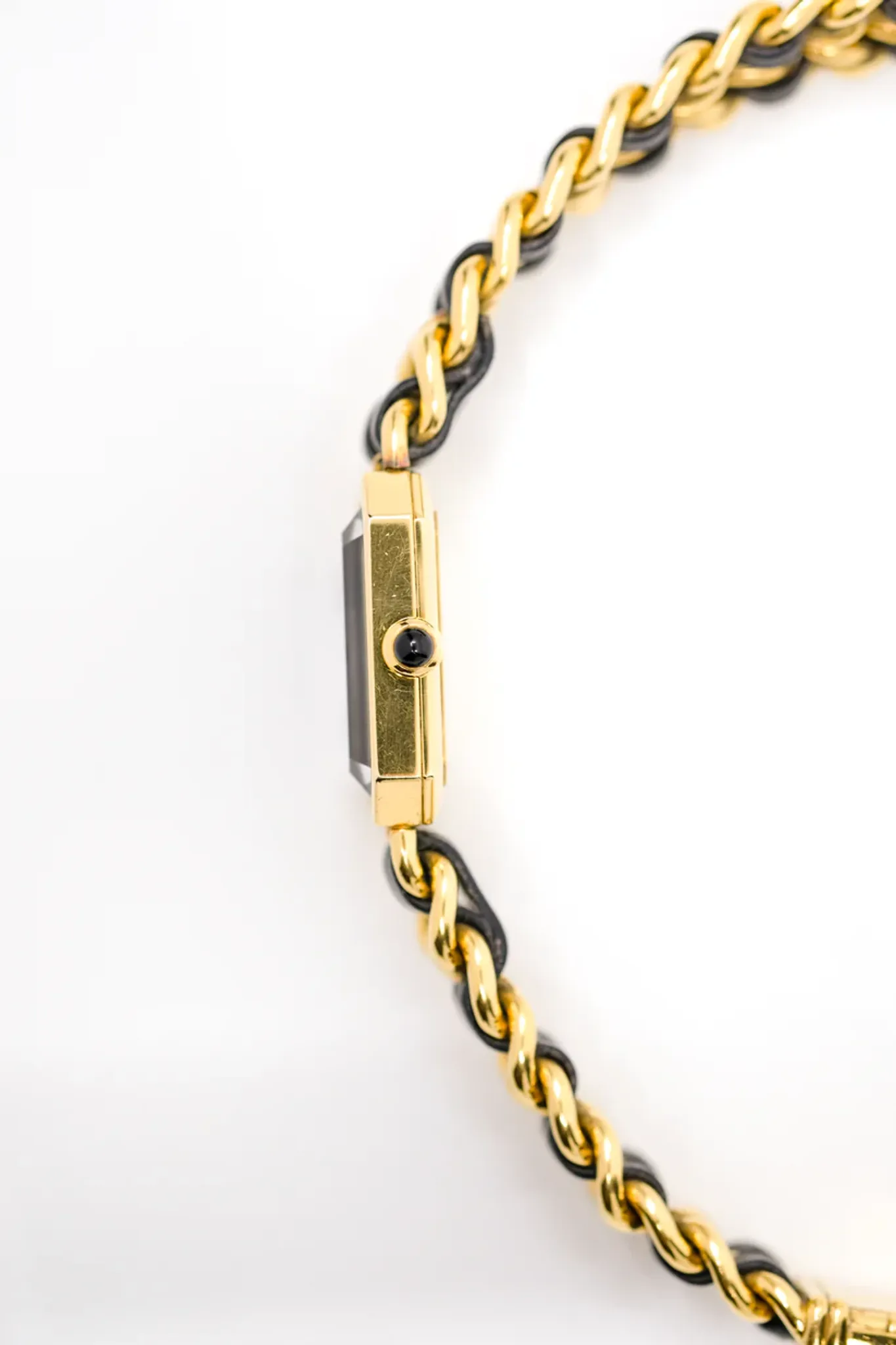 The Chanel Première is a real jewel on the wrist, especially in this gold-plated version. The best-known version would surely be this model on a mesh and leather bracelet, designated as the “Iconic Chain” by Chanel. A play of lines and curves between the case and the bracelet whose rounded links, mixed with the leather strap, break with the frank features of the watch. The gold-plated case and mesh give the model a fairly elegant and dressy look, even if the leather breaks the codes with its rock side.