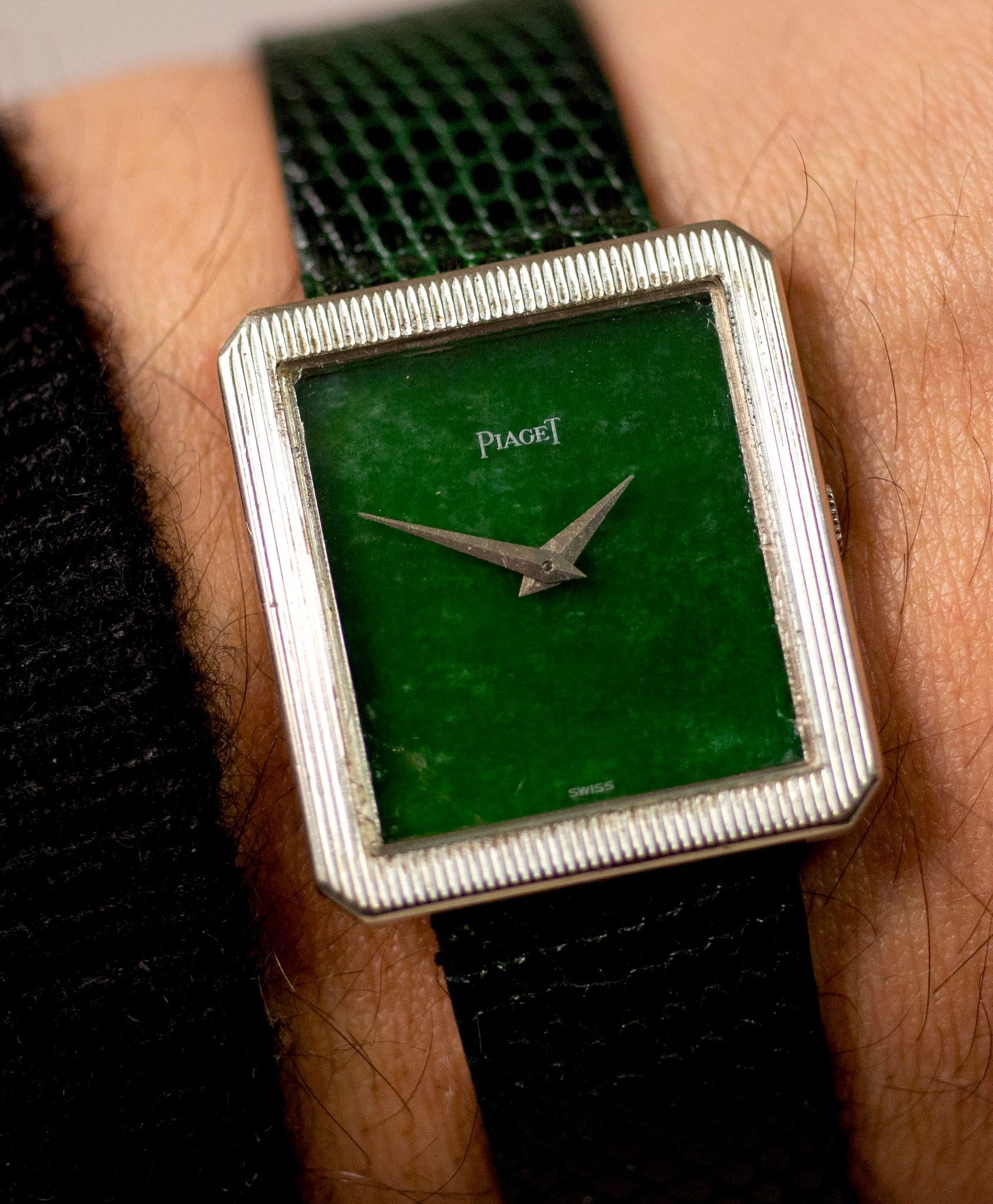 This is an incredible Piaget Protocole Ref. 9154. This example has a rare Jade dial that is rich and dynamic. It is well preserved with a small hairline visible at loupe level on the bottom left corner and small crystal scratches. The case measures 25x27mm and is textured white gold. It’s truly a fantastic watch on the wrist!