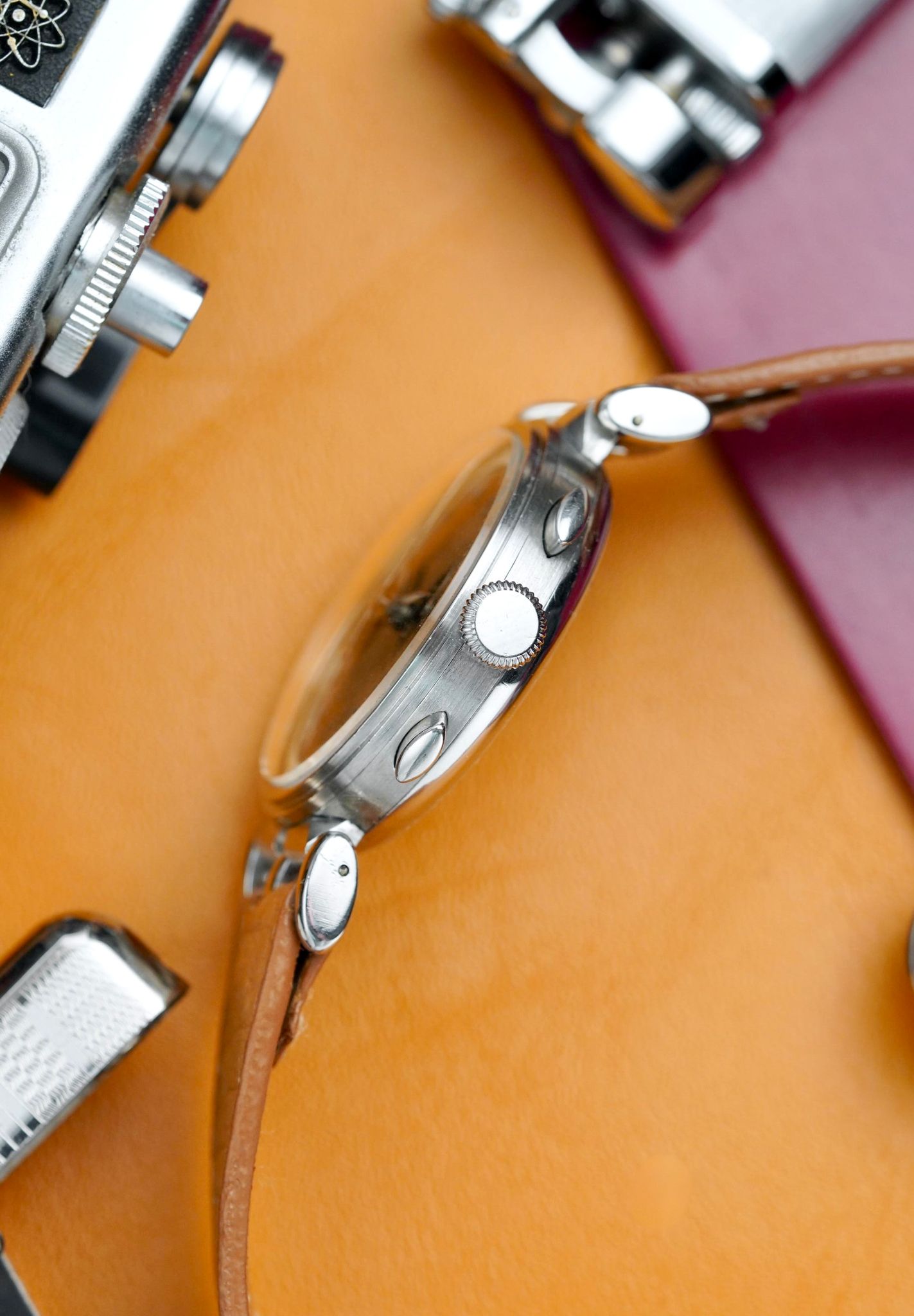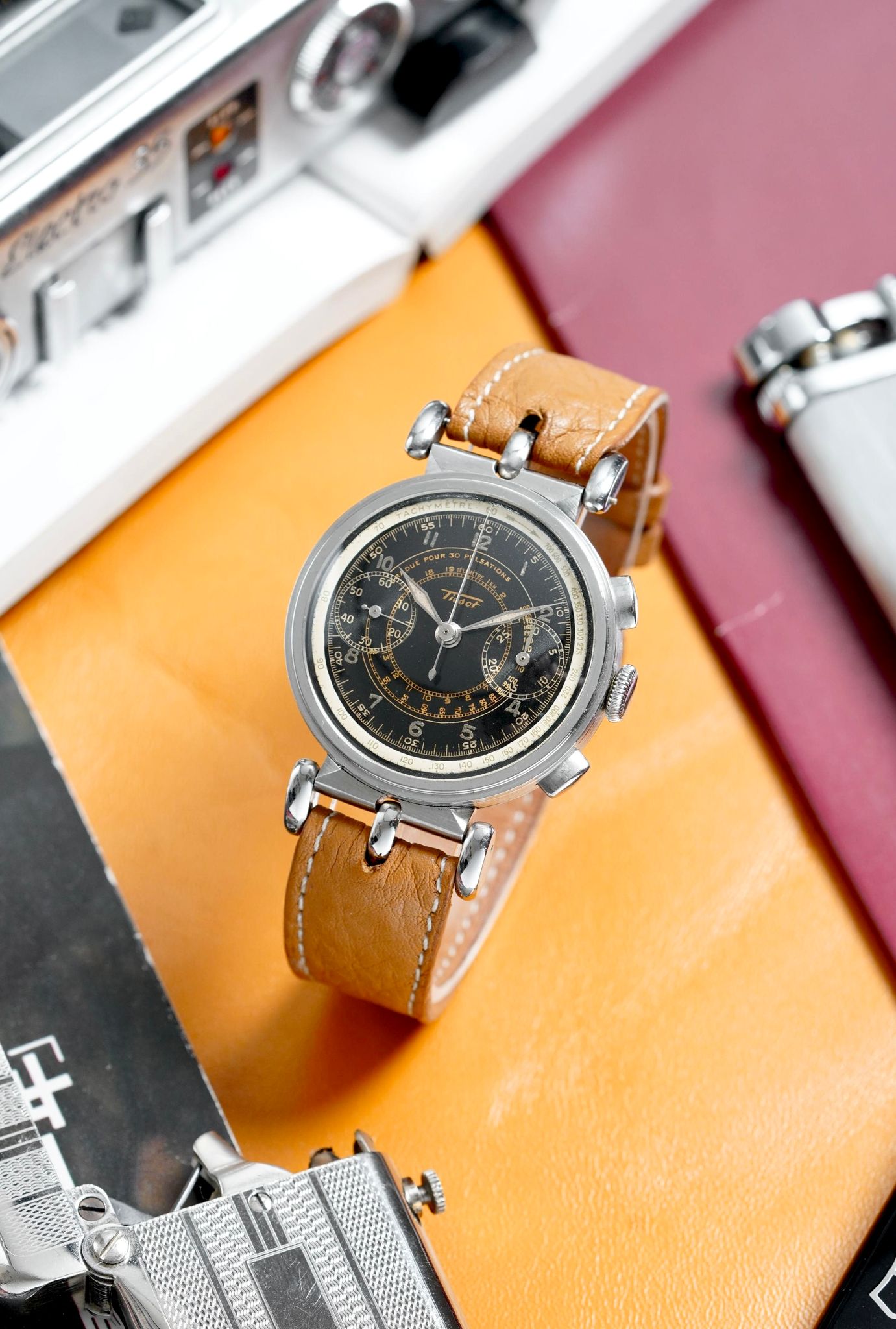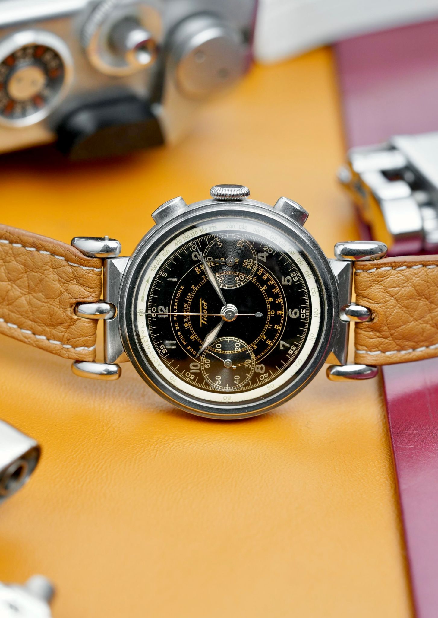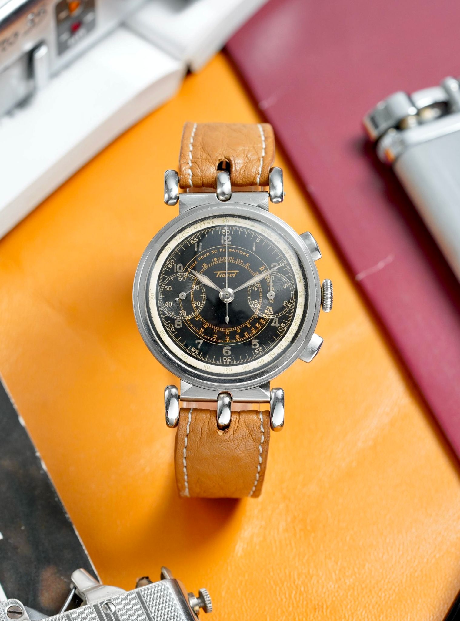 A phenomenal and exceedingly rare 1940s Tissot Chronograph armed with the famous and hard to find caliber 33.3, in immaculate condition, a gilt dial pleasingly laid out with enamel Tachemetre scale, Telemeter and Pulsations scales, as well as all of its original strontium 90 lume in tact, all housed witnin an unpolished 38mm stepped steel case with unique articulating lugs.