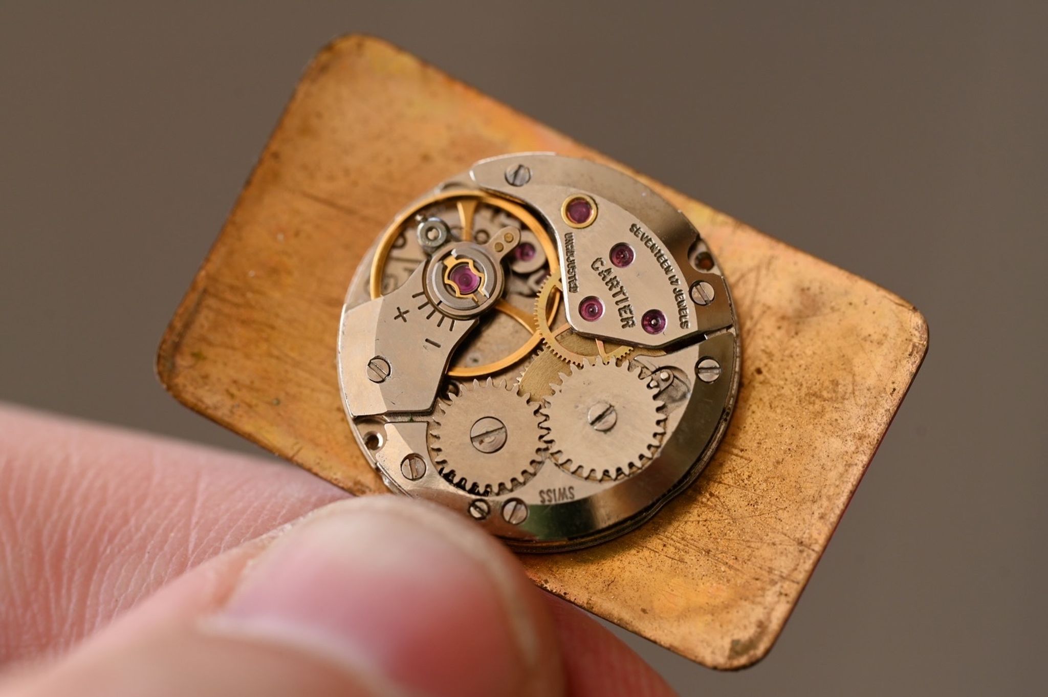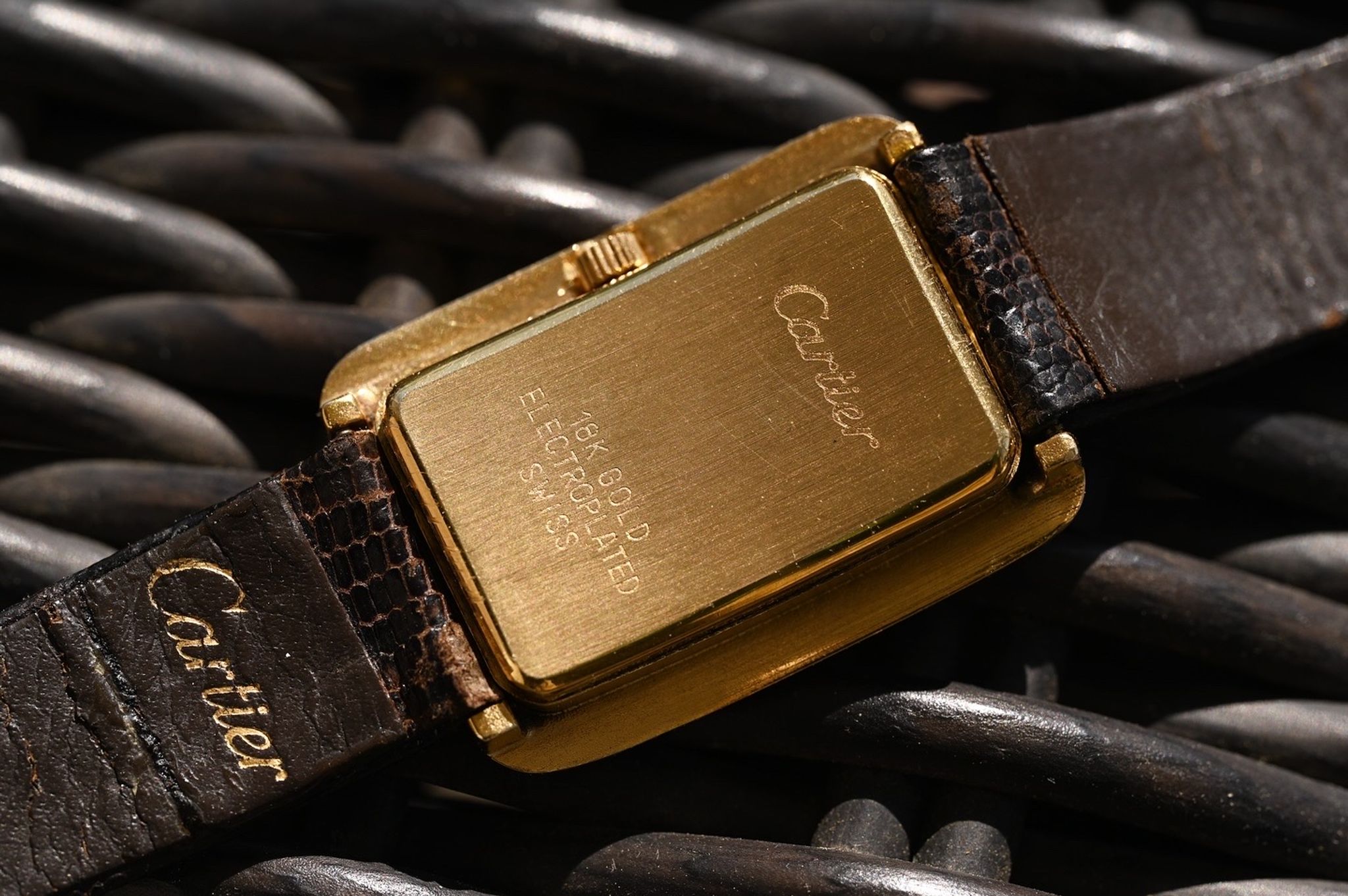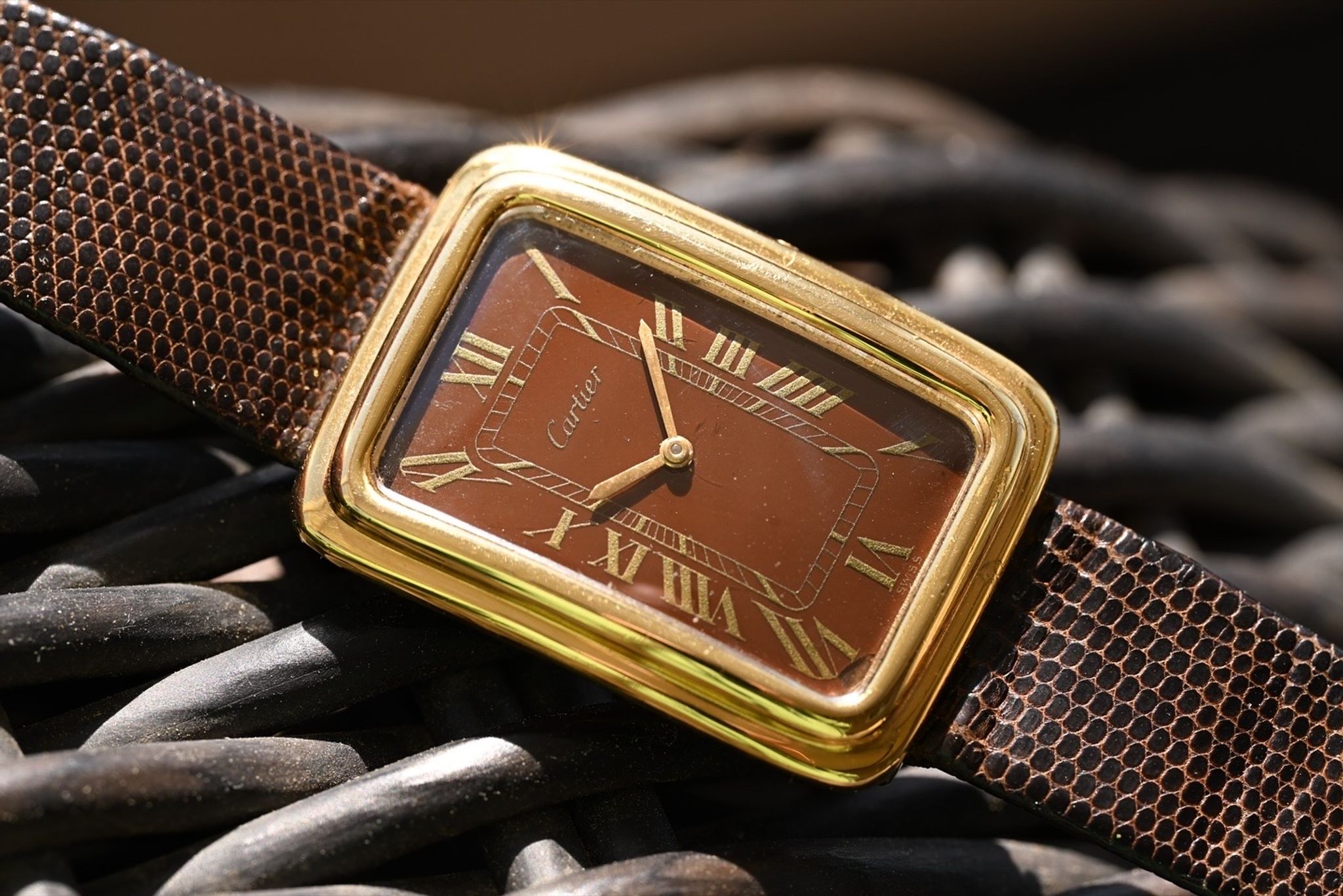 A rare Cartier jumbo stepped tank watch with glossy brown dial produced for a short period in the mid 1970s. Featuring a large 18k electroplated case measuring 27x37mm and powered by a manually wound Cartier 78-1 movement. This watch comes with both its original strap and buckle as well as an updated strap and buckle to be worn and enjoyed.