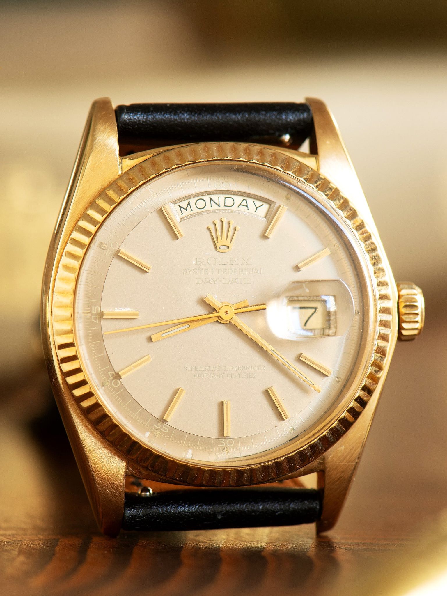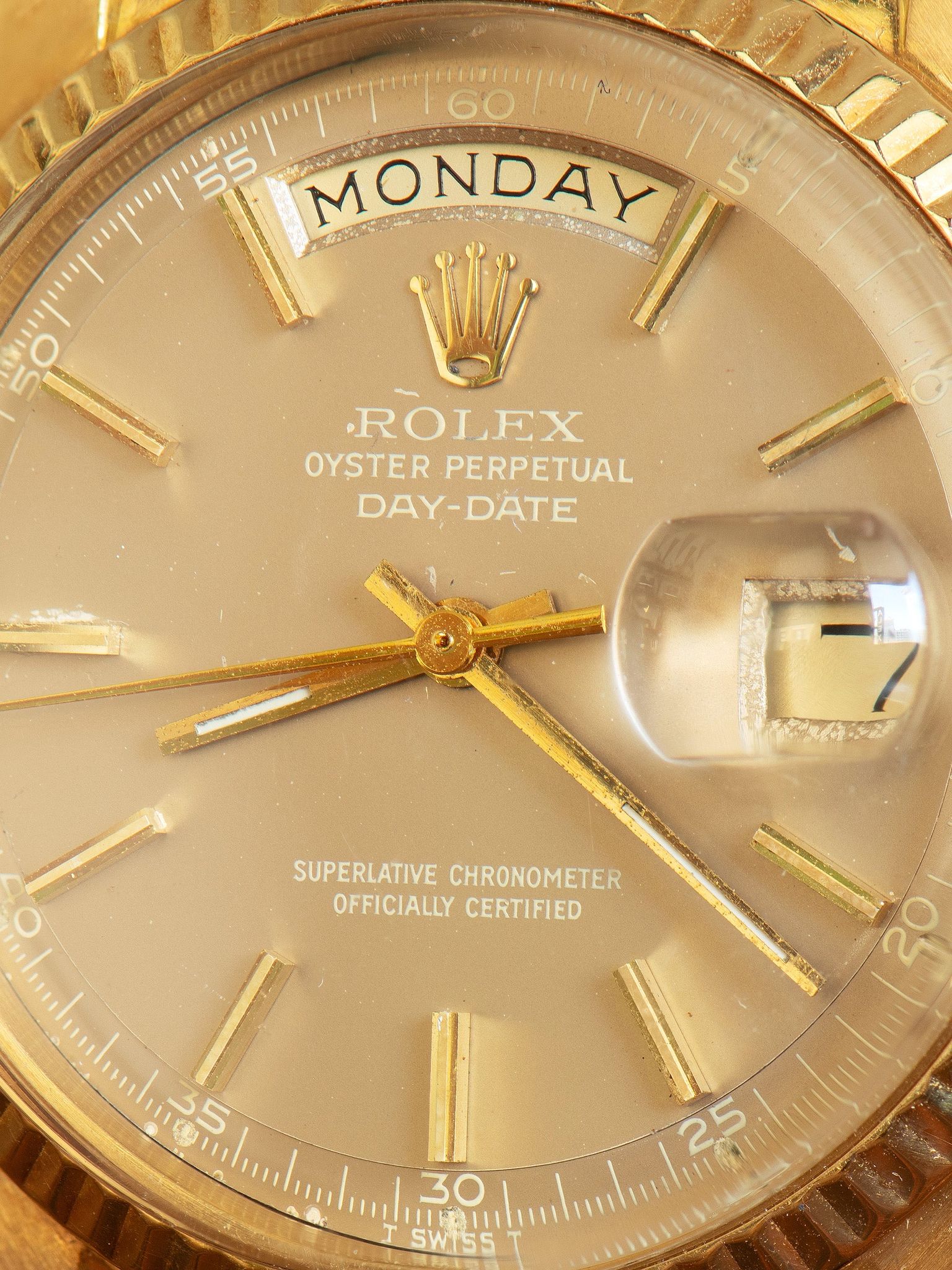 This 1973 Rolex Day-Date ref. 1803 retains its original and sought-after satin taupe, "Havana" minute track dial, which features a beautiful "ghost" effect with the dial. The "Ghost" dial phenomenon is one of the most unique and celebrated dial variants that exist within the Rolex dress models. Depending on the lighting conditions, the tonal printing of the text can disappear into the dial completely or be vividly contrasted against the dial, hence the "ghost" nickname. These dials can be seen in several dial configurations though the most common are grey and taupe dials from the plastic crystal era of Rolex 34mm and 36mm dress models.