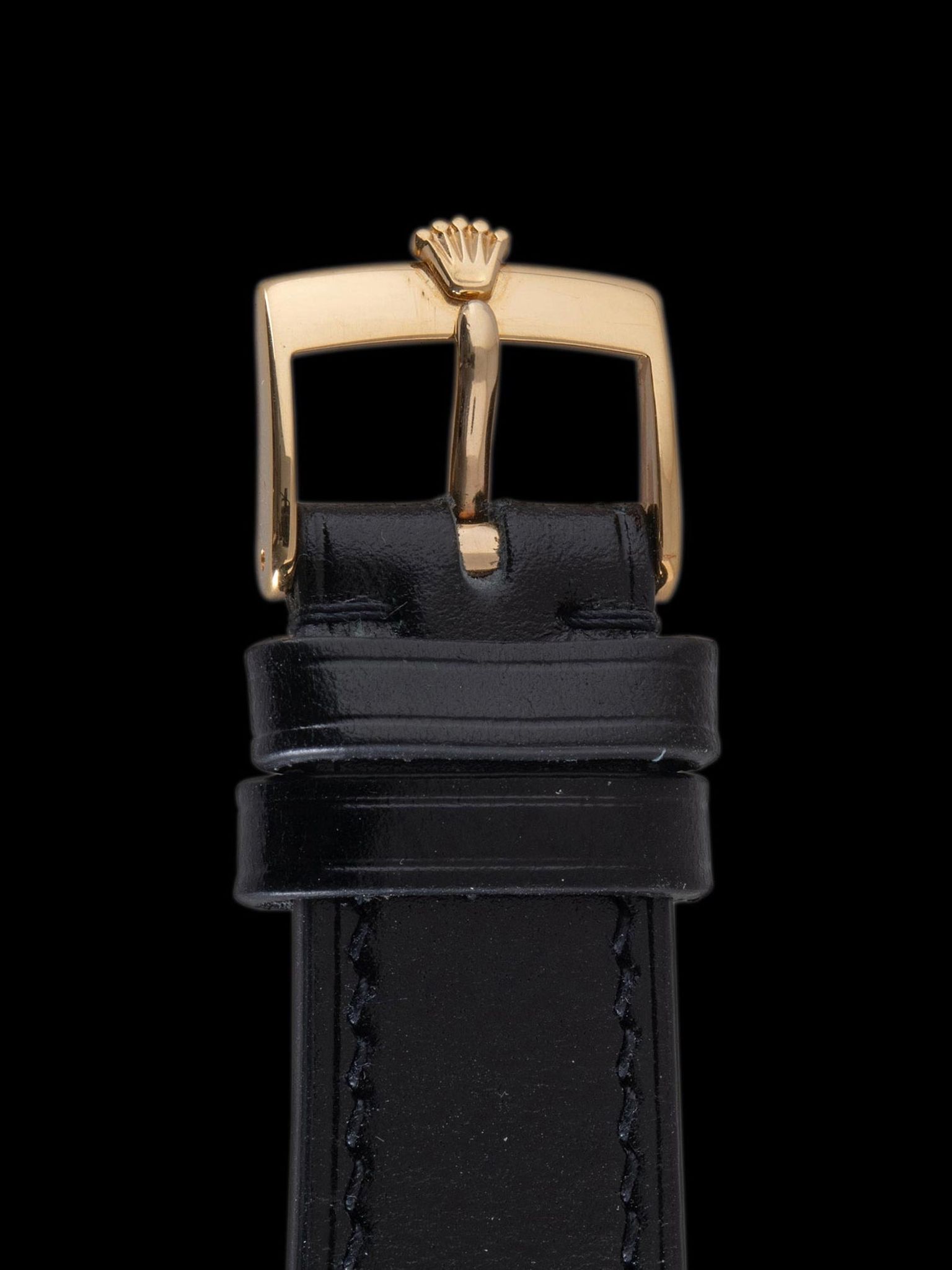 The excellent 18K yellow gold case retains thick and even lugs that show light elements of gentle use and minimal evidence of previous polishing. The 18K yellow gold flute bezel has been previously light polishing and is in wonderful overall condition with minor wear present. The watch comes supplied on a 2pc handmade leather strap with a Rolex gold plaque tang buckle.