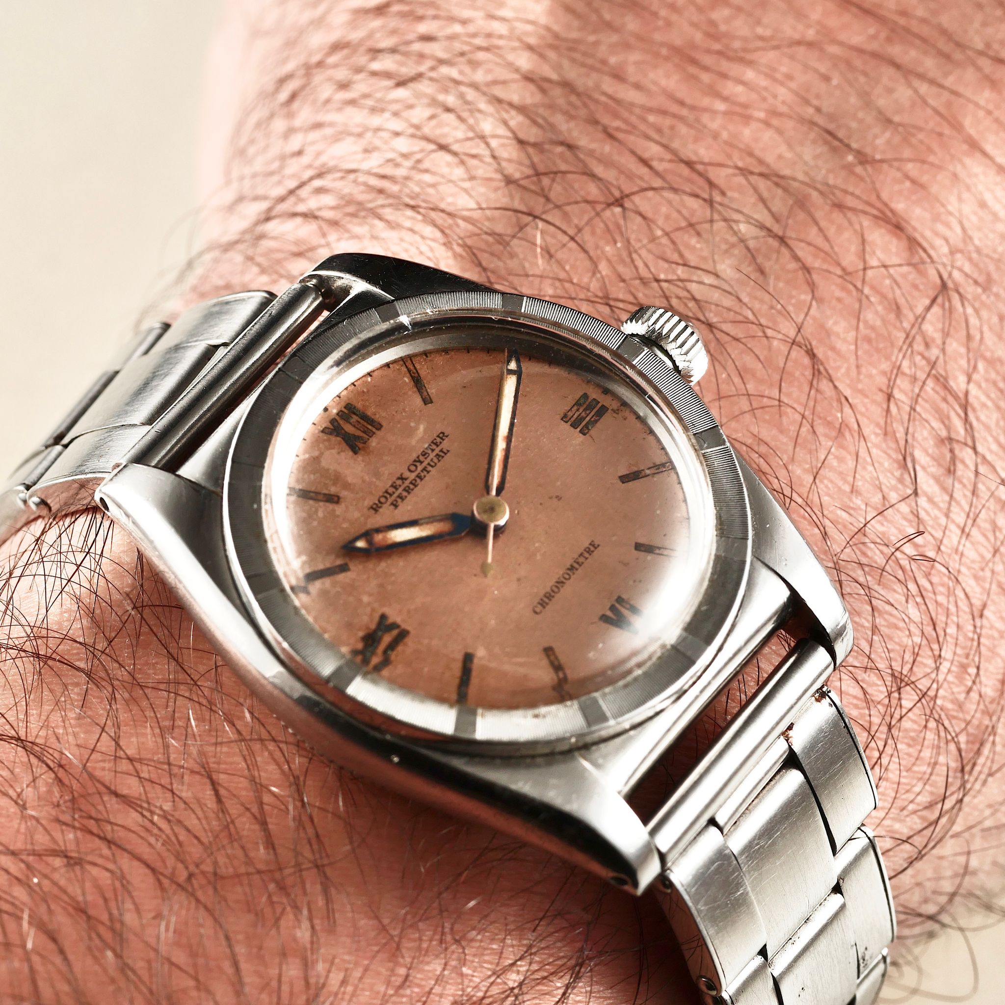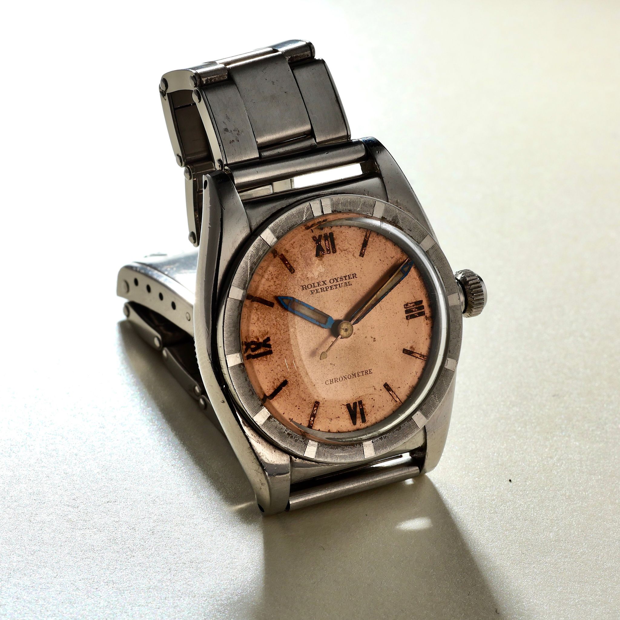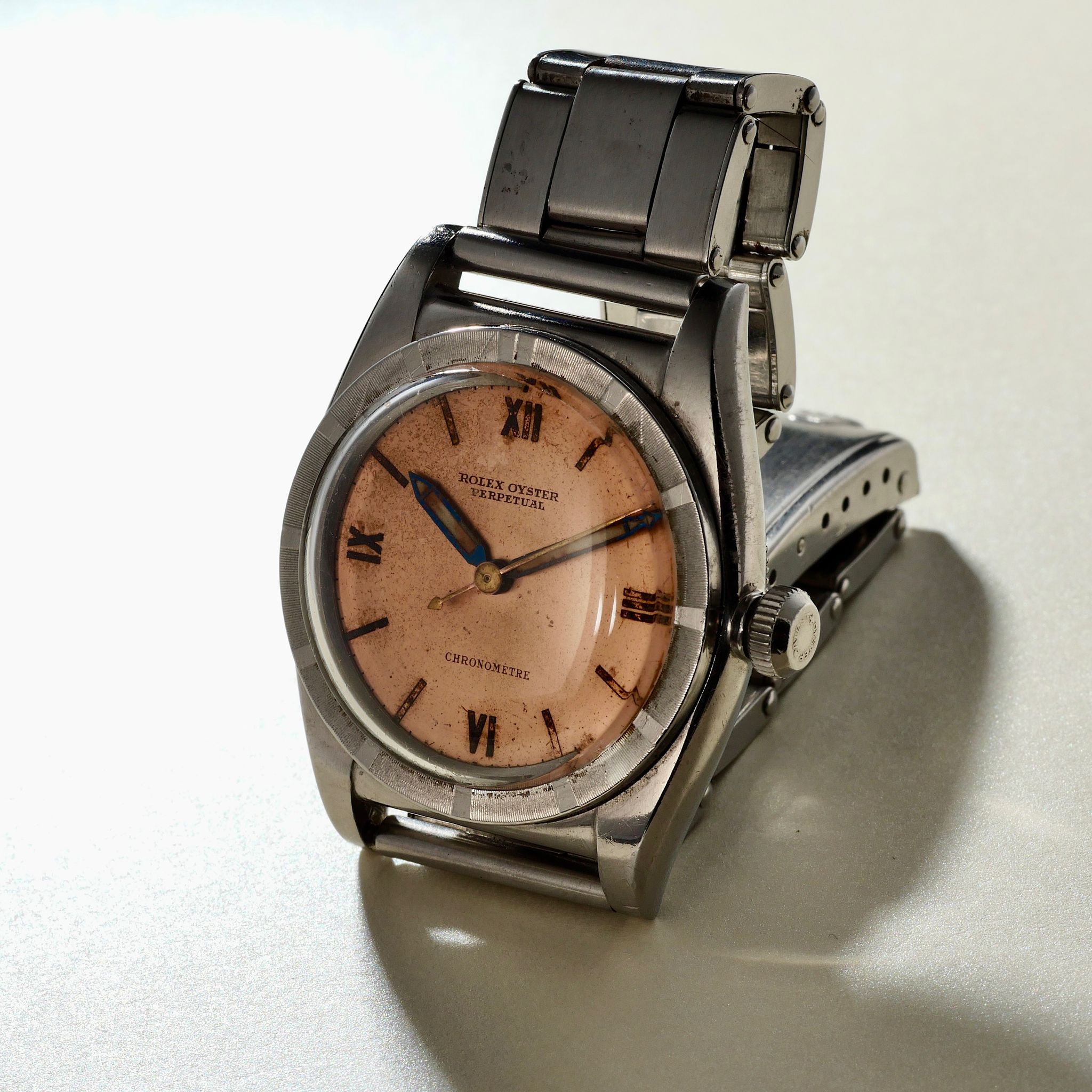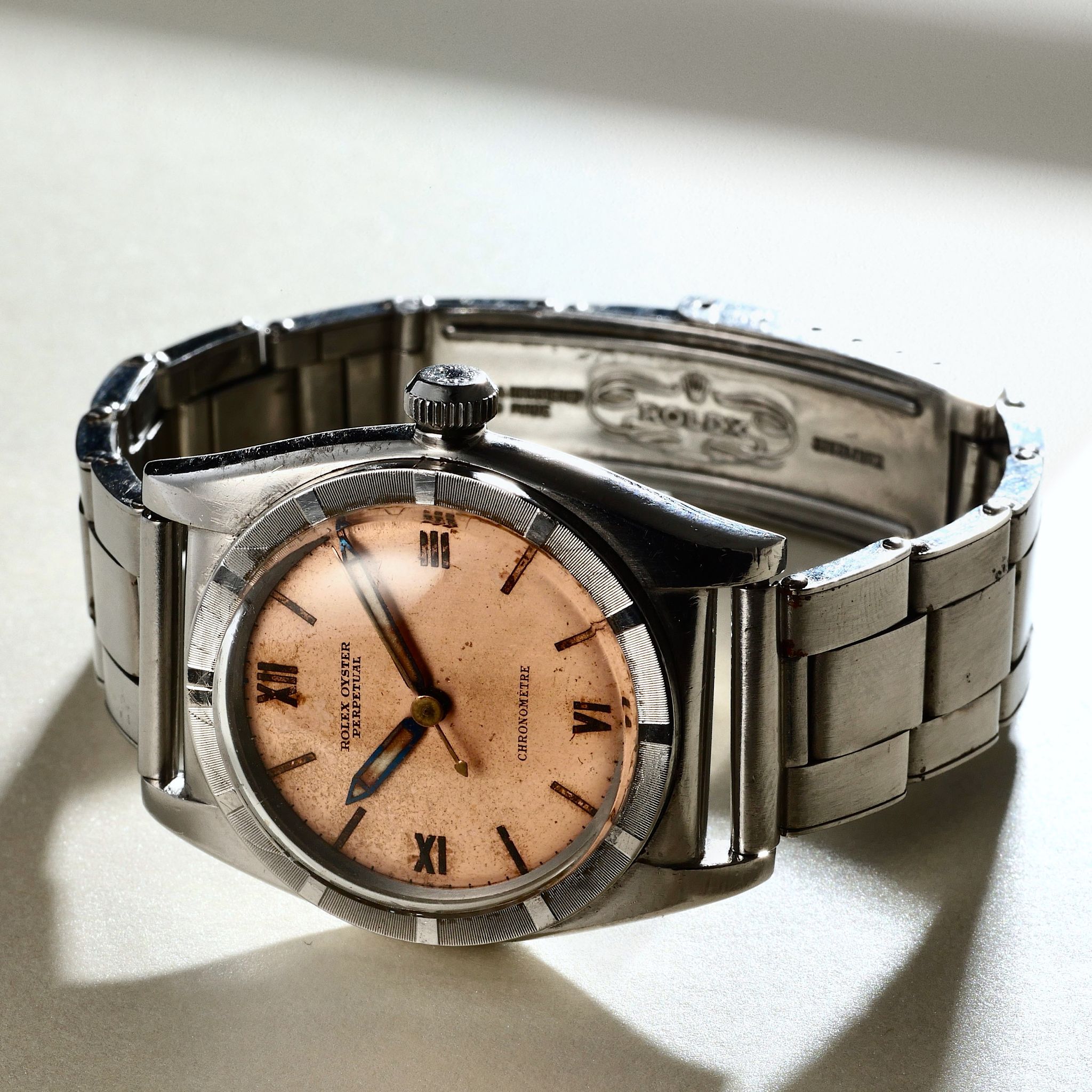 SPECIFICATIONS: Stainless Steel Case, Original Rolex Salmon Dial, Original Rolex Riveted Bracelet, Fine and Rare