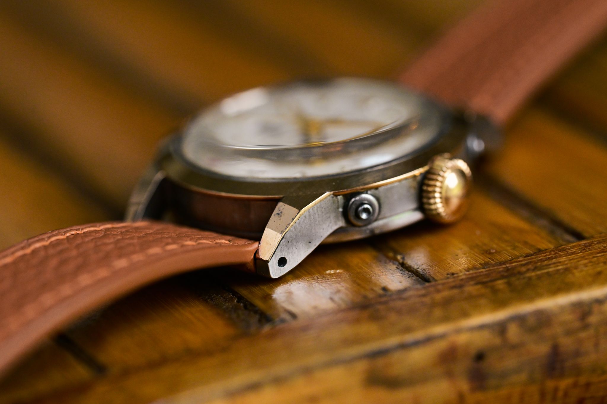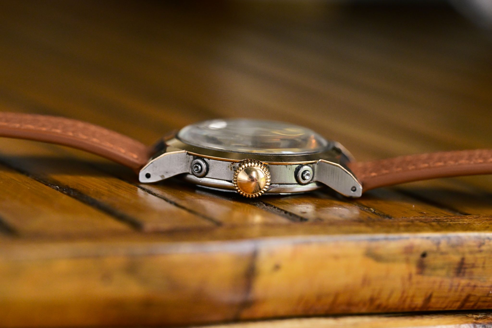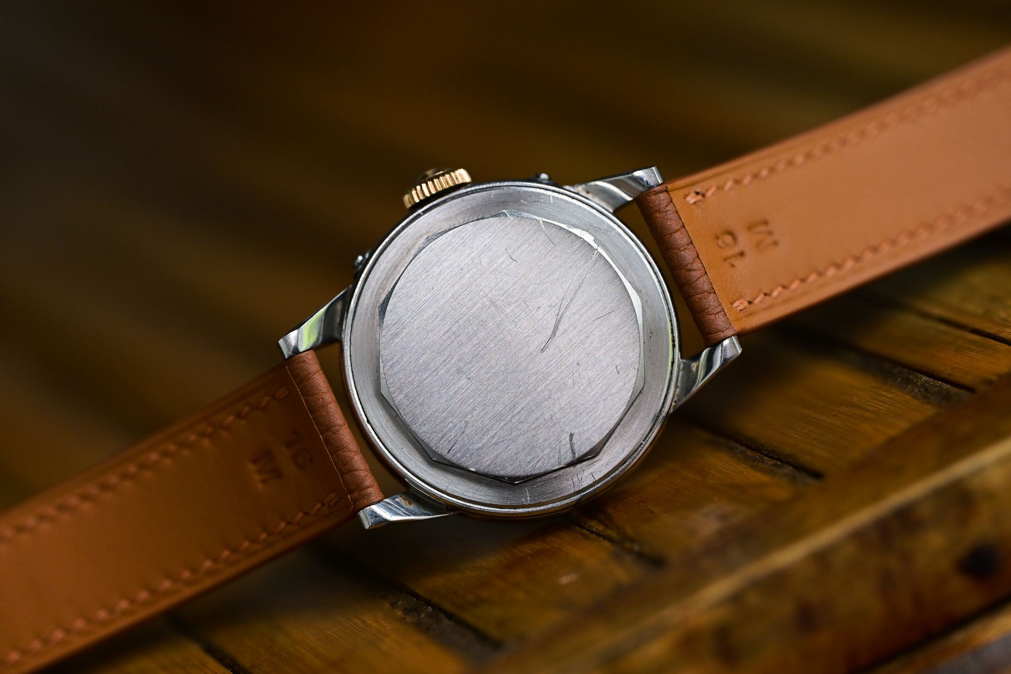 Stunning and rare Movado triple date calendar dating to the 1950s in all original an unpolished condition. Featuring a 33mm rose gold and stainless steel case by Francois Borgel and beautiful two tone dial by Stern. Powered by a Movado manual wind movement.