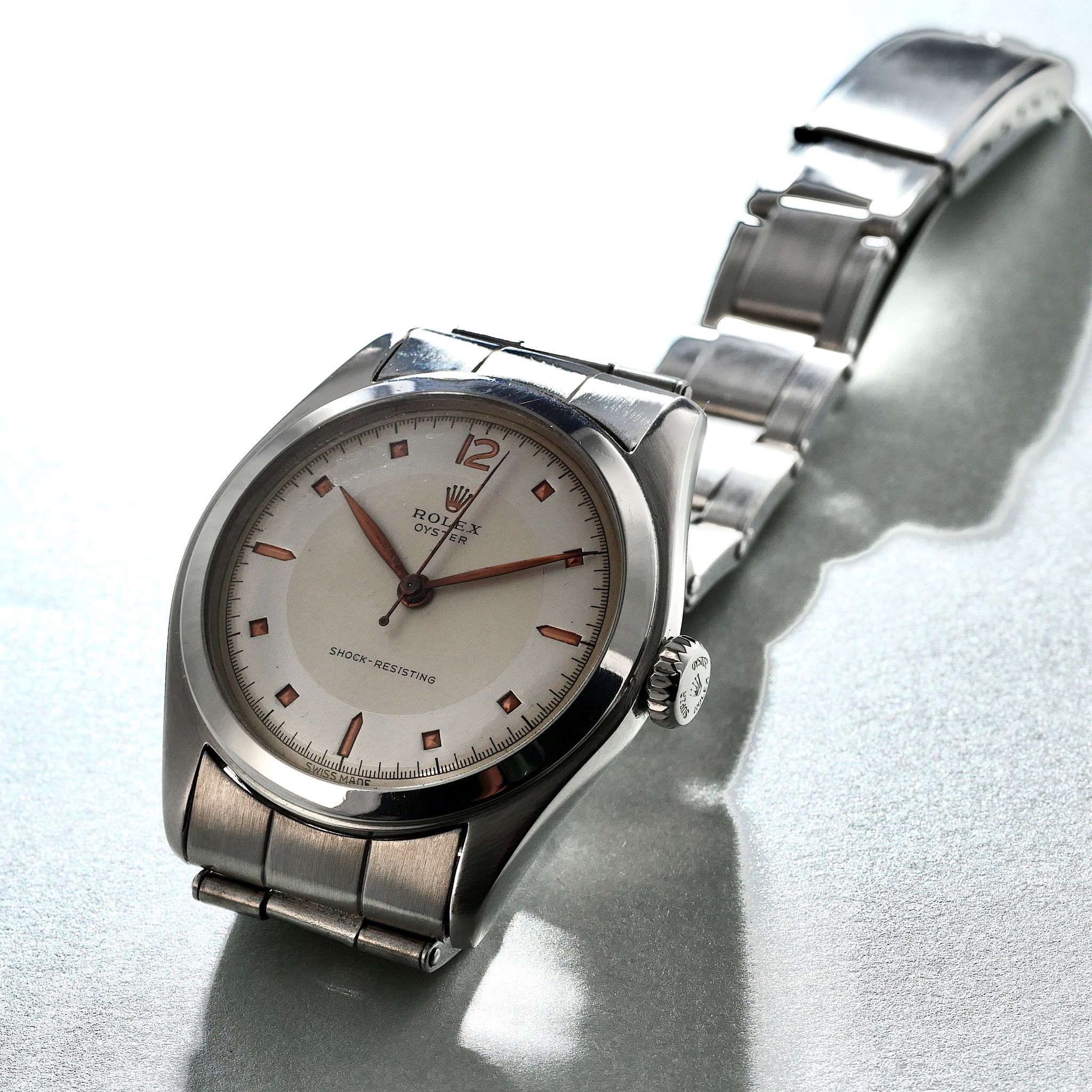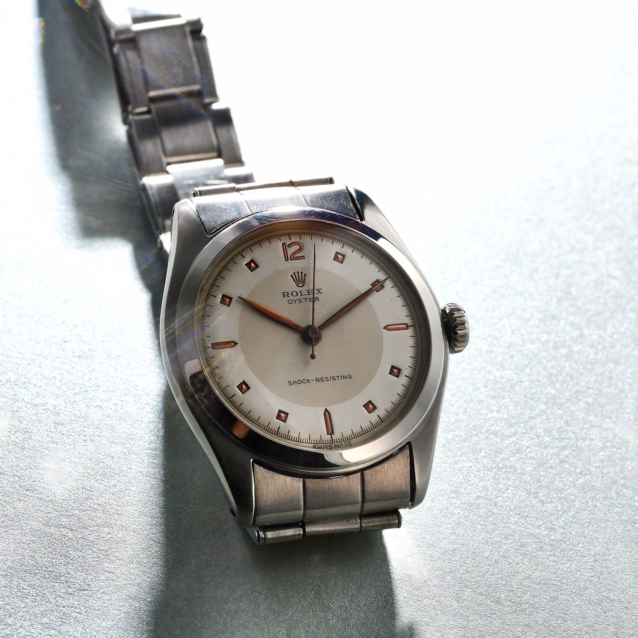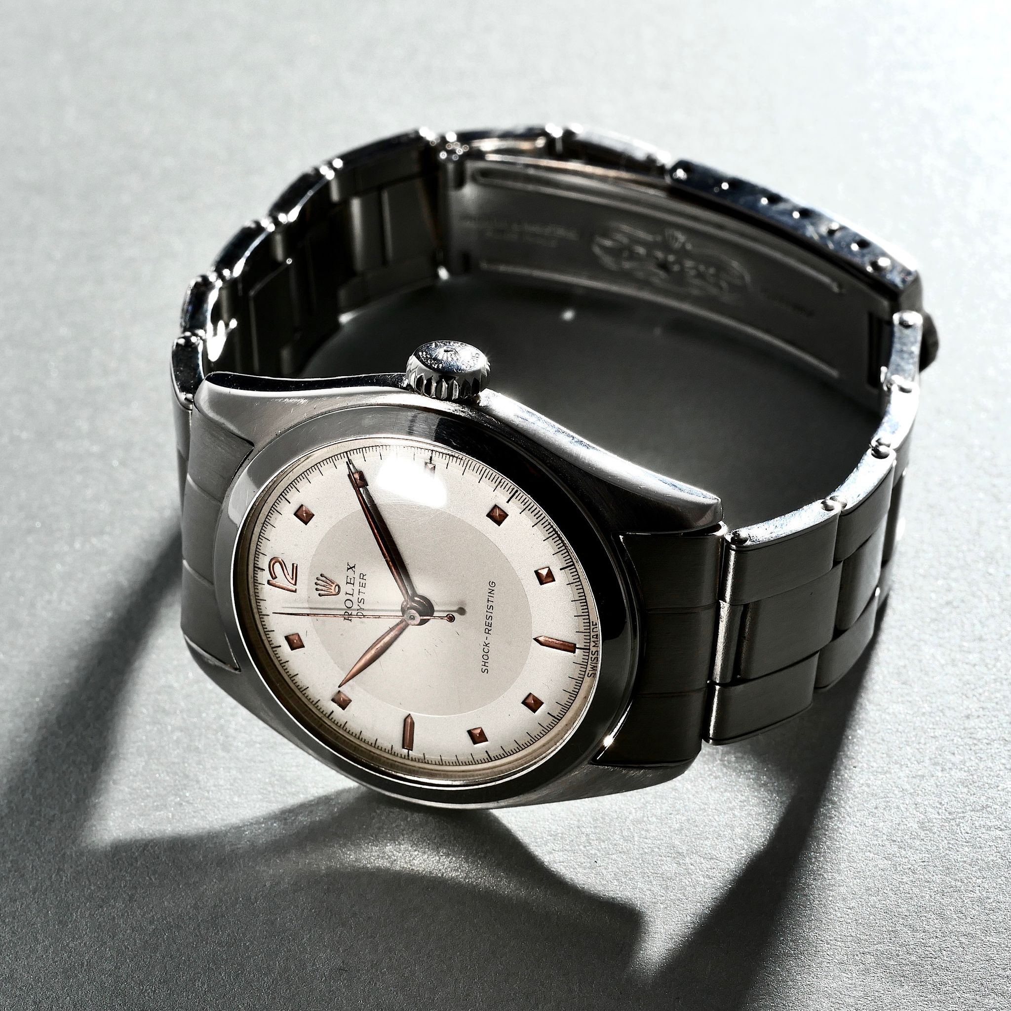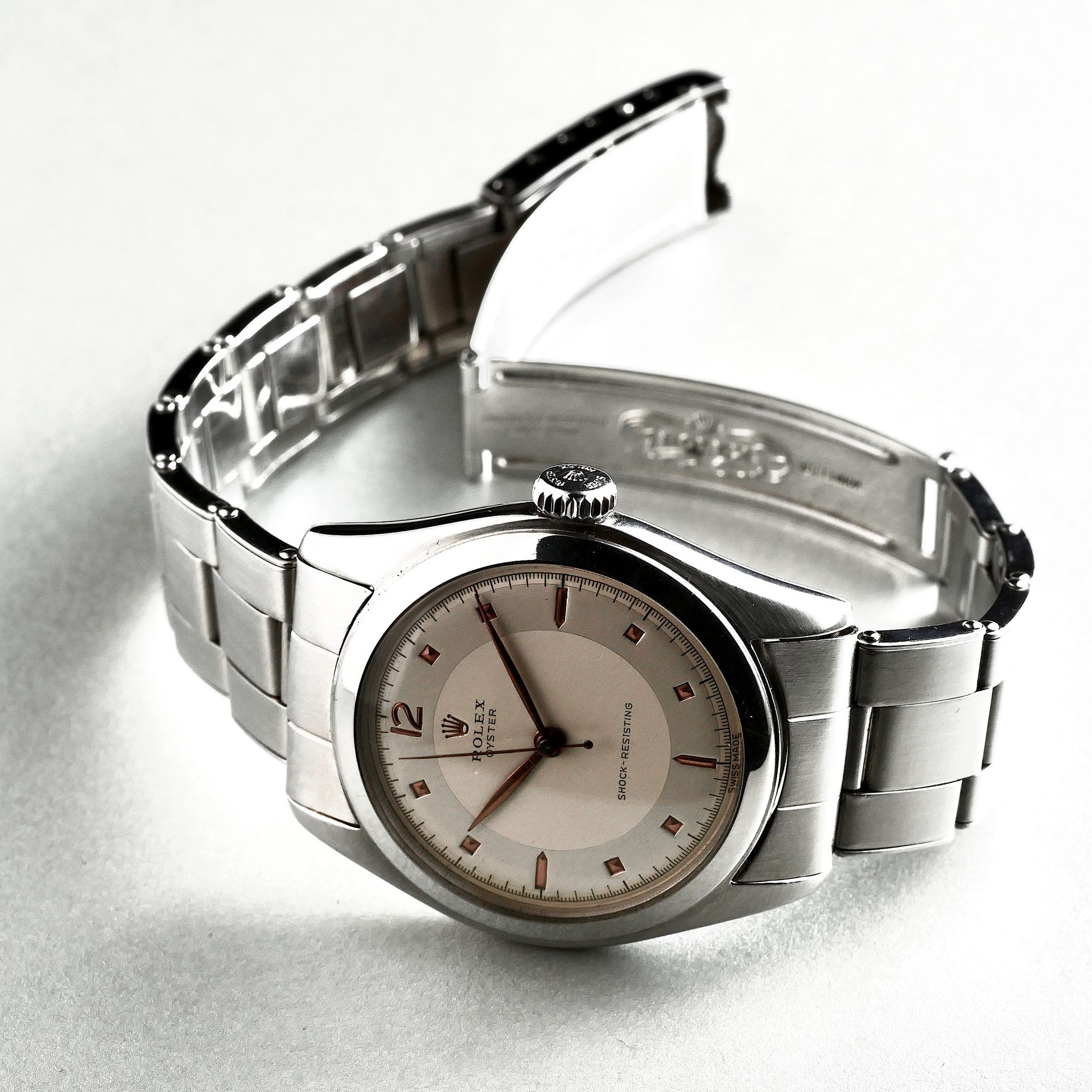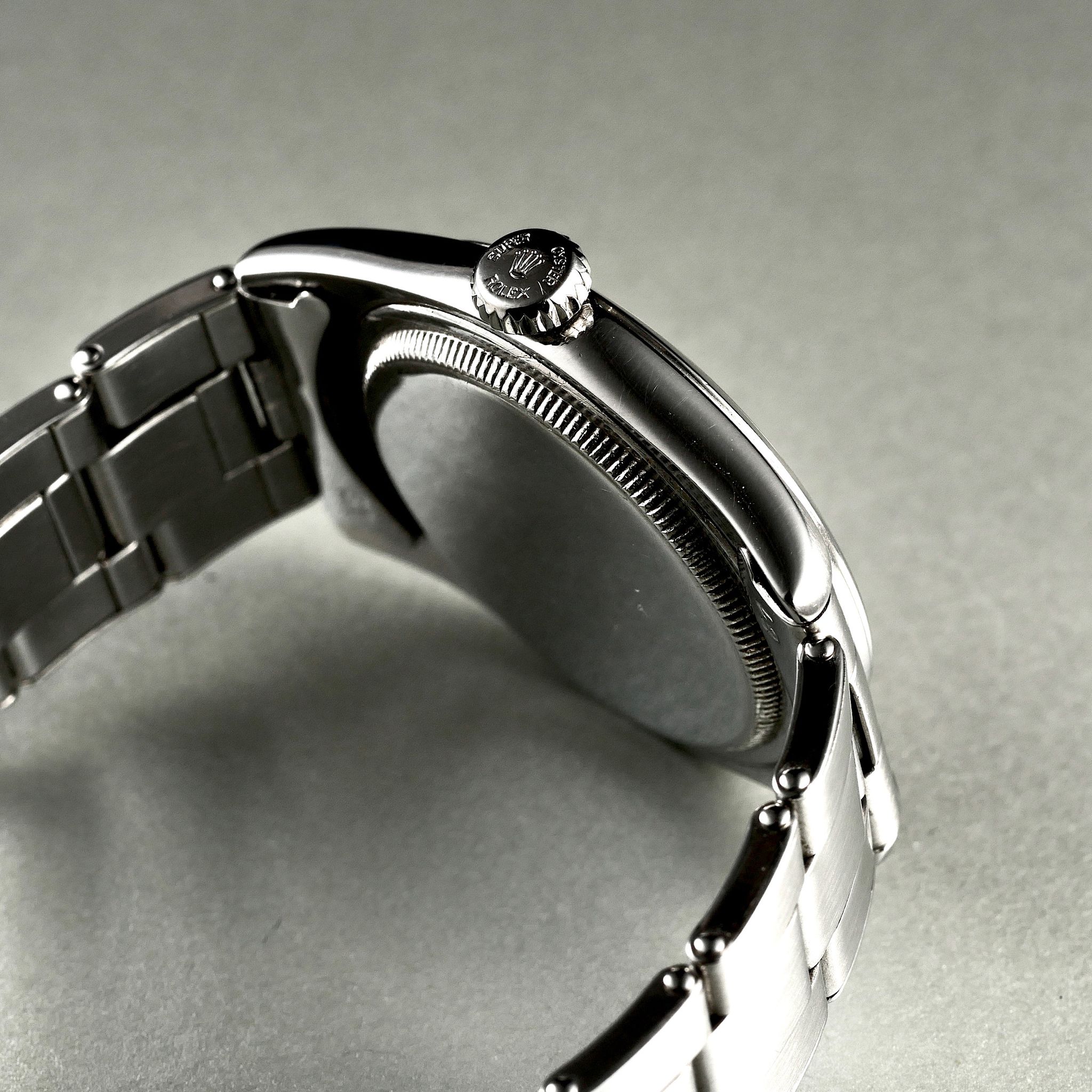 SPECIFICATIONS: Stainless Steel, Hand finished Pie-pan dial with pink gold pyramid indices, Steel Caseback, Original Period Rolex Riveted Bracelet, Very Fine and Rare, Limited Production
