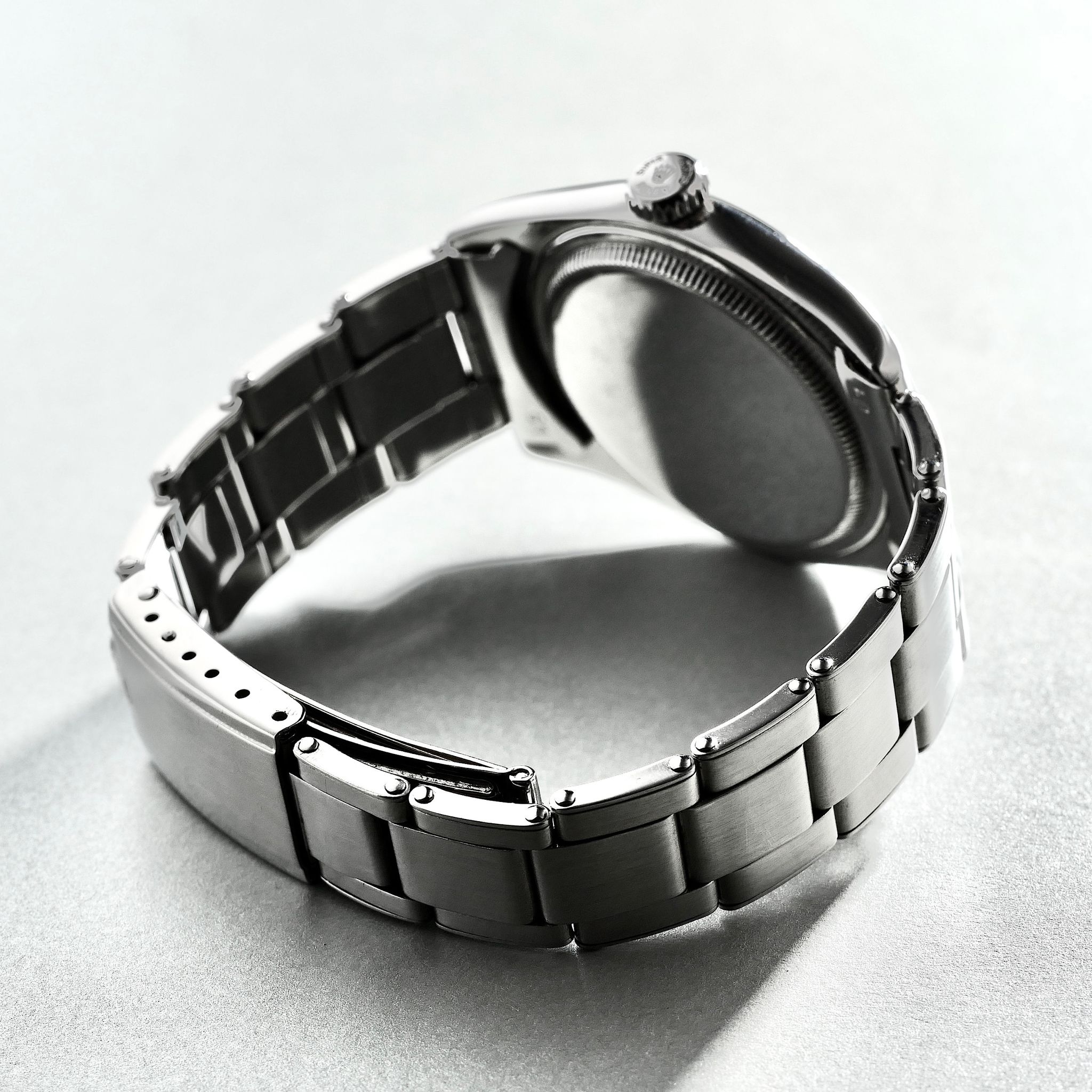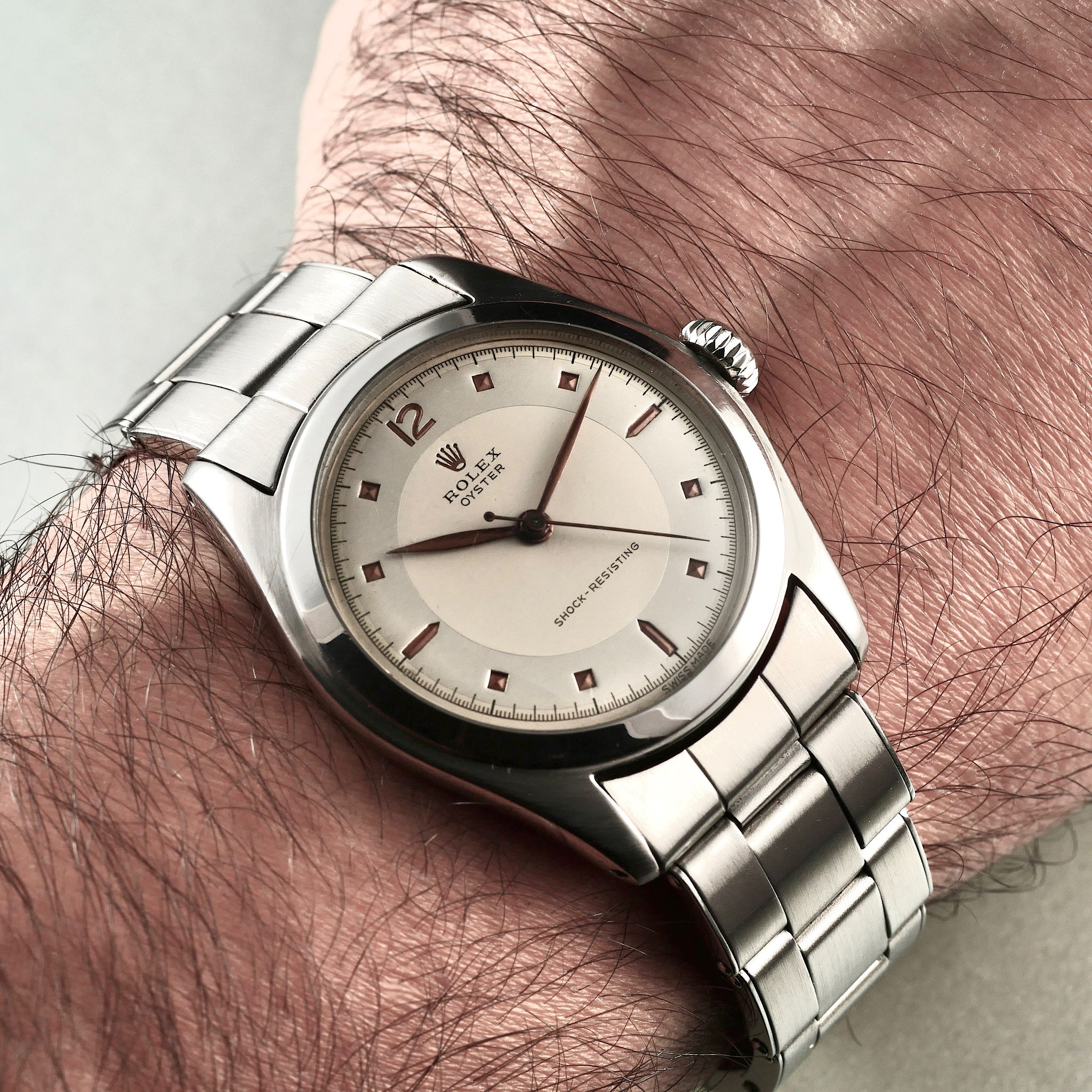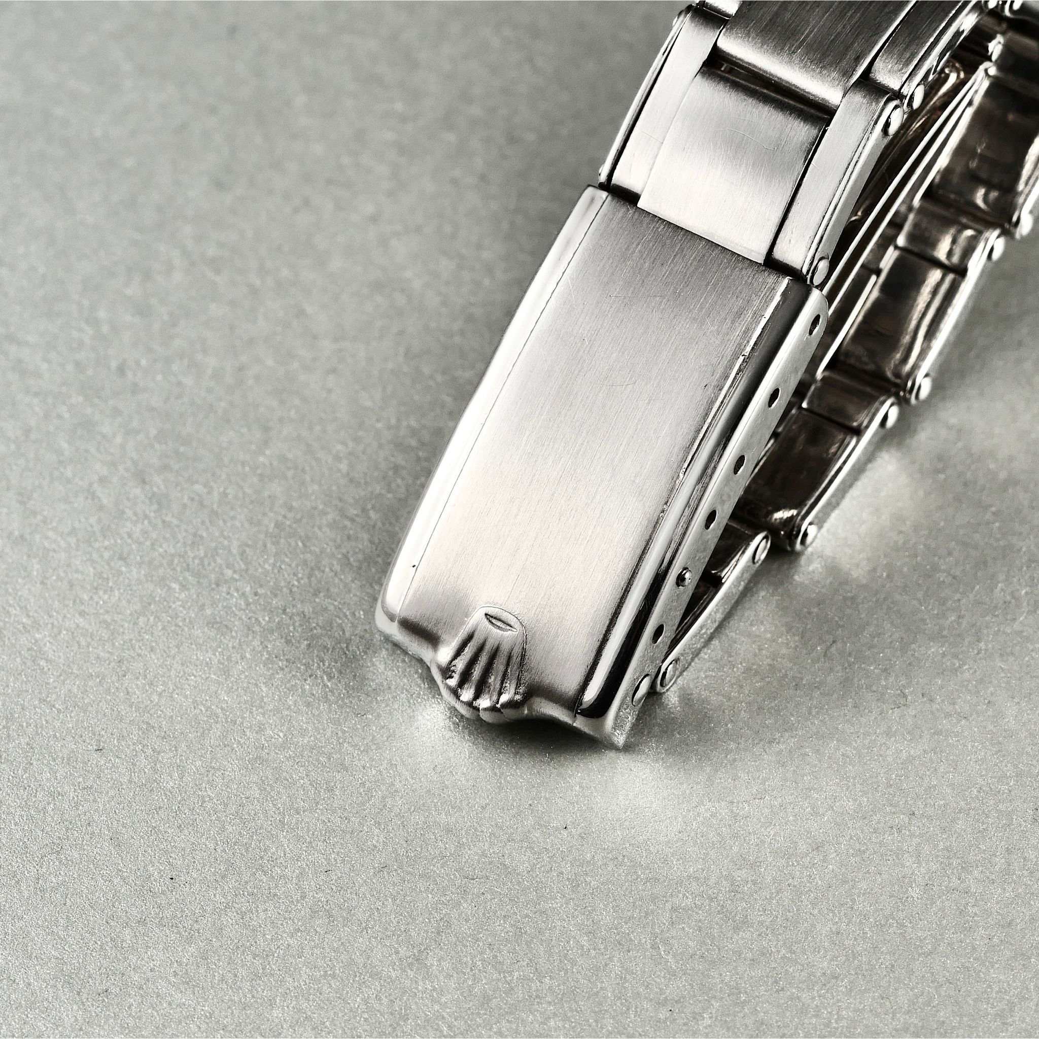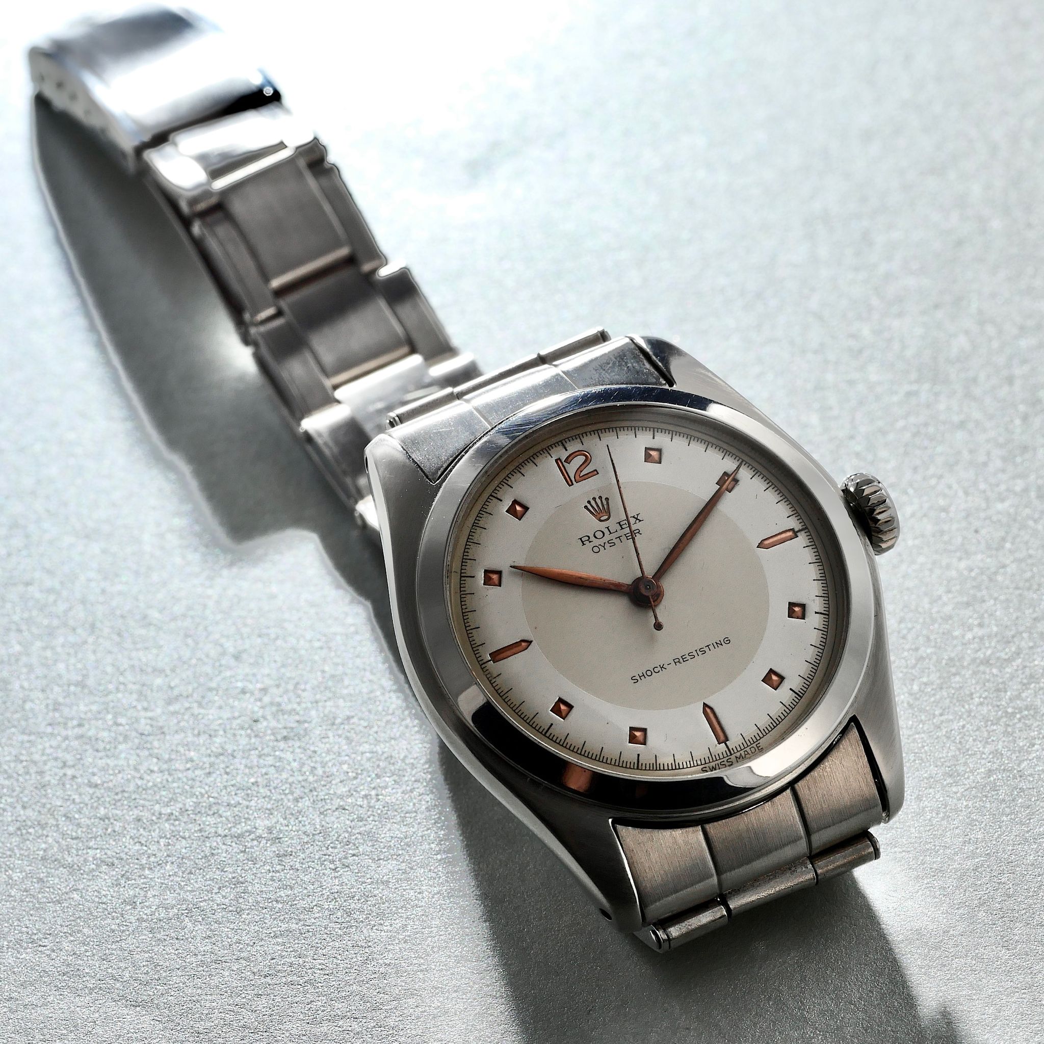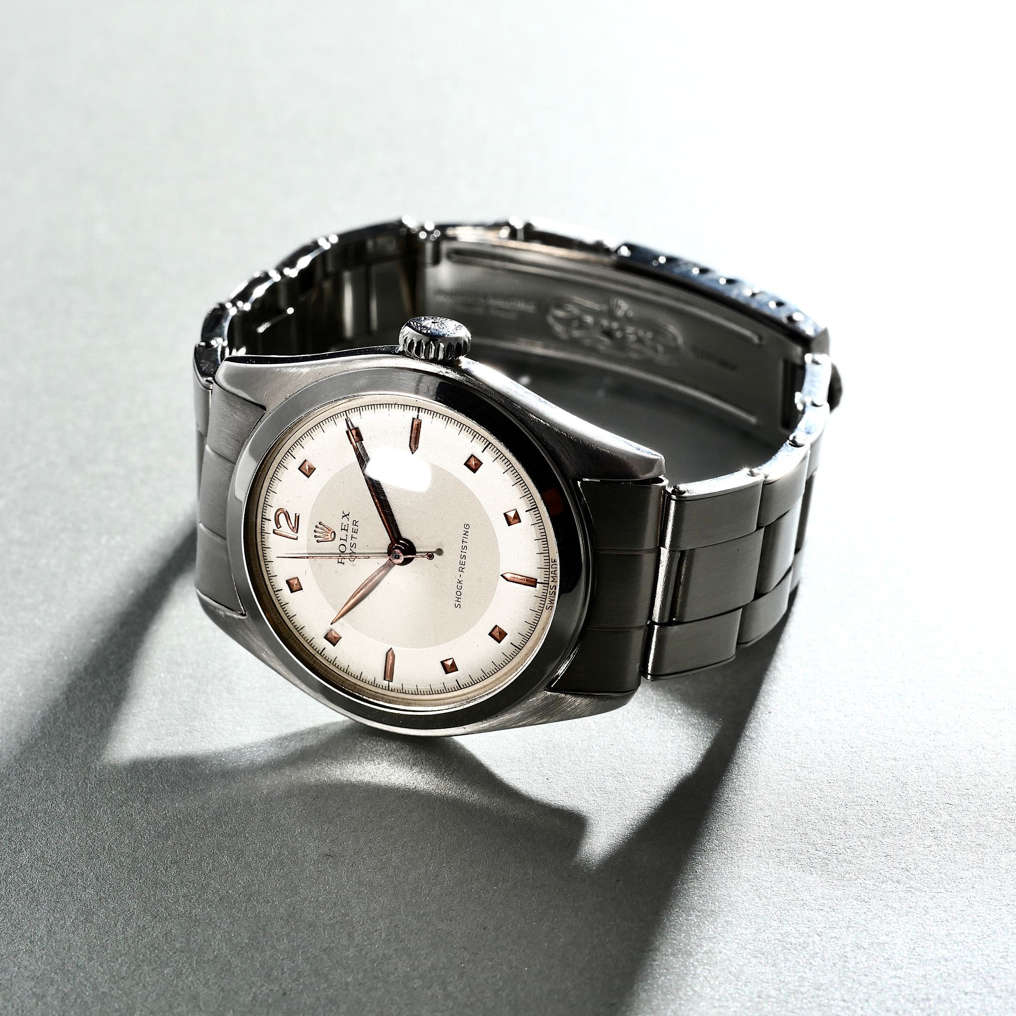SPECIFICATIONS: Stainless Steel, Hand finished Pie-pan dial with pink gold pyramid indices, Steel Caseback, Original Period Rolex Riveted Bracelet, Very Fine and Rare, Limited Production