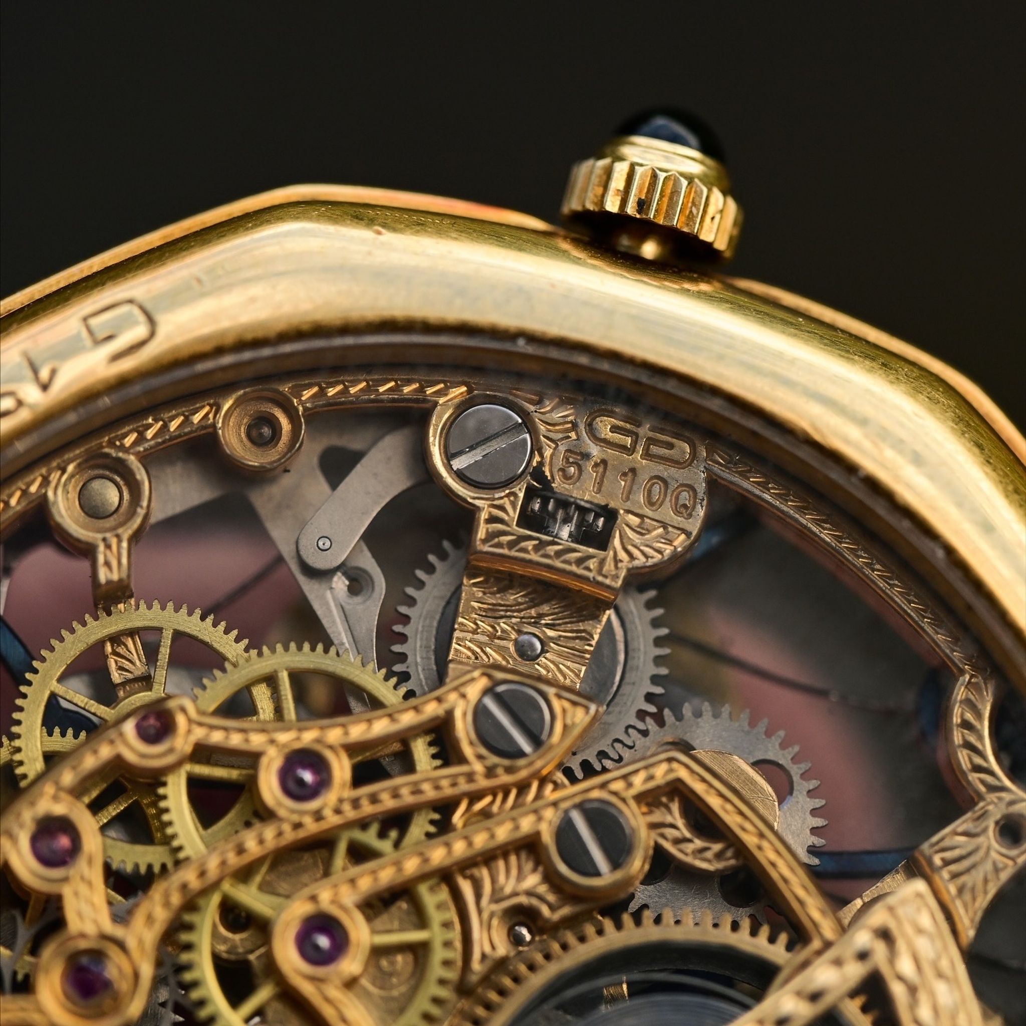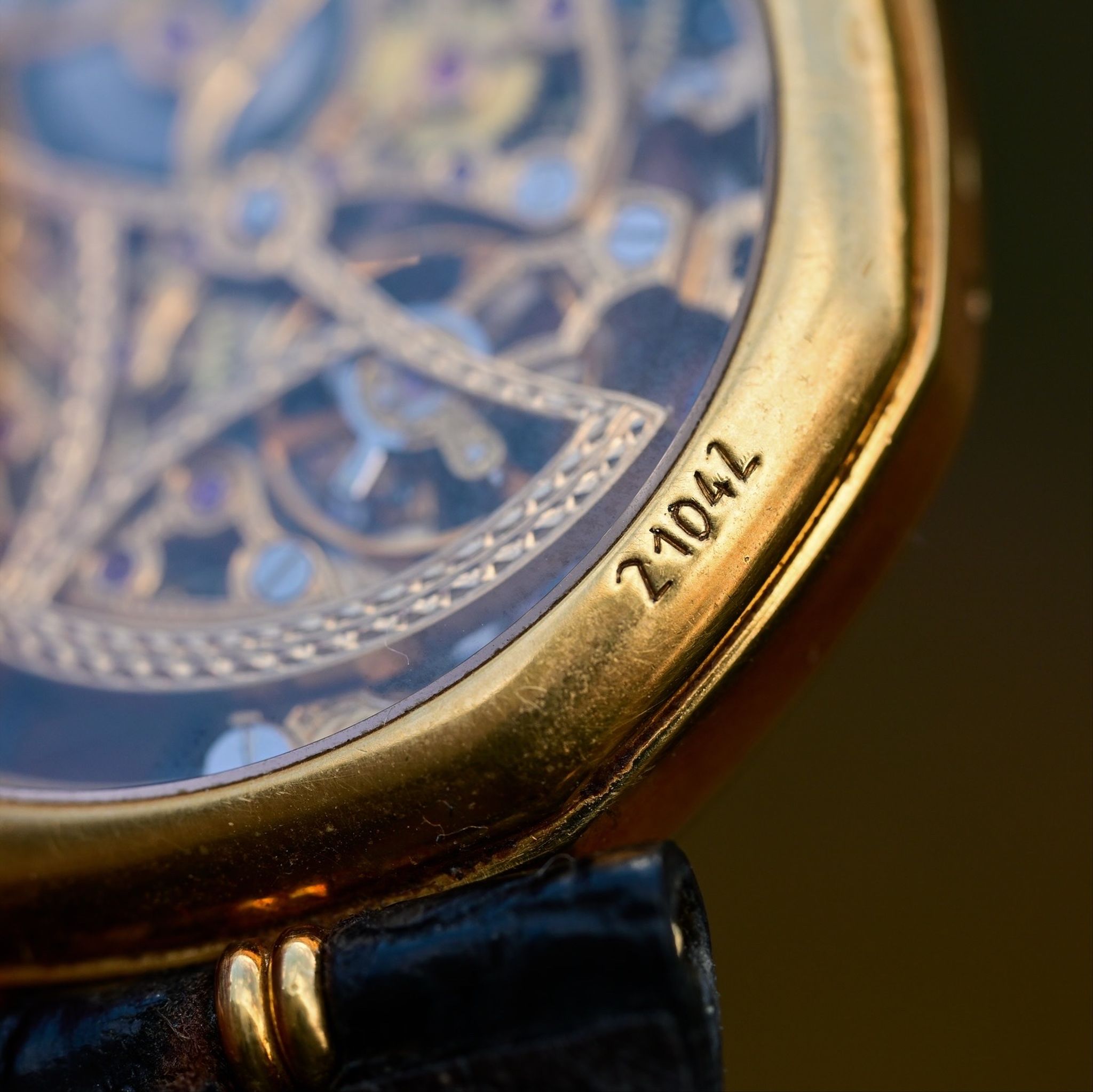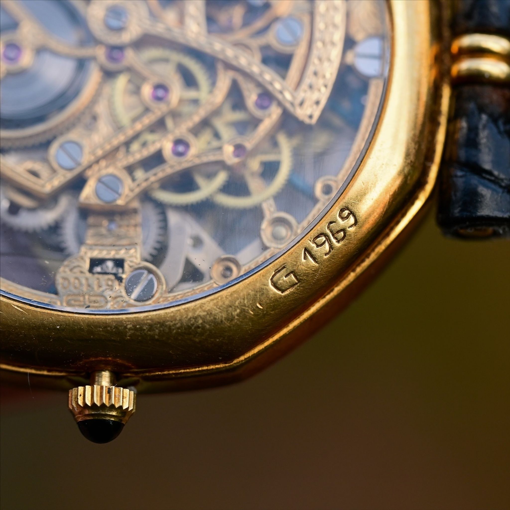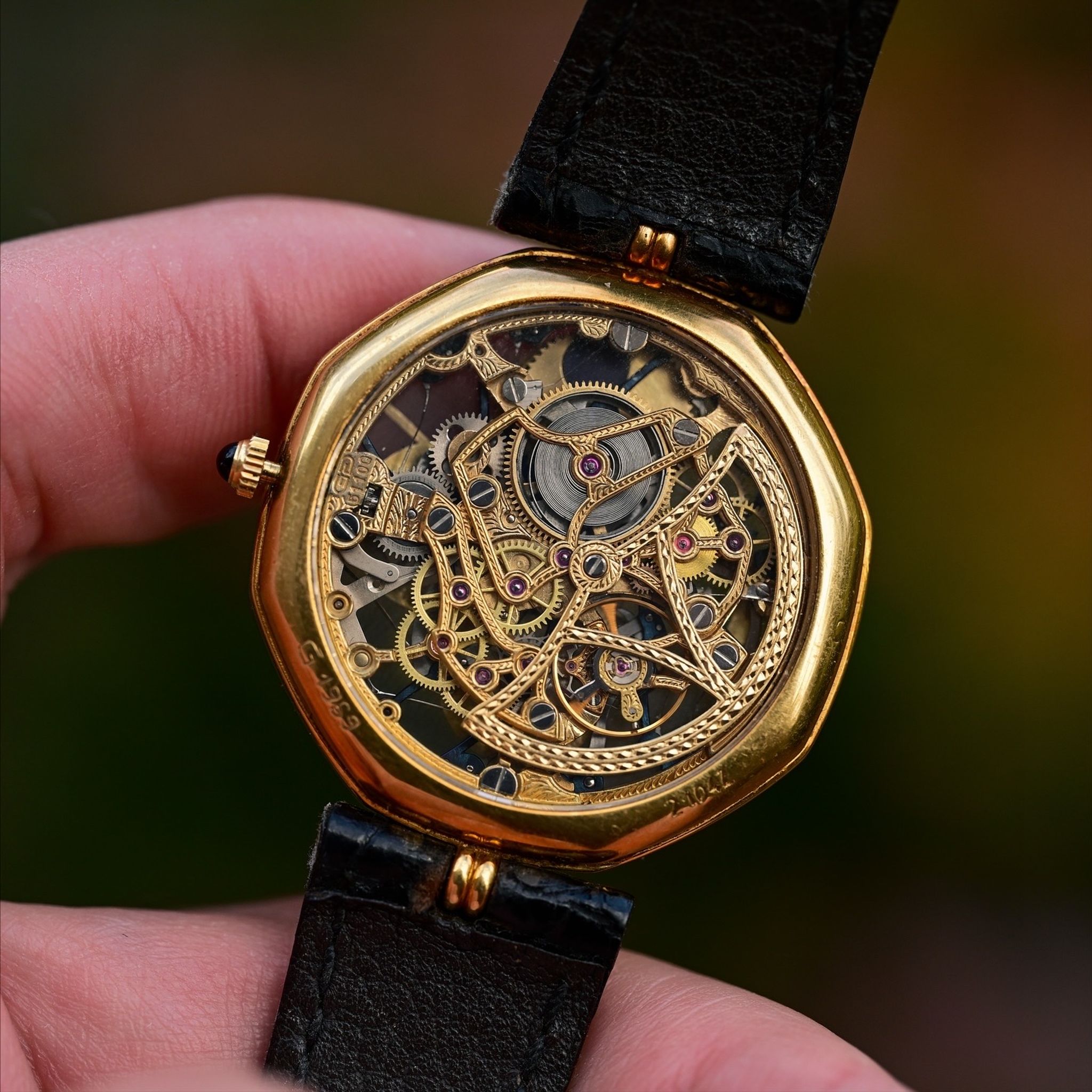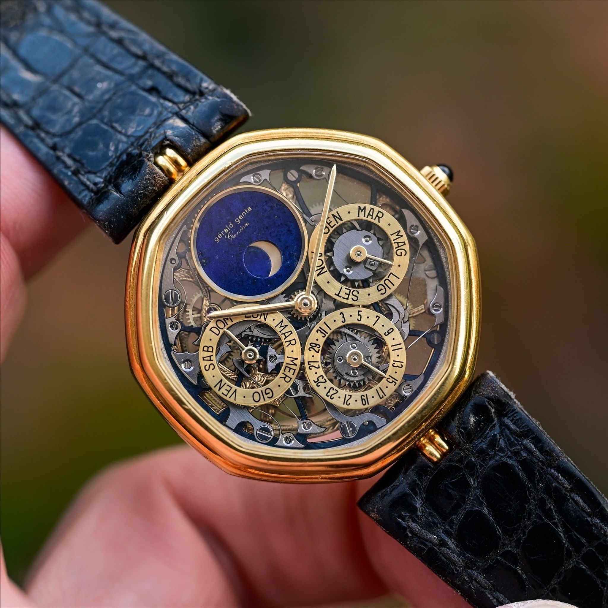 A spectacular vintage Gerald Genta Skeletonized Quantieme Perpetual Moonphase! This insane watch represents the designer’s move towards high-end, whimsical complications after his iconic sports watch designs for other brands. Featuring a slim 18k yellow gold case measuring 34mm in diameter with sapphire crystals on both the front and back displaying an absolutely gorgeous and complicated skeletonized perpetual calendar. With gold registers and a lapis lazuli stone moonphase subdial at 12 o’clock. The GG 5110Q movement is an ultra slim based on the Frederic Piguet Cal. 71 with an offset oscillating weight of solid gold with beautiful hand engraved finishing. This early example features hand engraved case and serial numbers as well as deep hallmarks and appears to have never been polished. It also comes with its original strap and and 18k gold buckle. There are so many incredible and unique details in this piece and compared to other skeletonized perpetual calendars of the same era it presents an amazing value especially when considering the immense rarity and the fact that if this watch were produced today it would cost well into the 6 figures. This is a true collectors and connoisseurs piece and it exemplifies the kind of watches I like to curate and offer!