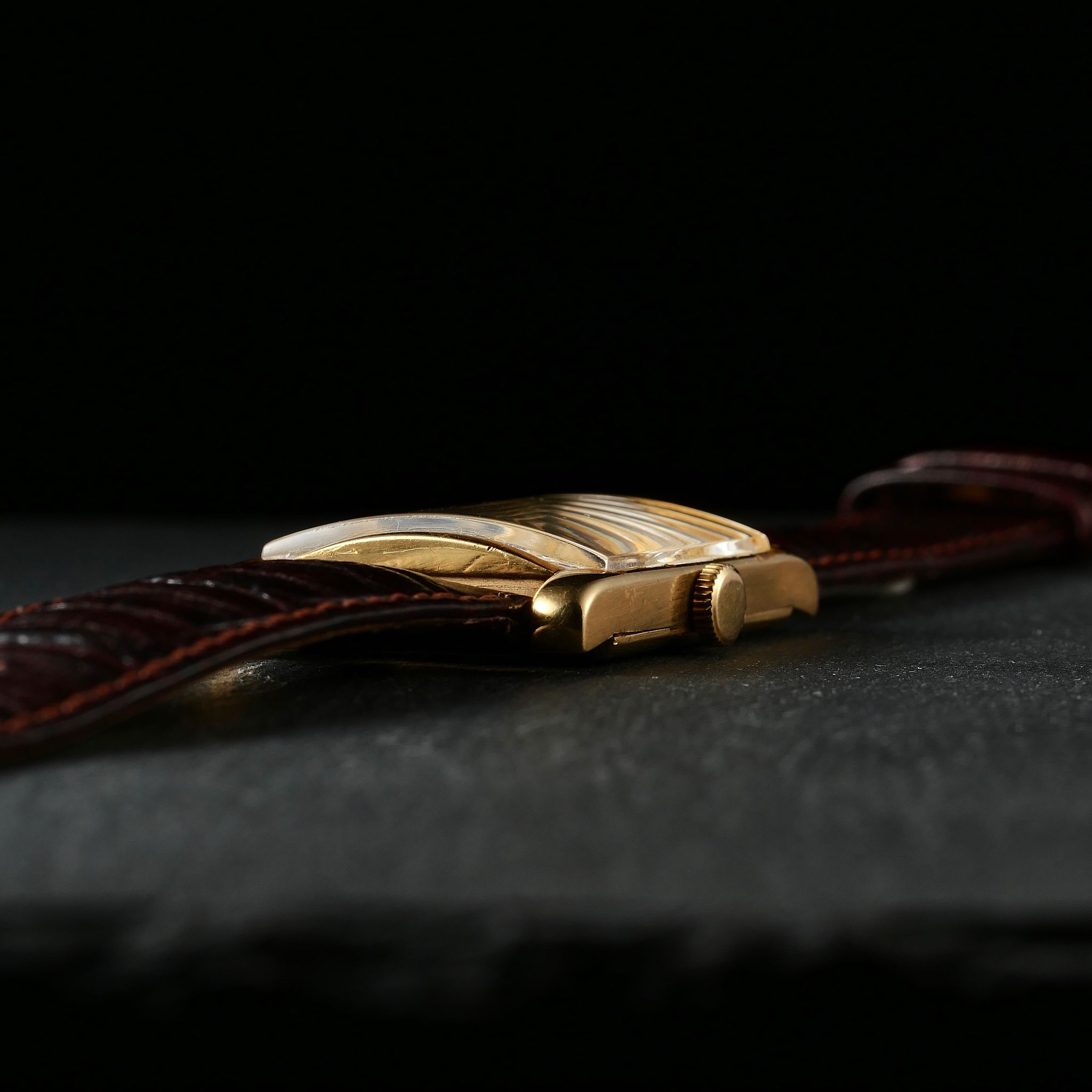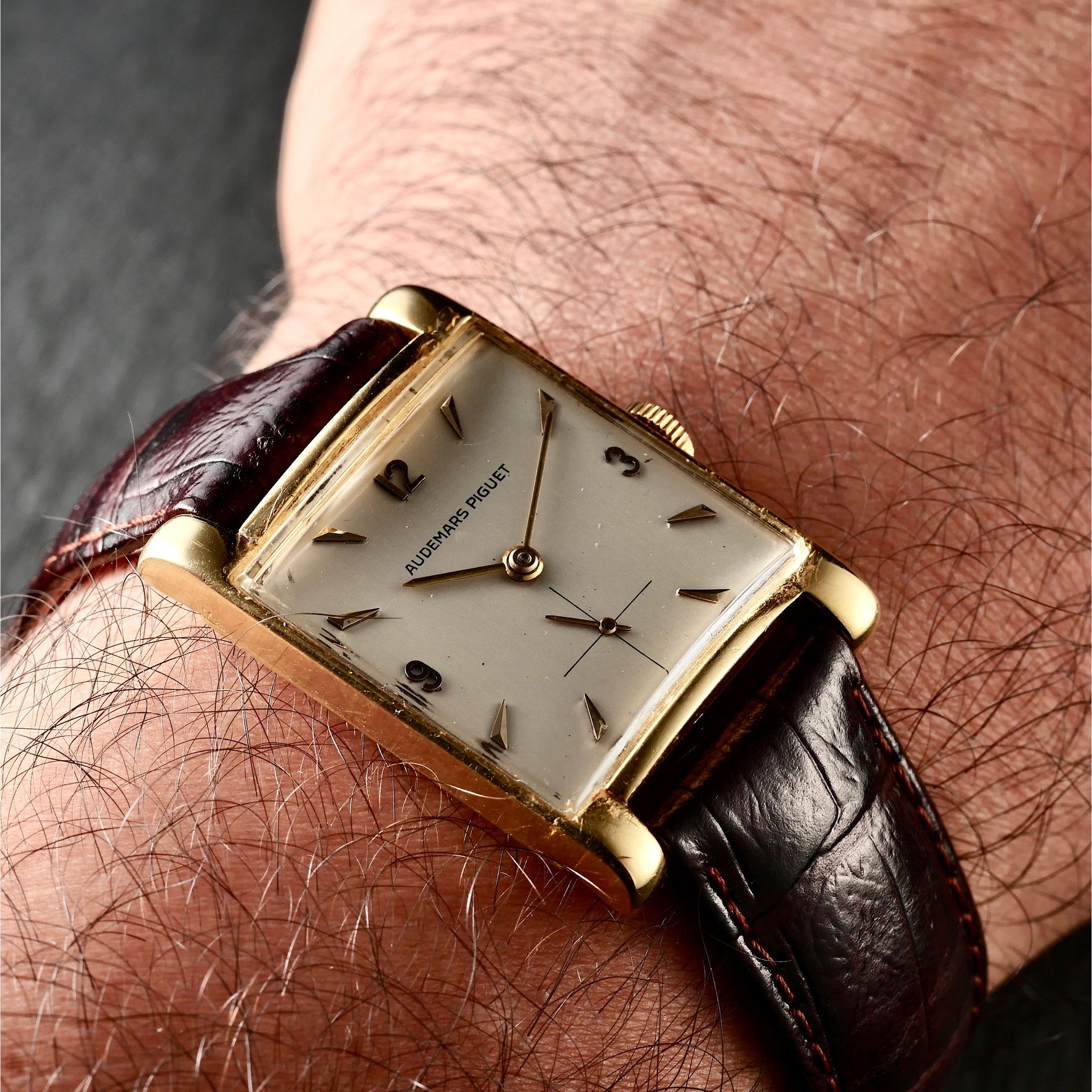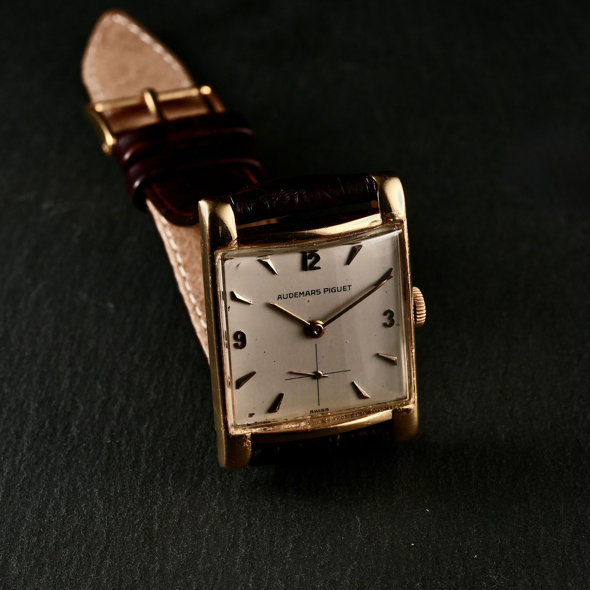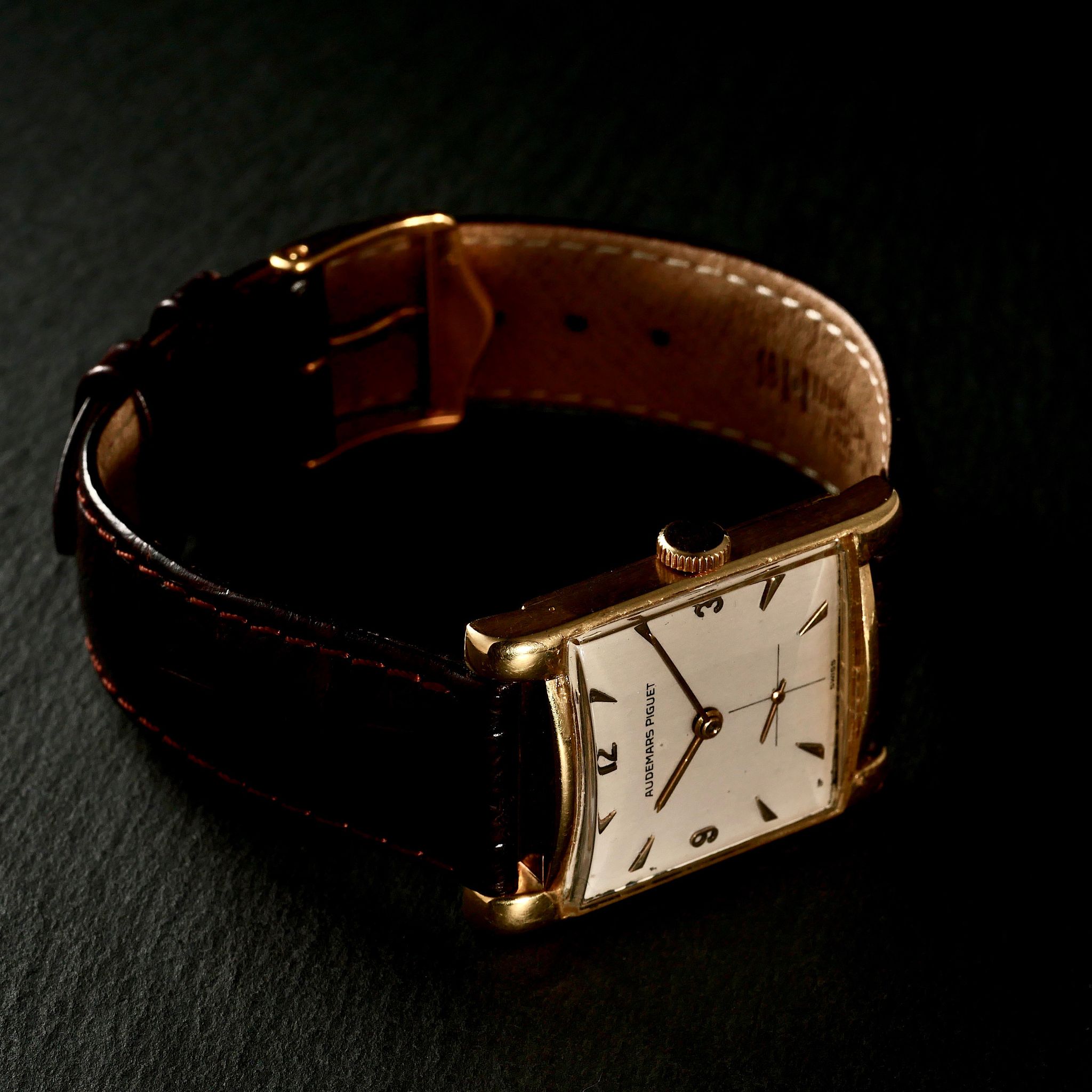 The true distinction, however, lay within. Of the three categories of movement calibres produced by Audemars Piguet in the period, this was the rarest: the mythical tonneau shaped 9/10” RSQ movement which was only produced from 1946 to 1949 in very limited numbers before it was phased out in 1950.