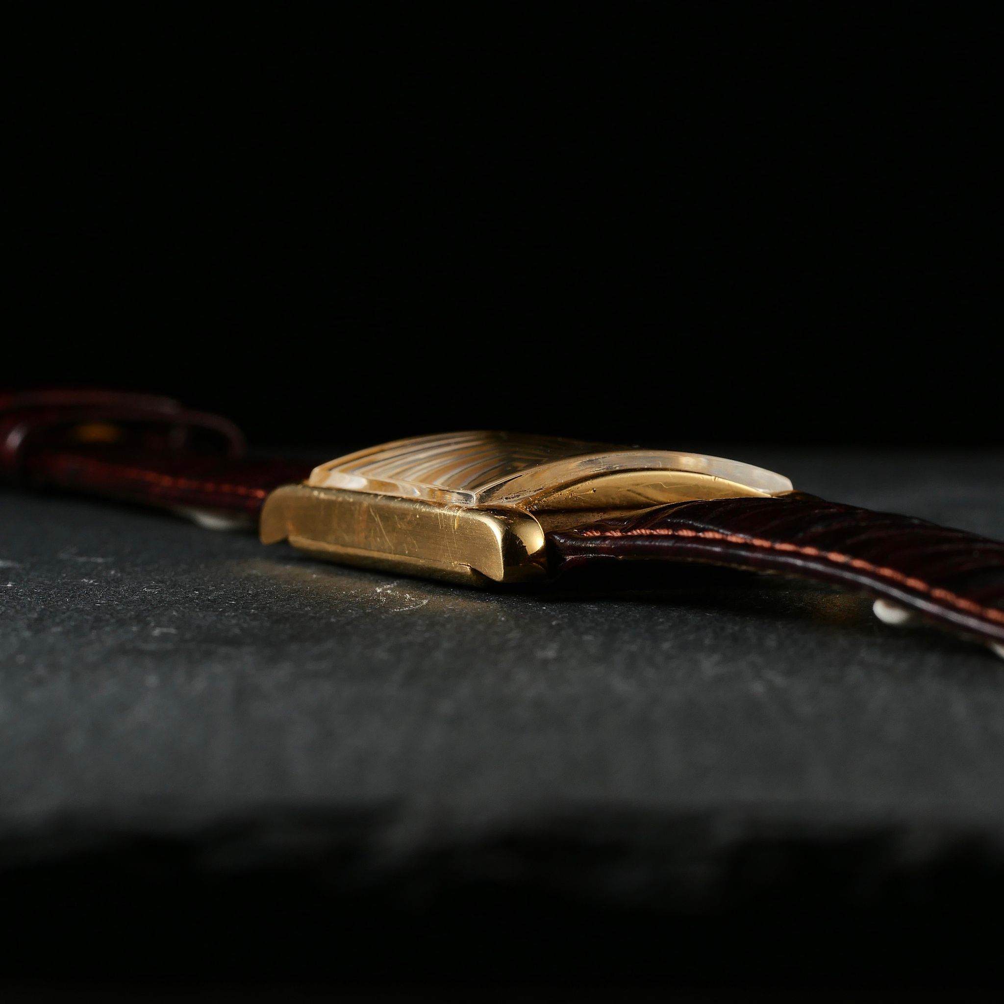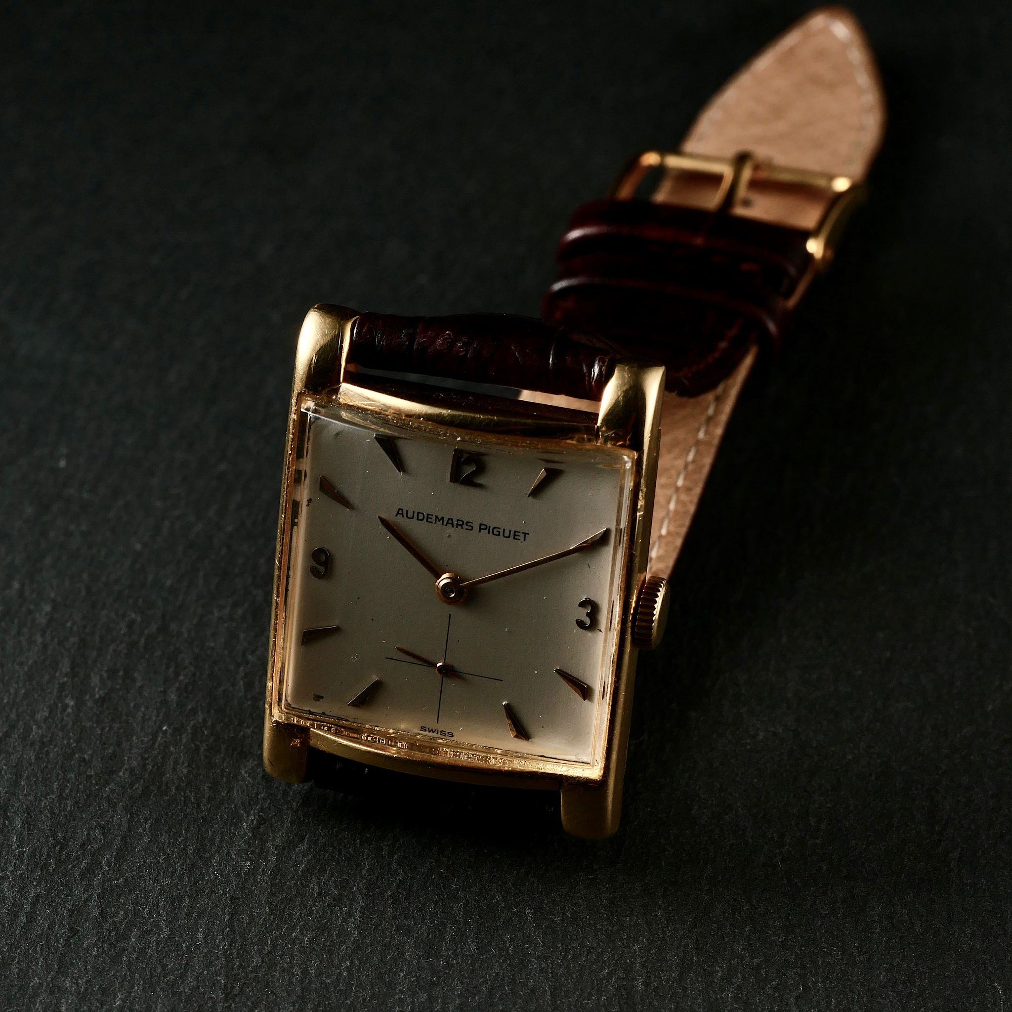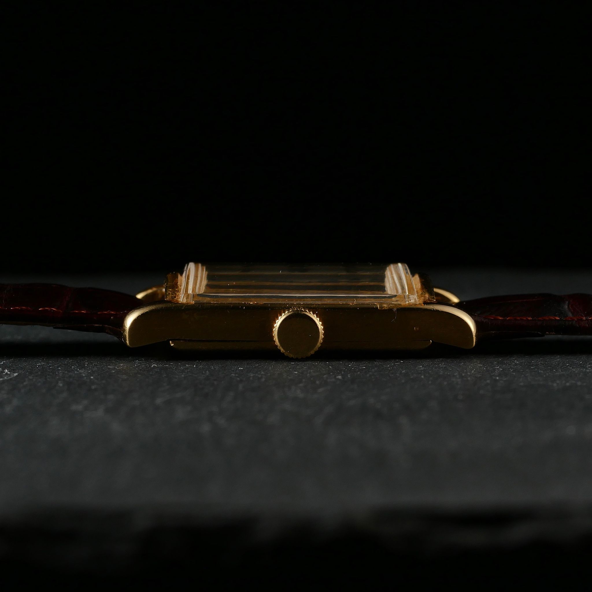 The case, a warm, slightly rose-toned yellow gold, was mounted on a simple dark brown leather strap which suited it well; emphasising the clean lines of the rectangular case.