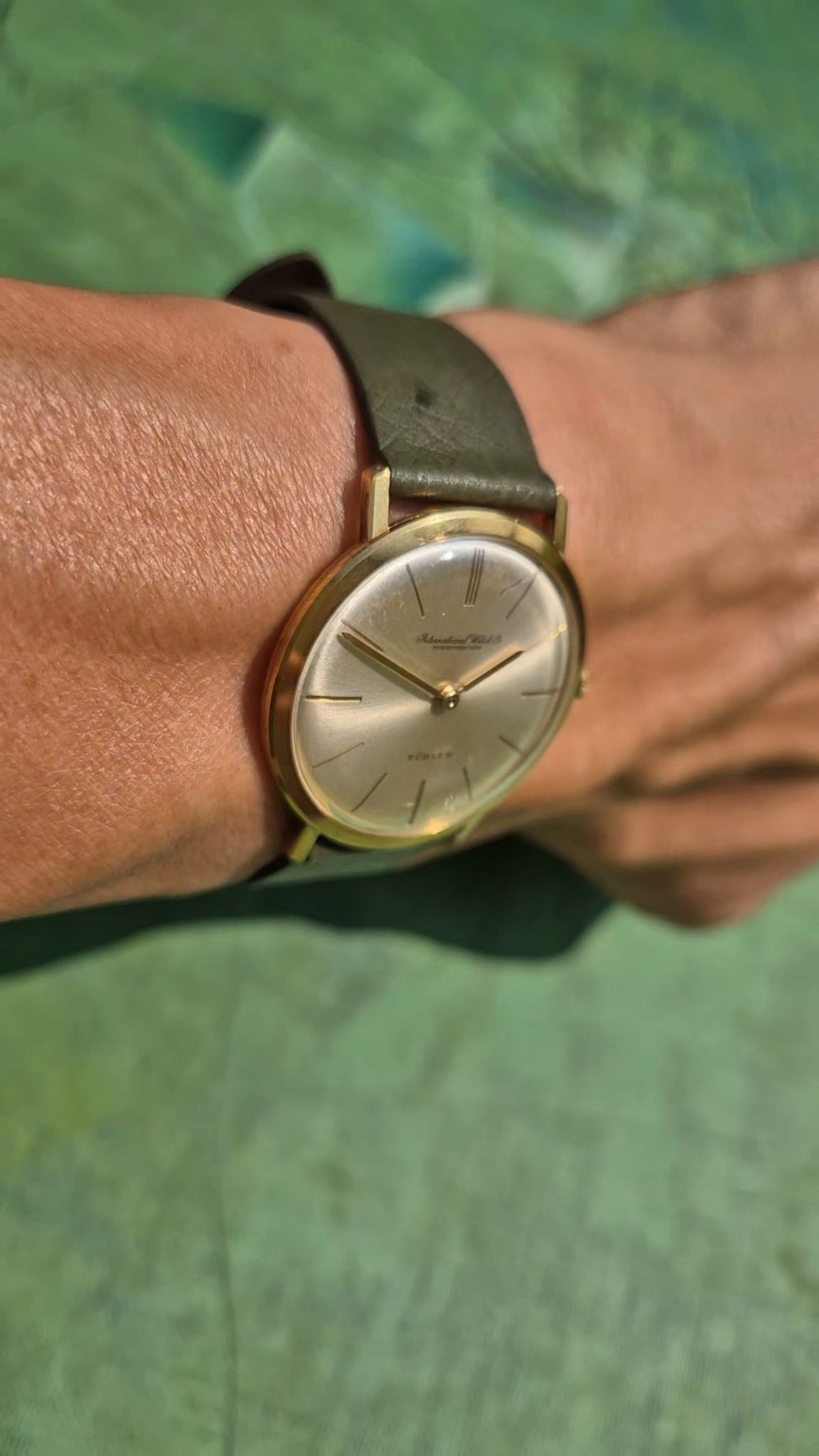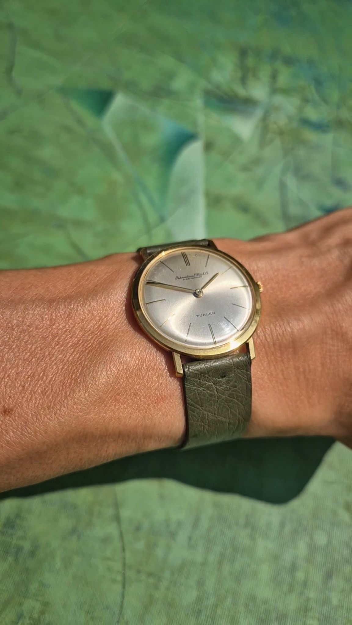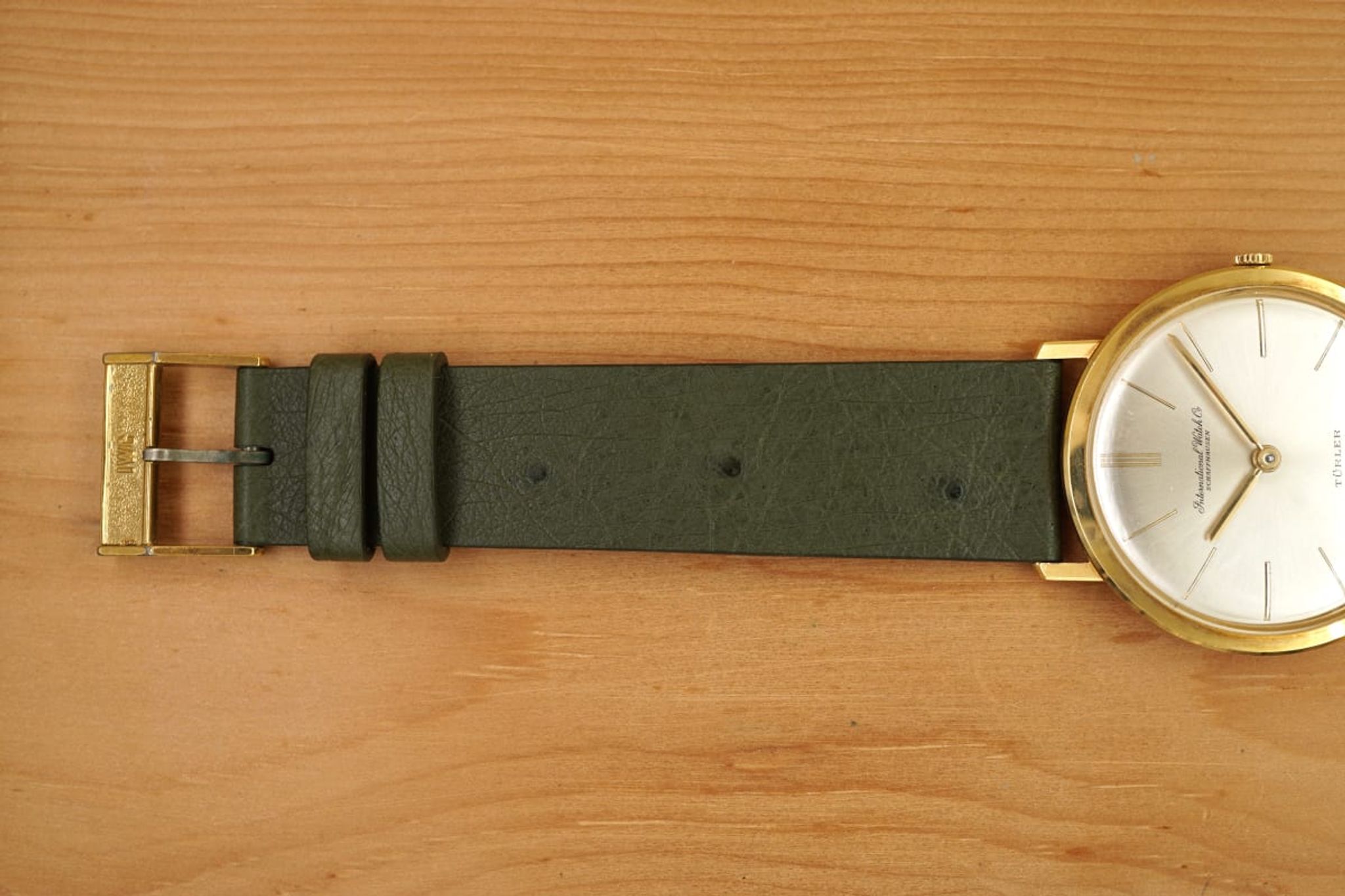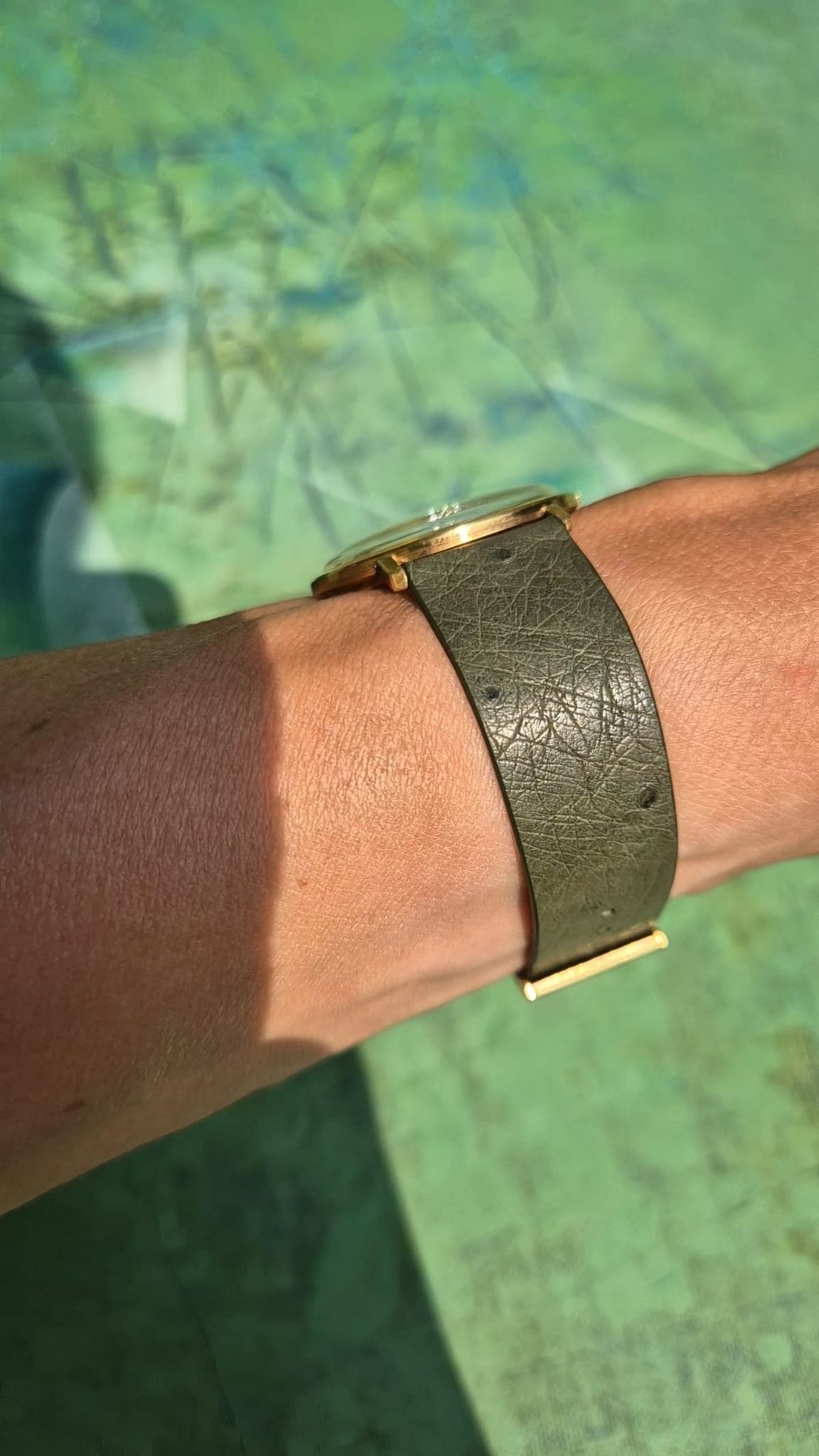 The popular and beautiful decorated manual IWC cal421 was serviced by us right now and works reliable and precise. We enhanced the watch by a custom-made dark-green ostrich-leather strap that connects the IWC-buckle. Case in a well preserved 18K-case, that appears to be unpolished (sharp and with hallmarks deep and present) and with a fine butter-brown patinae.