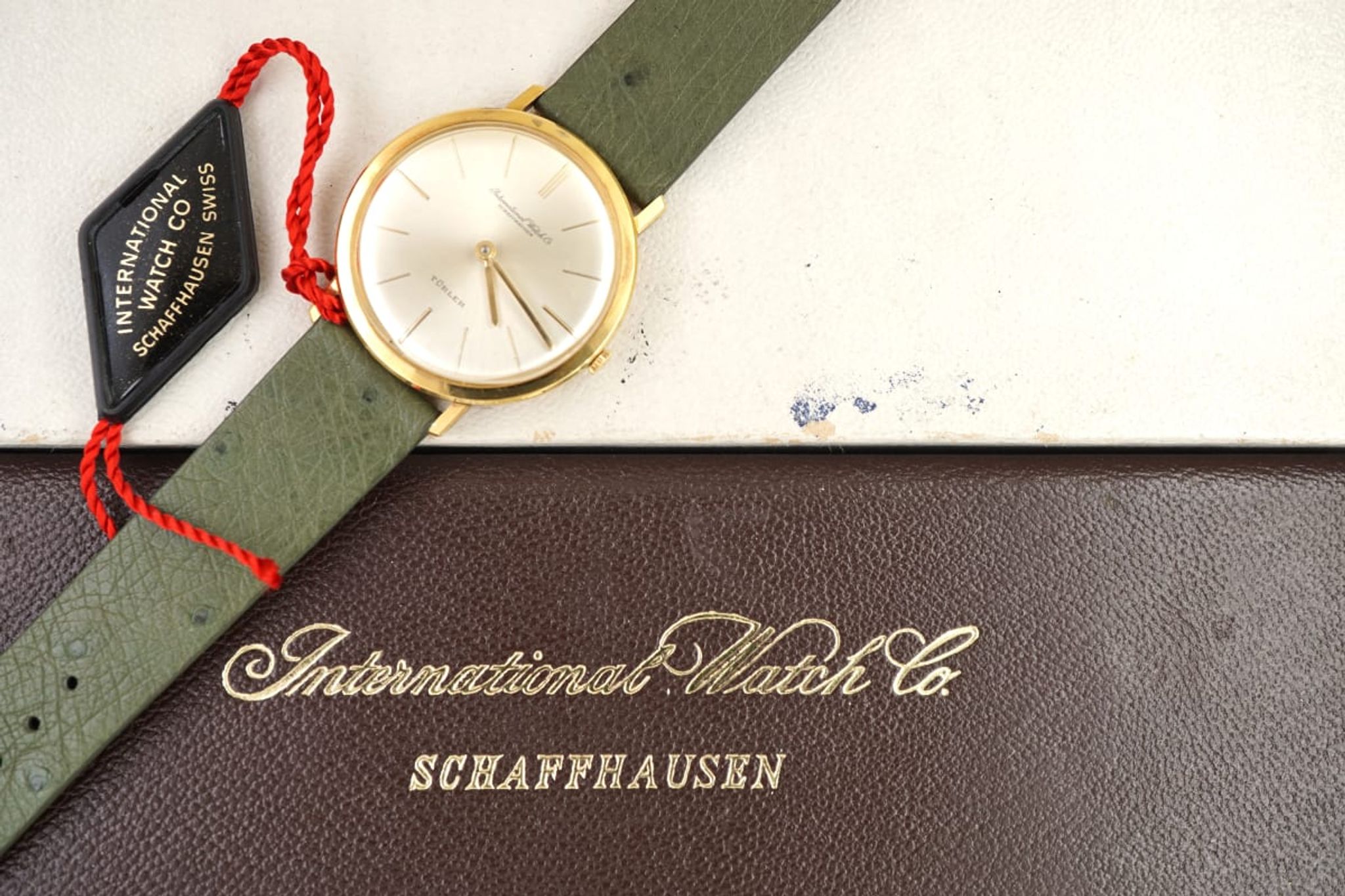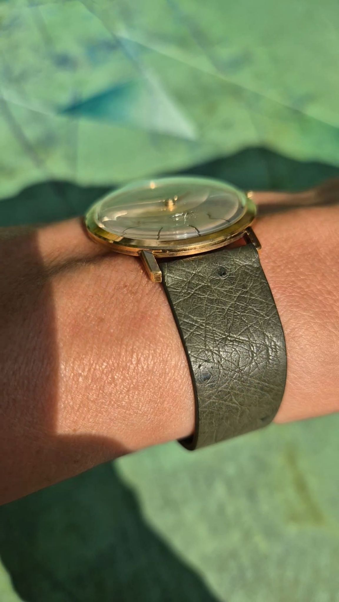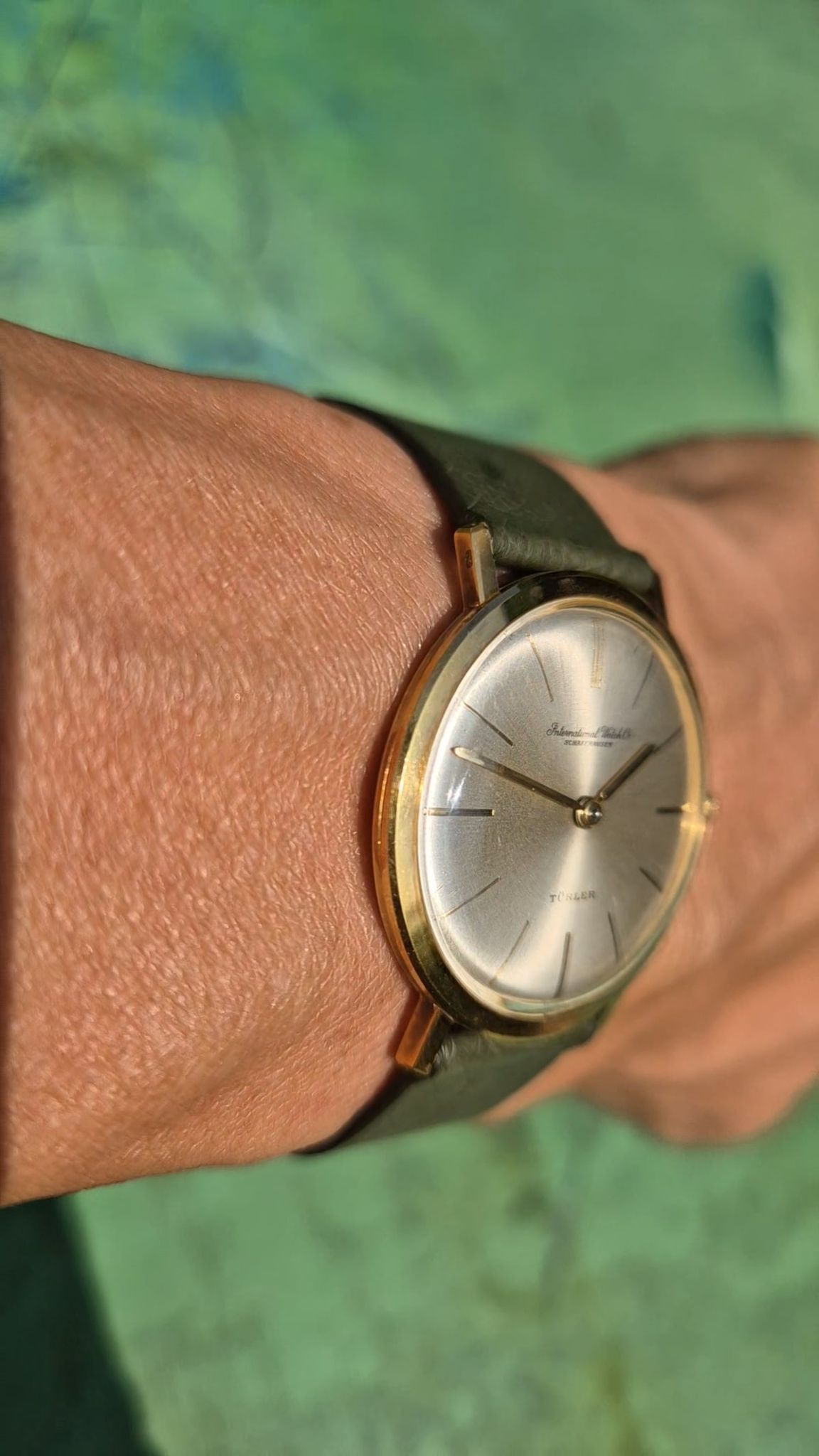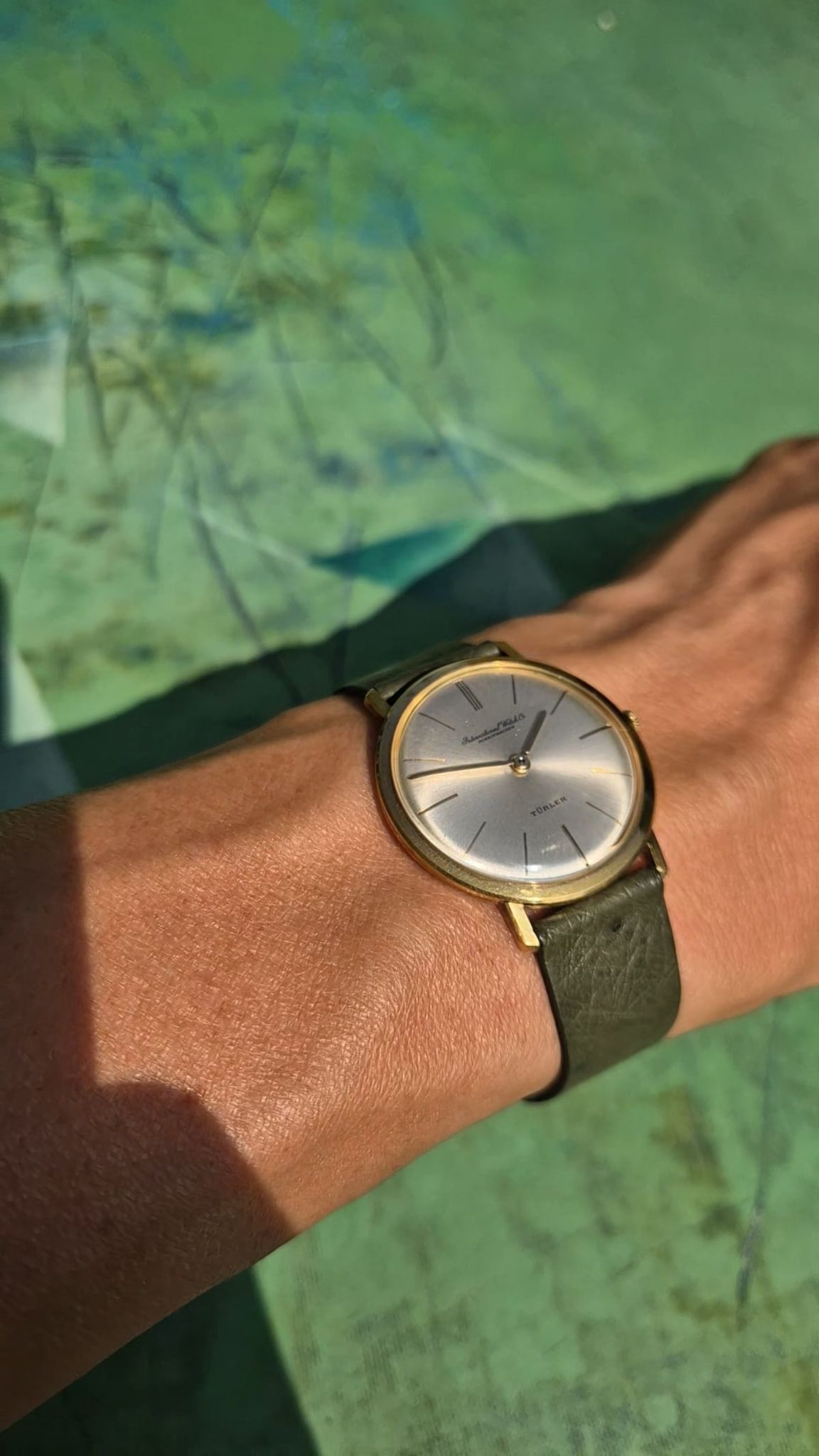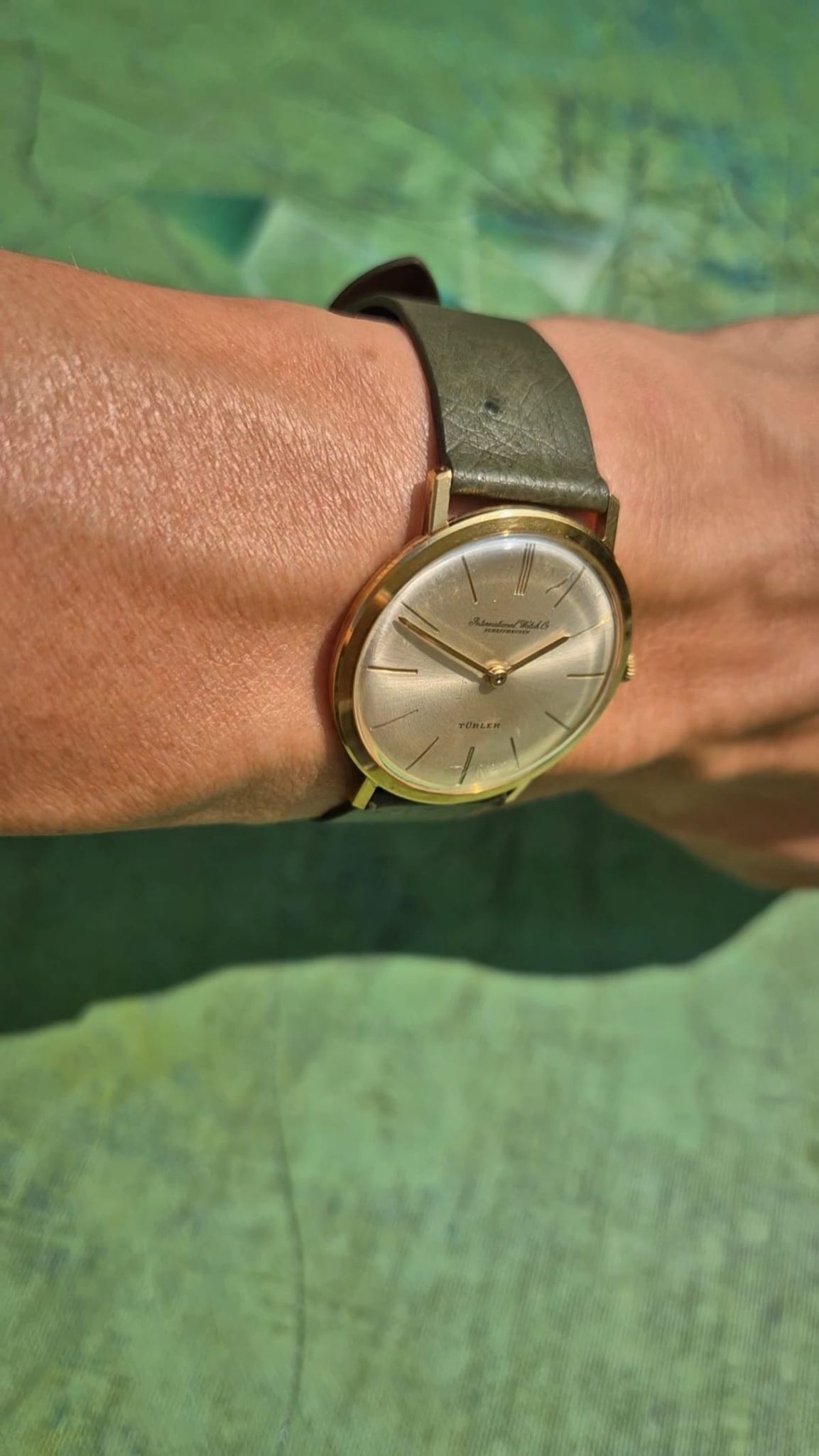 The popular and beautiful decorated manual IWC cal421 was serviced by us right now and works reliable and precise. We enhanced the watch by a custom-made dark-green ostrich-leather strap that connects the IWC-buckle. Case in a well preserved 18K-case, that appears to be unpolished (sharp and with hallmarks deep and present) and with a fine butter-brown patinae.