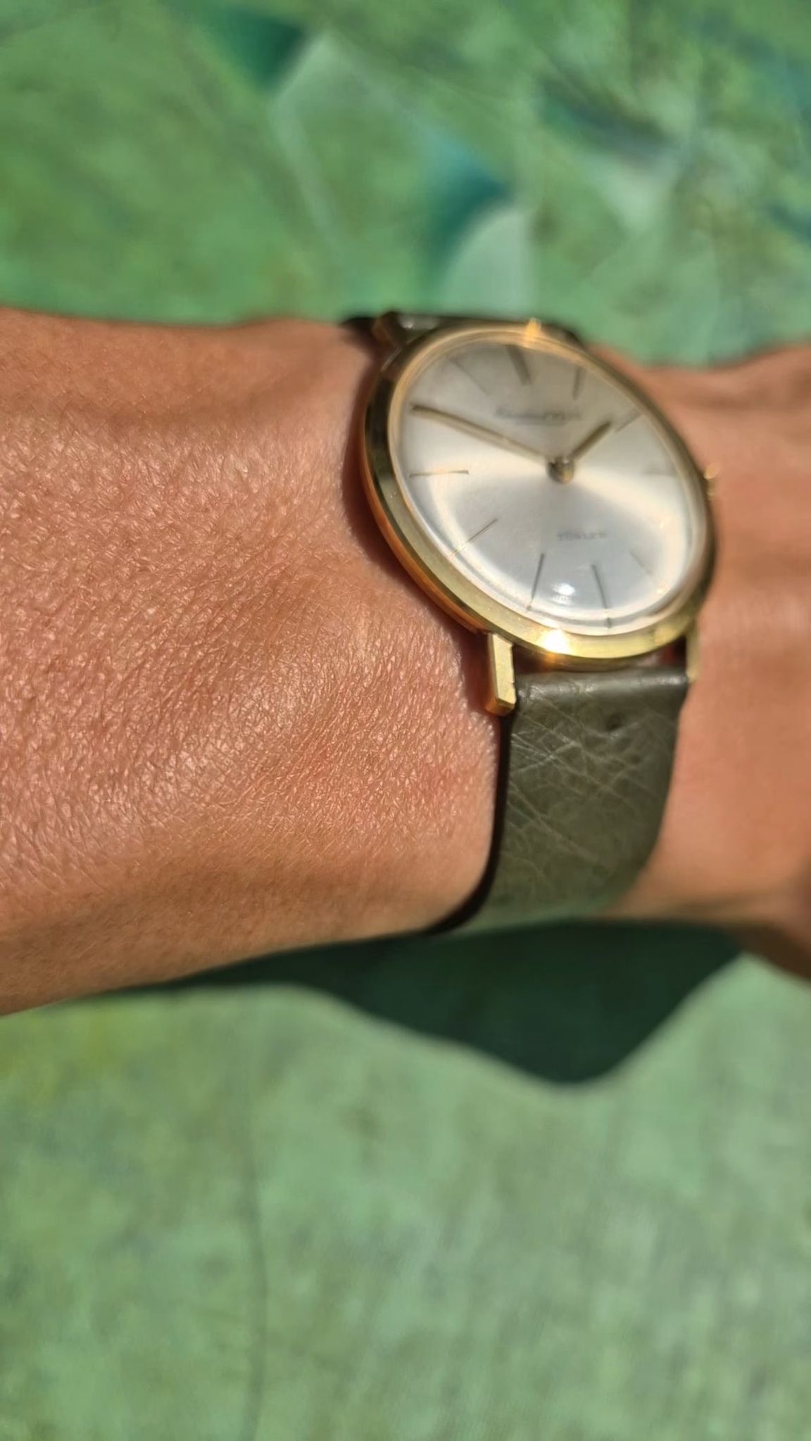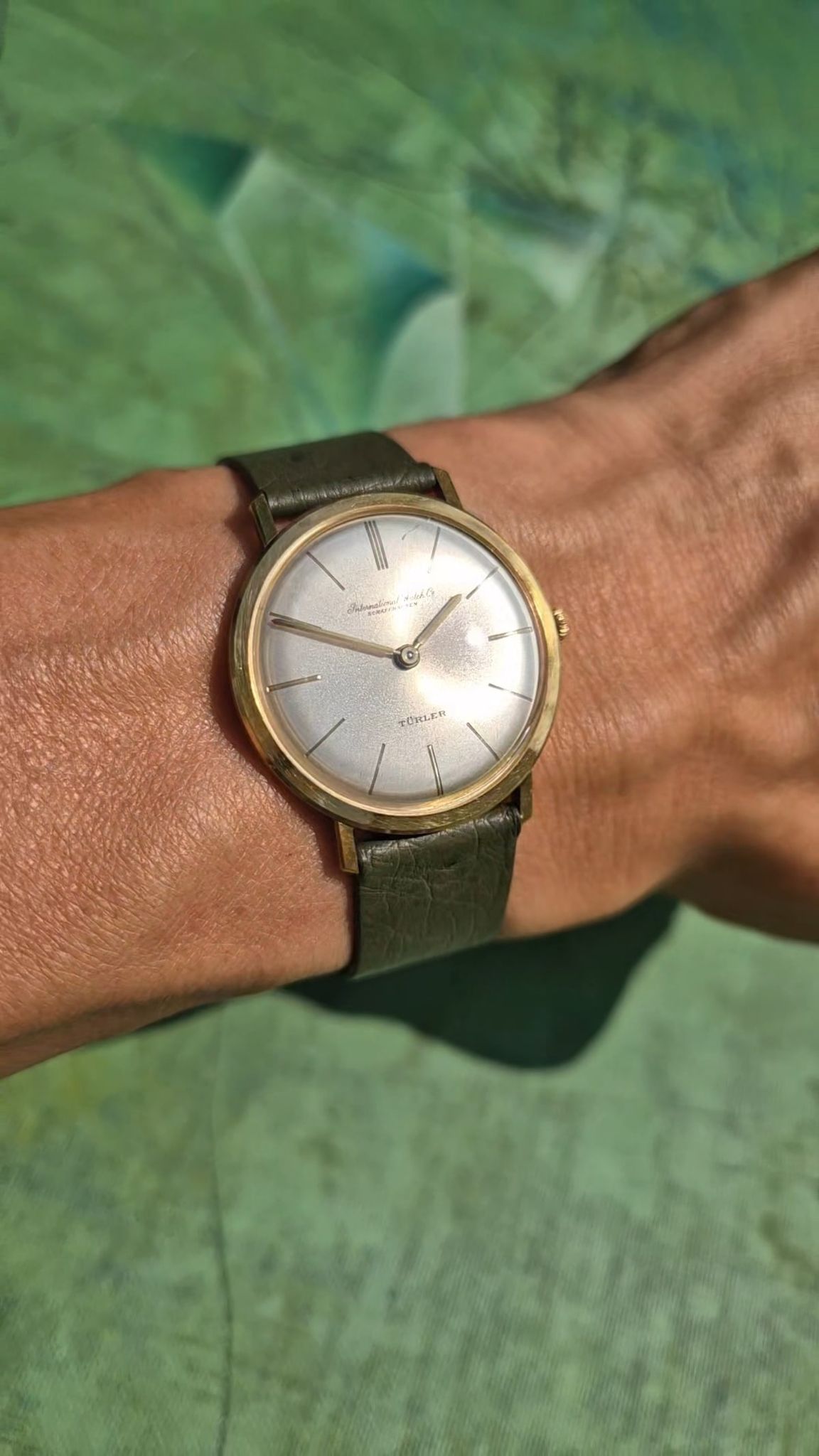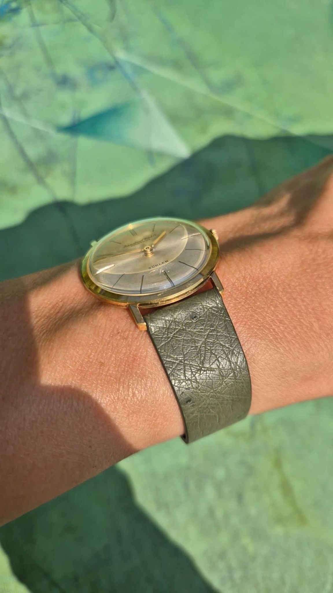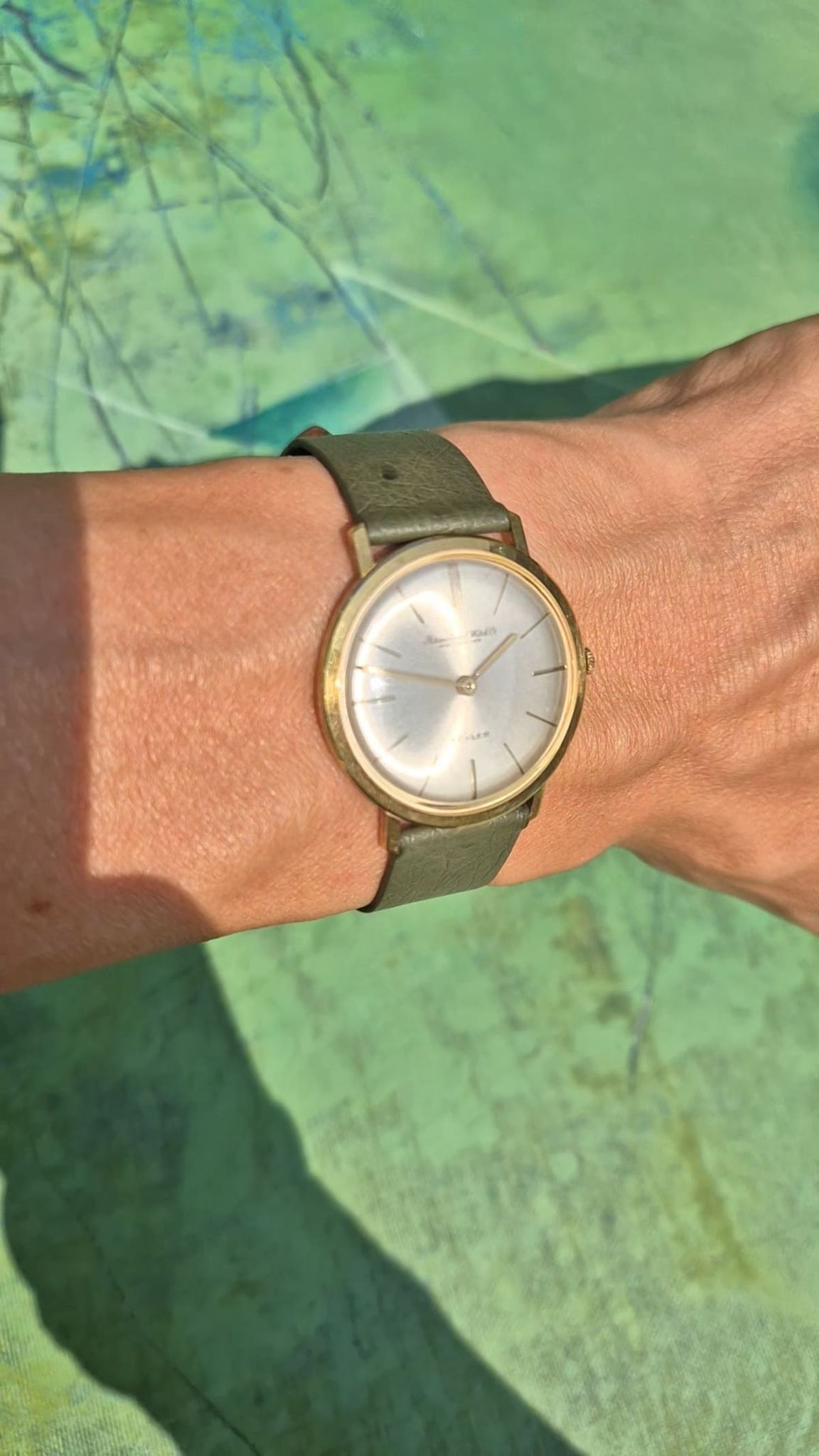 The popular and beautiful decorated manual IWC cal421 was serviced by us right now and works reliable and precise. We enhanced the watch by a custom-made dark-green ostrich-leather strap that connects the IWC-buckle. Case in a well preserved 18K-case, that appears to be unpolished (sharp and with hallmarks deep and present) and with a fine butter-brown patinae.