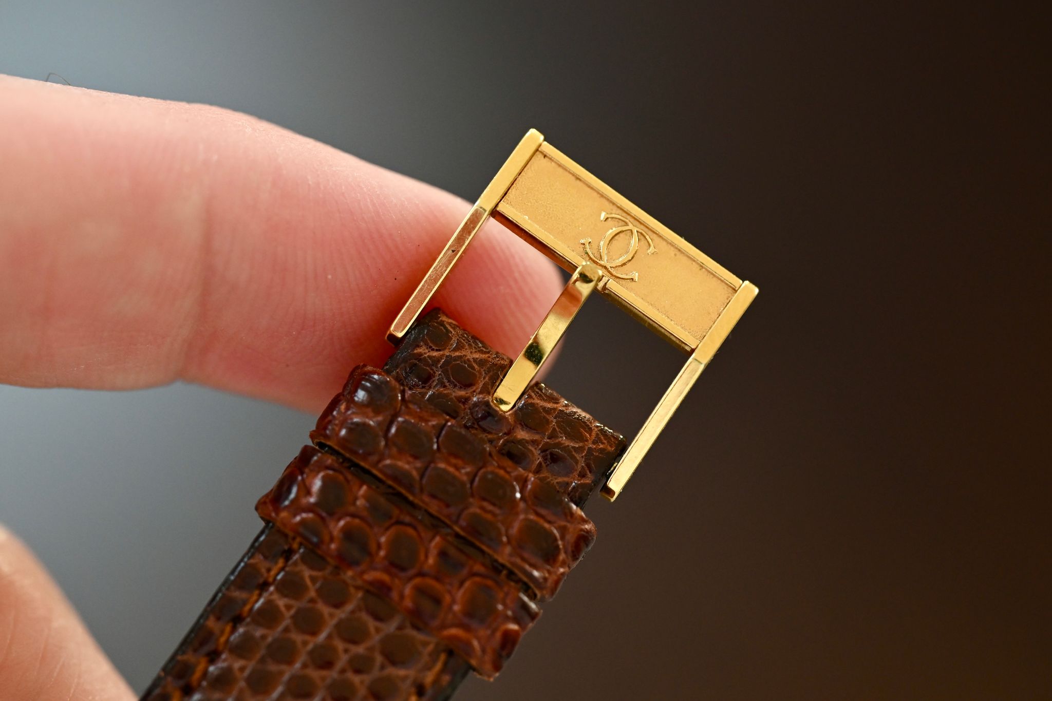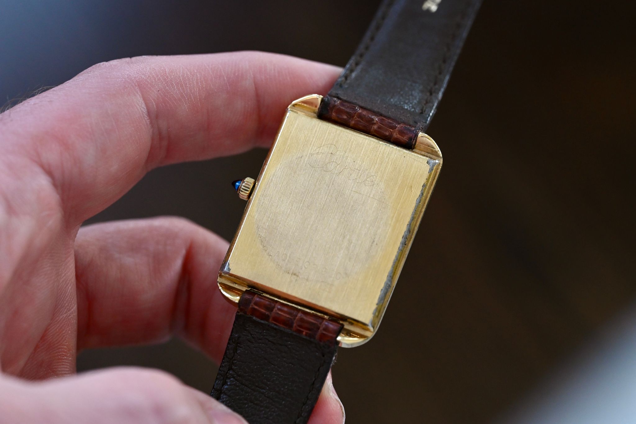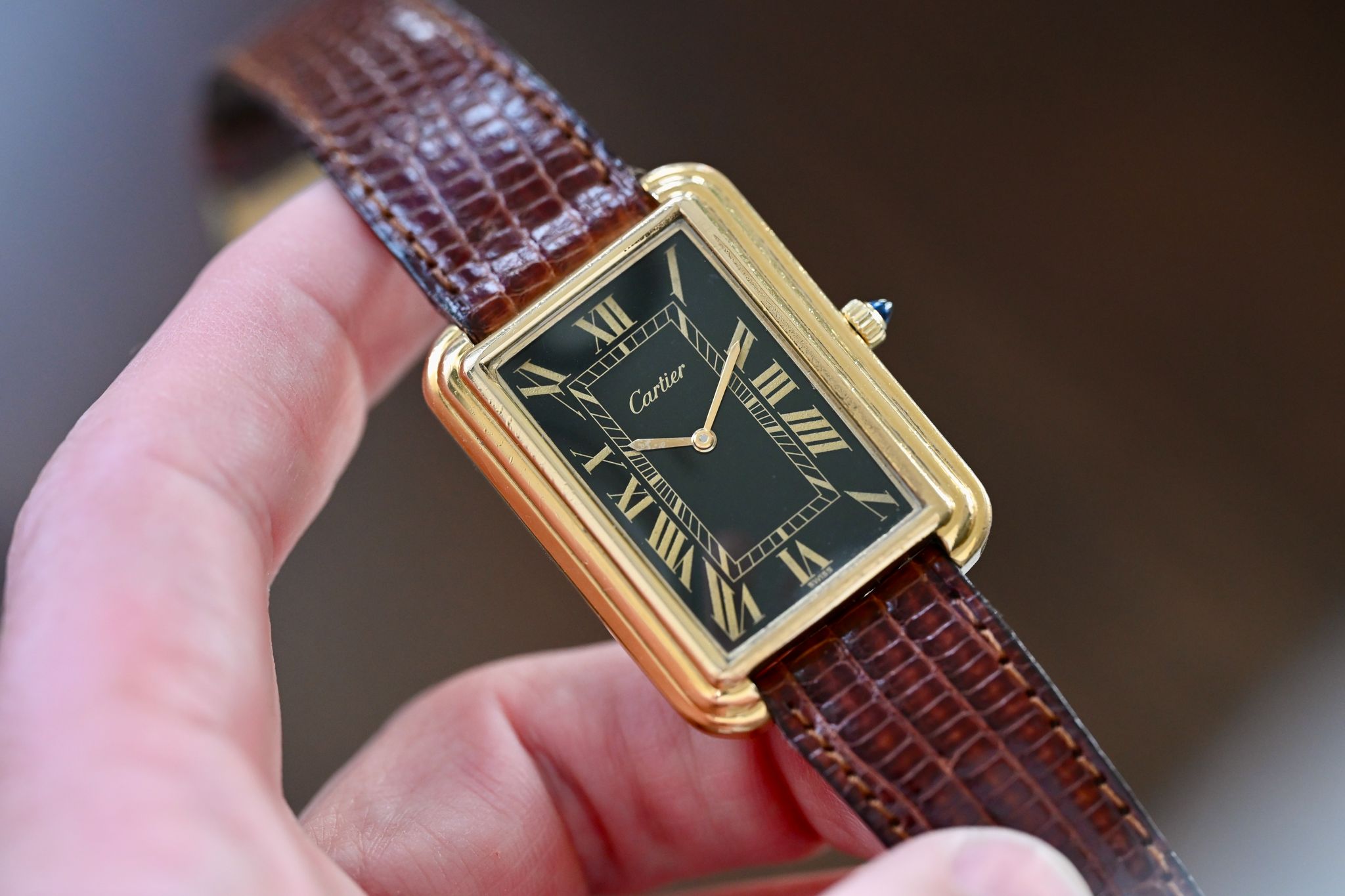 Rare Cartier Tank ‘Sport’ Jumbo darting to the mid 1970s. Featuring an oblong stepped case measuring 27x37mm which is electroplated to 20-micron of 18k yellow gold. With a stunning original black enamel dial and manually wound mechanical movement. This watch comes with original strap and buckle. These watches seldom come up for sale anymore and given the large size and rarity they have become highly coveted by collectors.