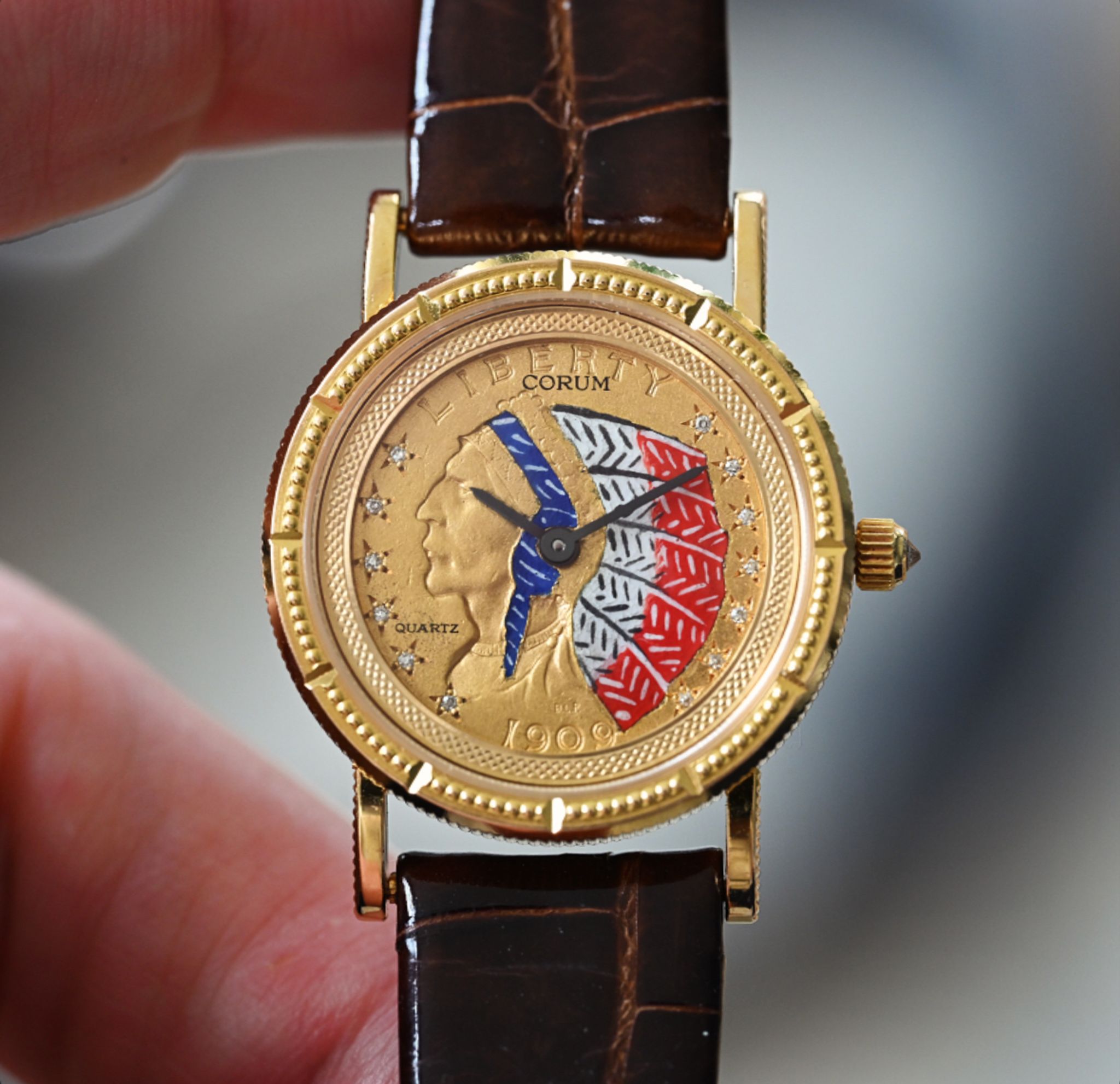 A rare ladies vintage Corum coin watch featuring an Indian head 2 1/2 Dollar piece with diamond set and hand painted enameling. Featuring a 26mm case constructed of solid 18k gold and quartz movment: This watch is all original, unpolished and in absolute mint condition with original strap & buckle
