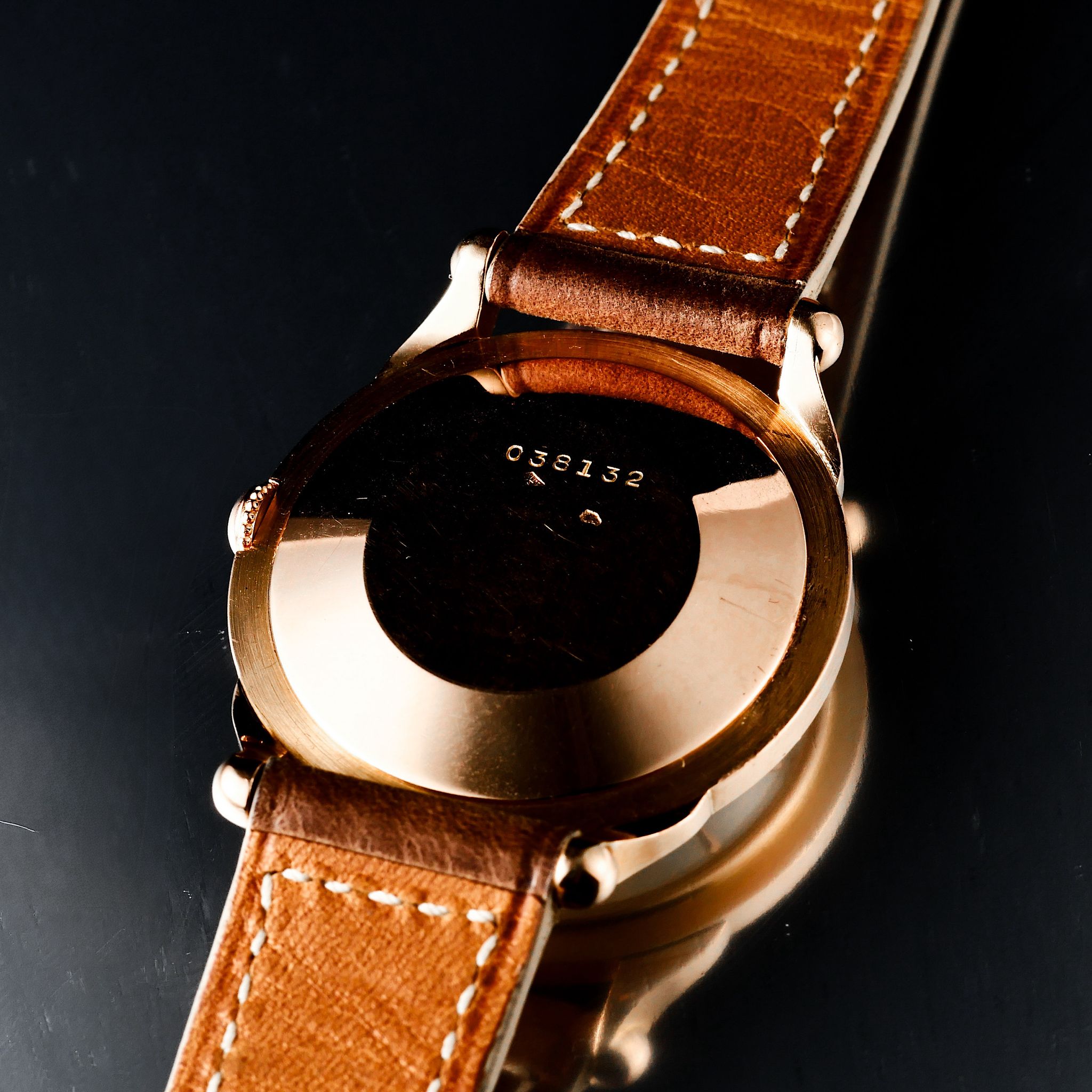 SPECIFICATIONS: 18k pink gold case, Non OEM leather strap, Rare violin lugs, Original, untouched two tone sector dial, Deep hallmarks, Very Fine and Rare.