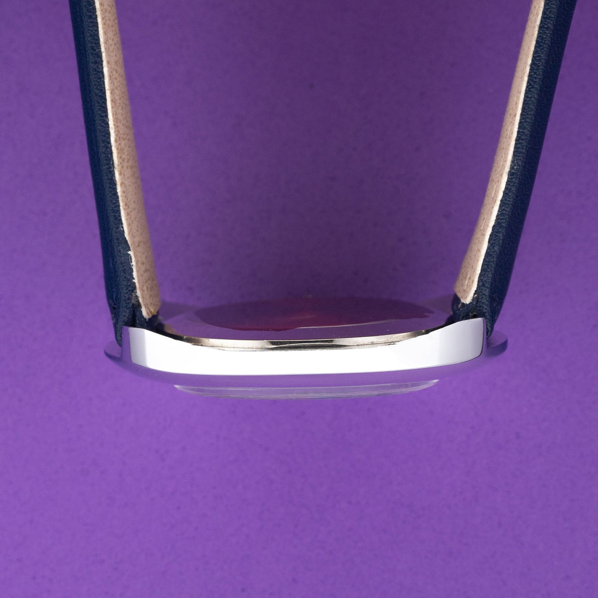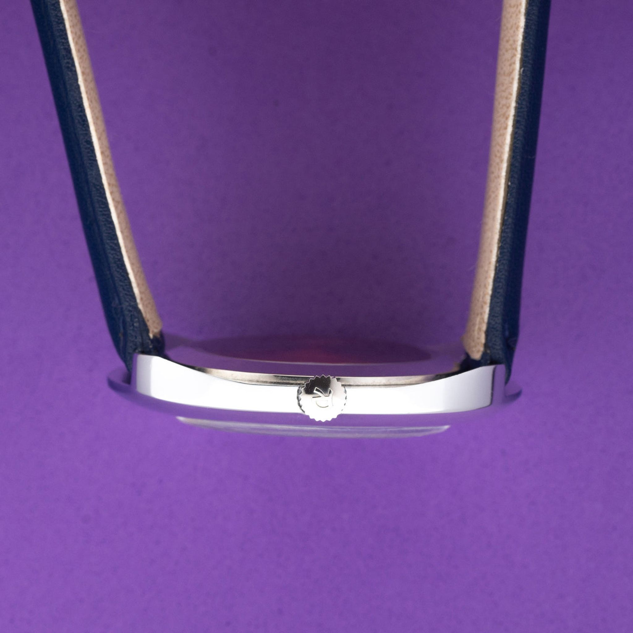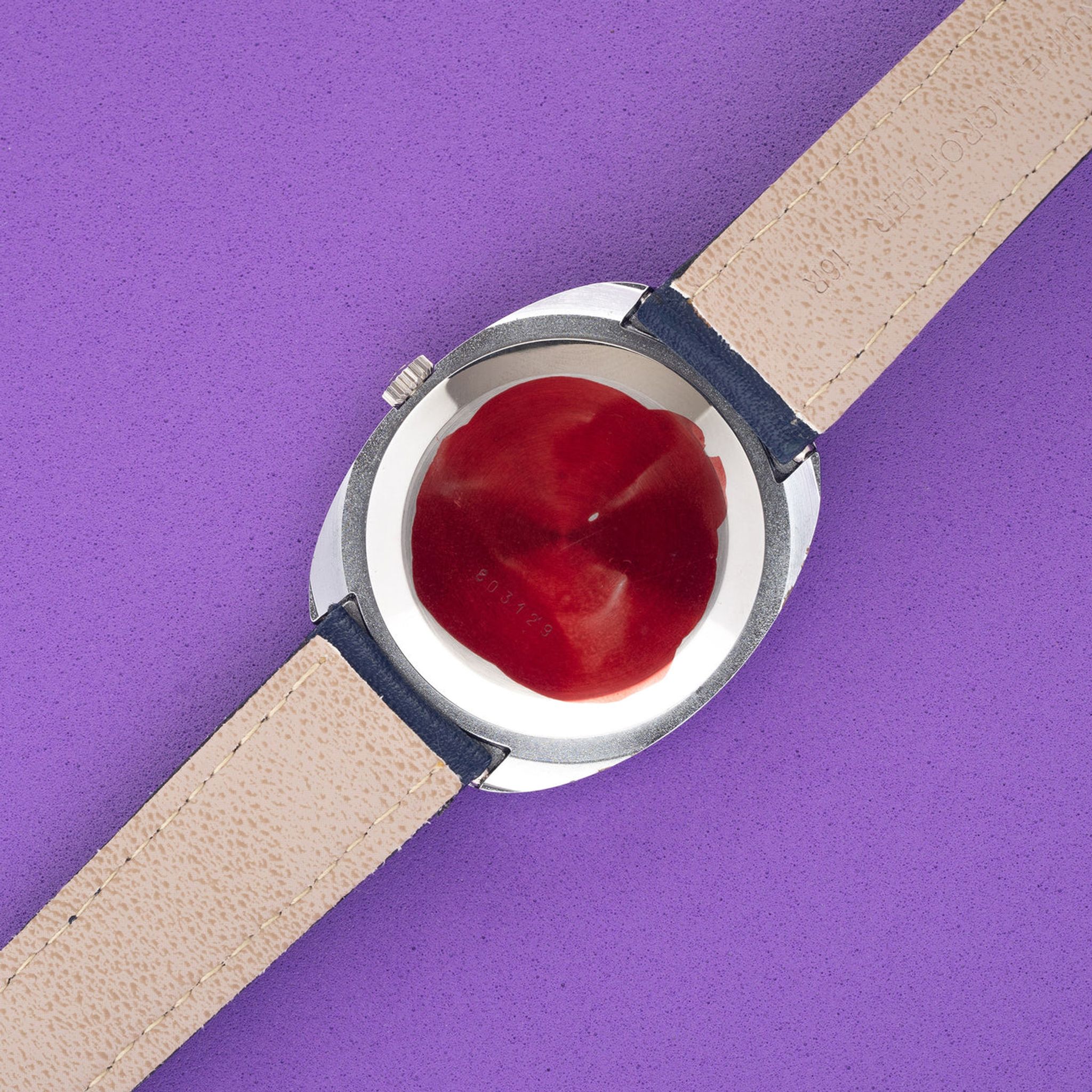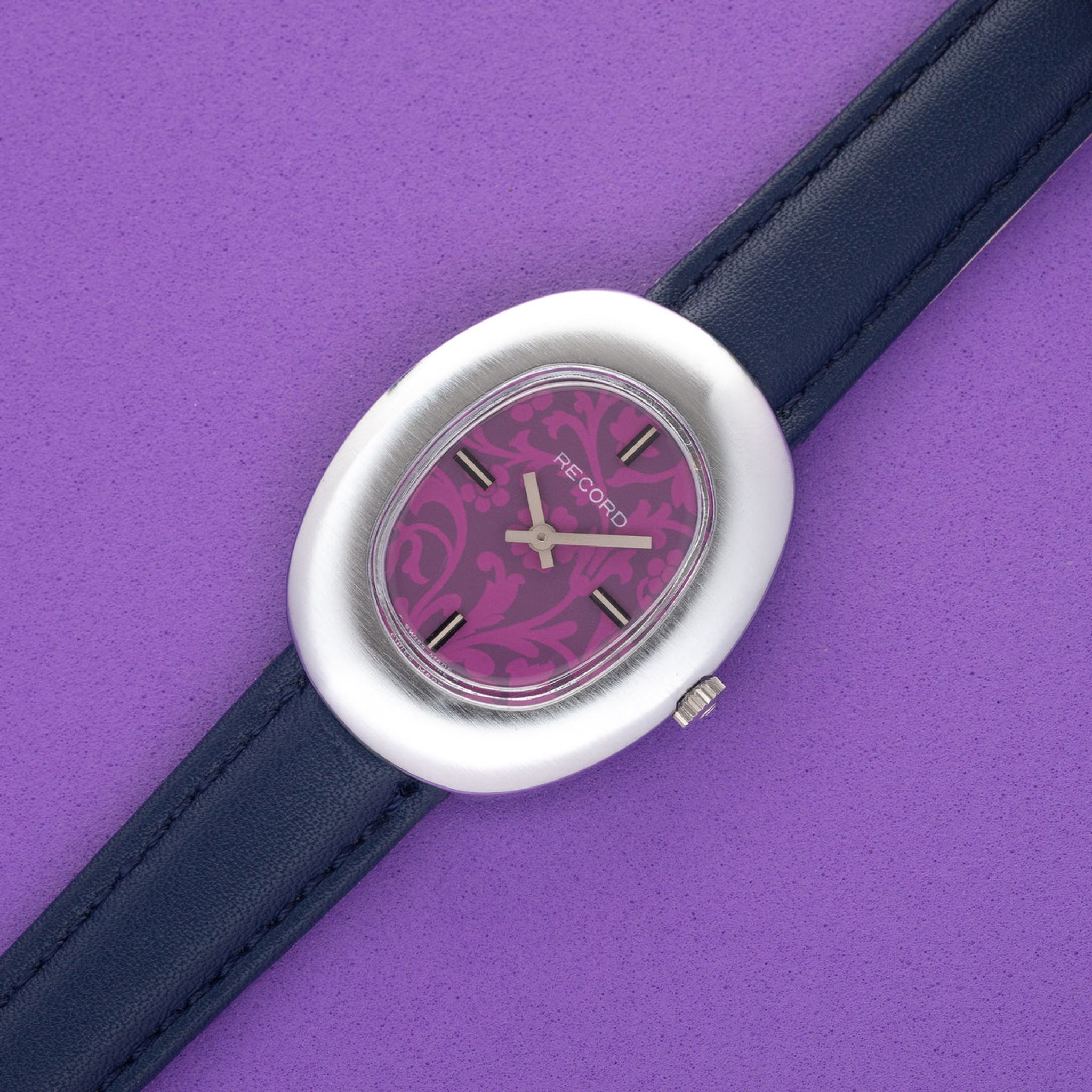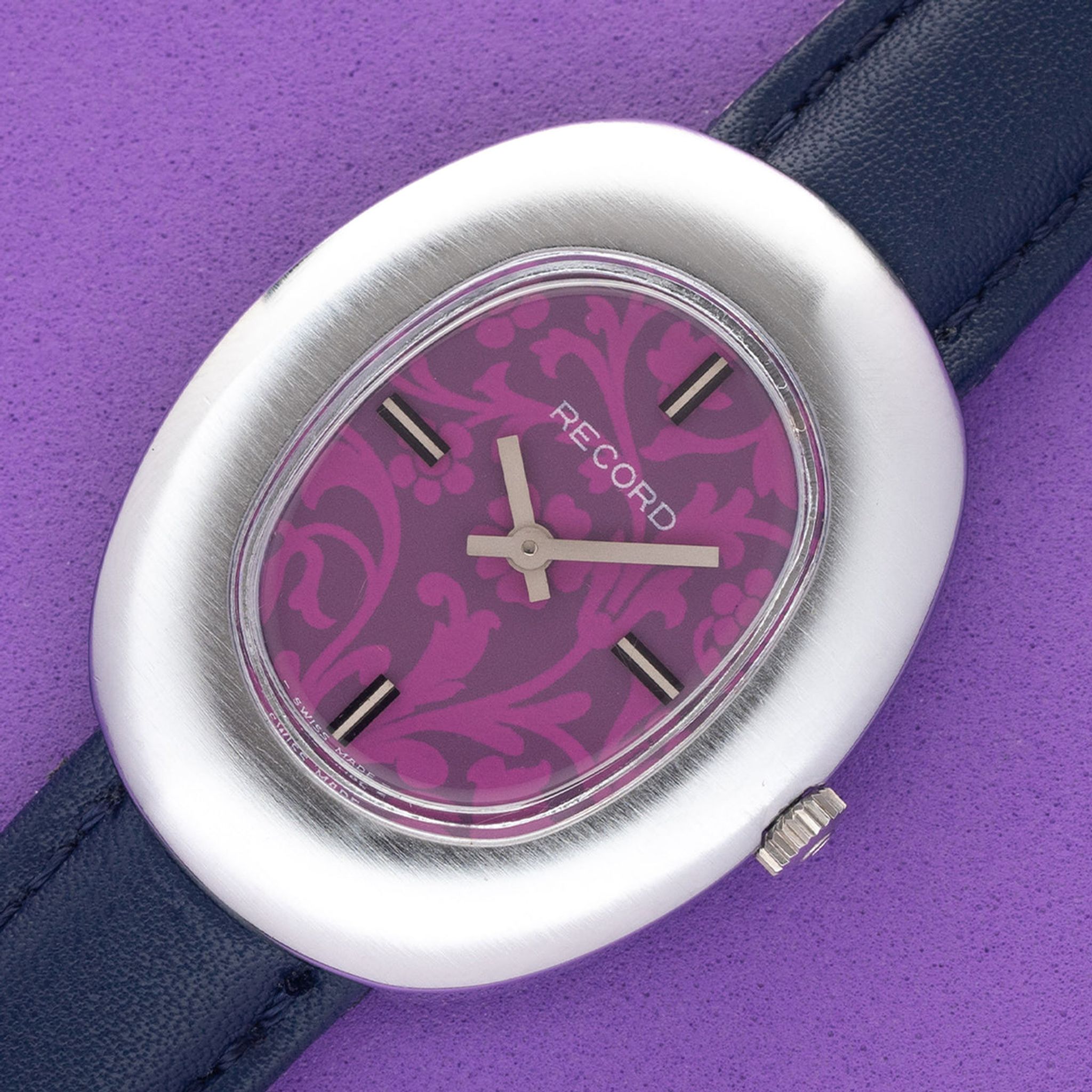 Not much is known about the Record watch company. It was acquired by Longines in 1961 and there are other examples of their pieces with both brand's signatures. This particular Record "Baignoire" however falls into the "find me another one" category as we legitimately have not been able to find documentation of another example. That said, there is one other example of this watch with both Longines and Record on its dial. We happen to prefer the cleaner look of this one having just Record. Not only does this piece remain in incredible "new old stock" condition, it just came back from an overhaul so its ready to rock for years to come. With its purple floral printed dial and quintessentially 1970's aesthetic, this one makes for the perfect conversation piece for anyone who loves design focused watches.