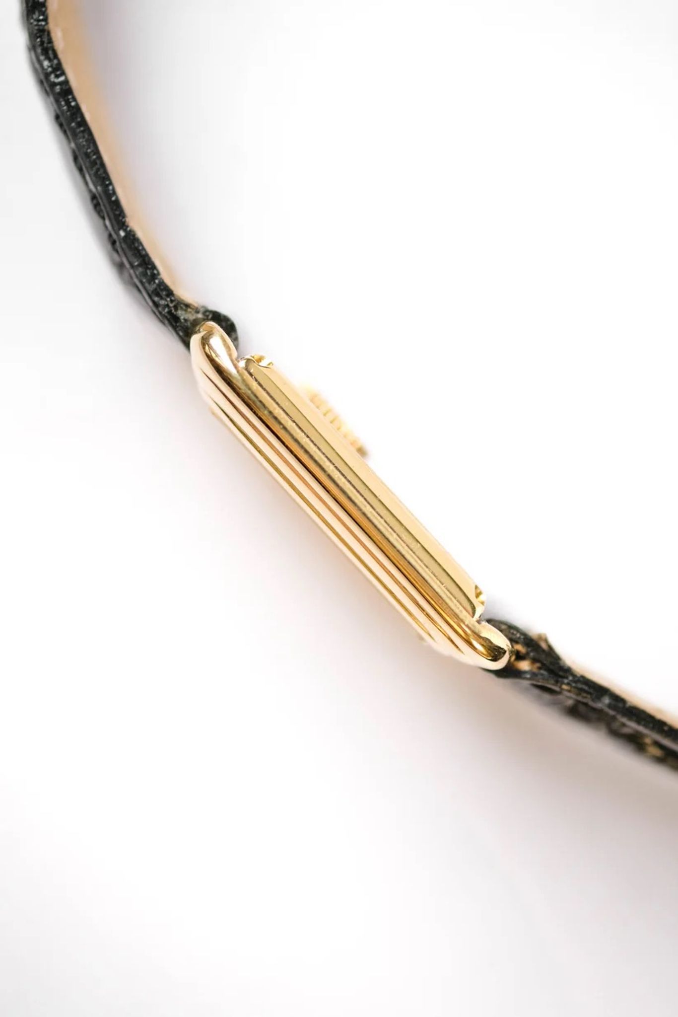 18-carat yellow case. Leather strap. Unsigned buckle.