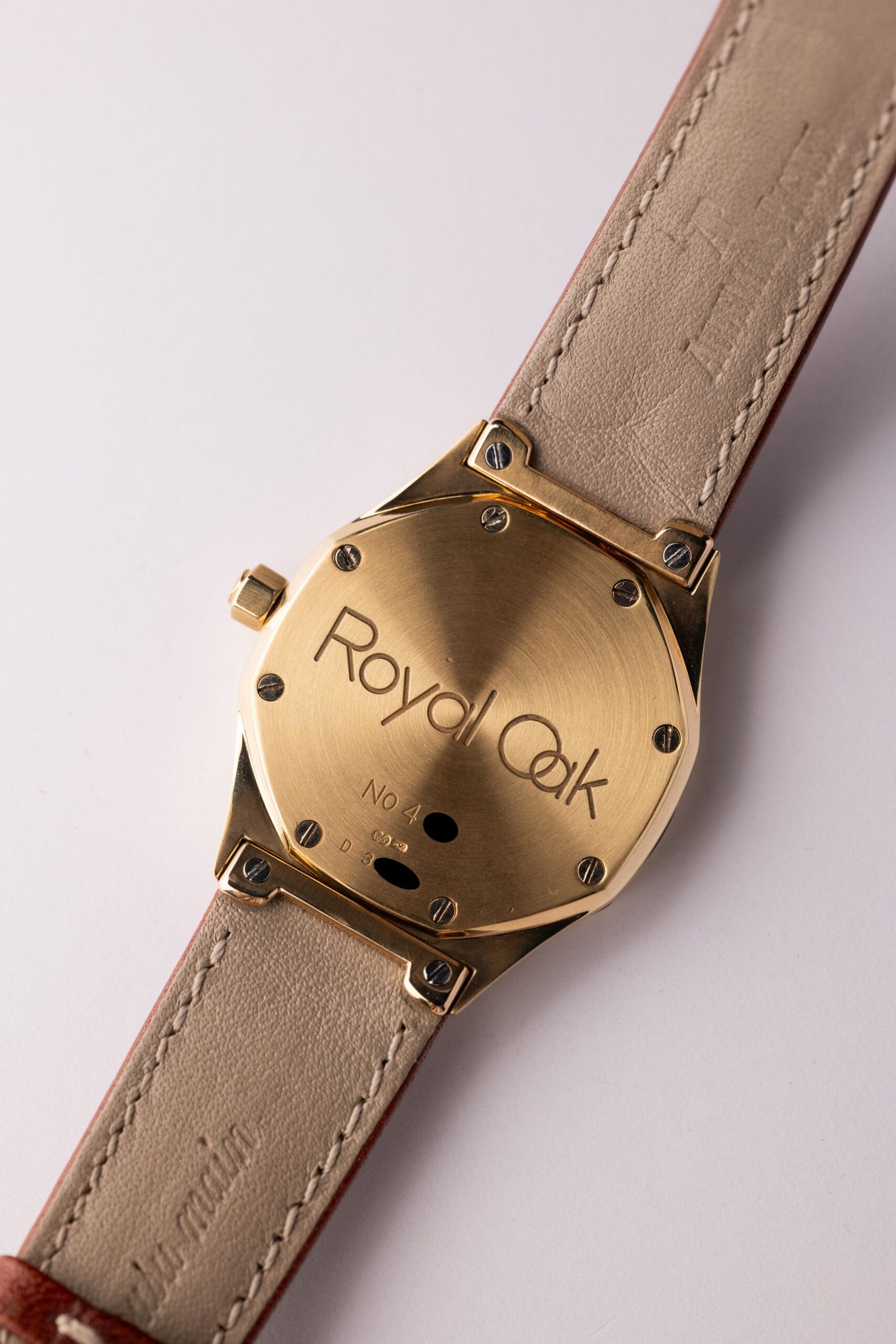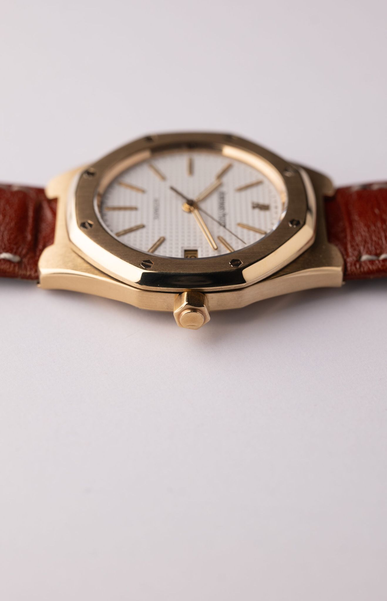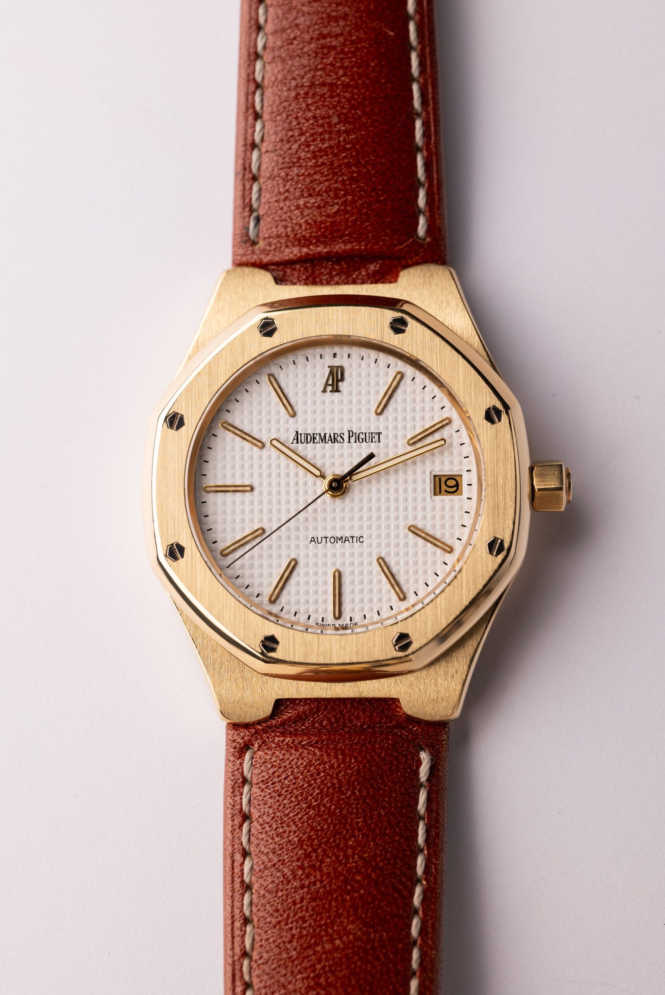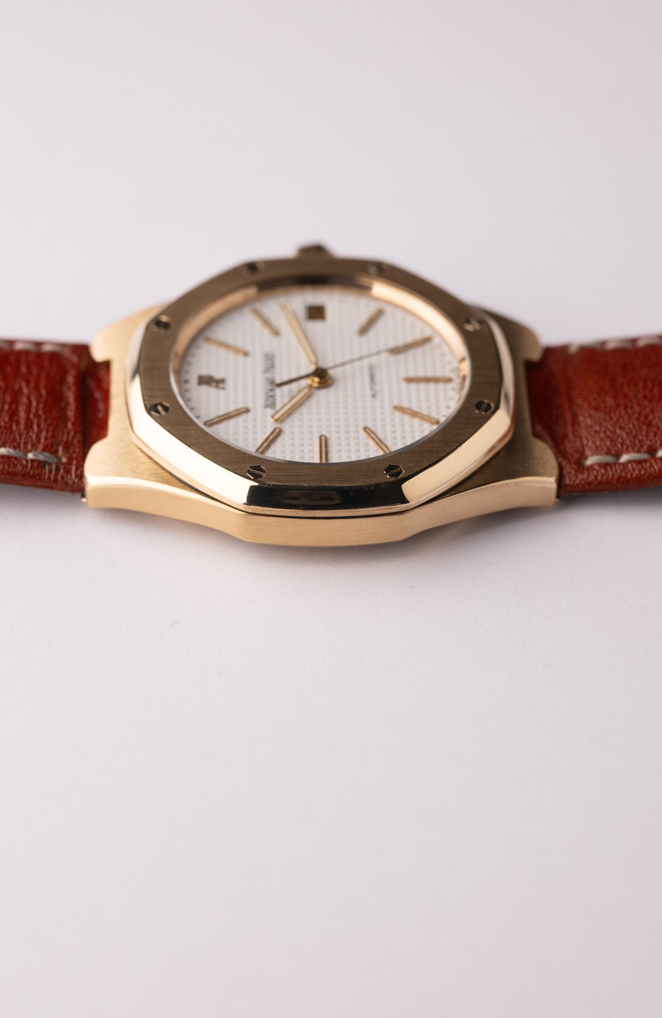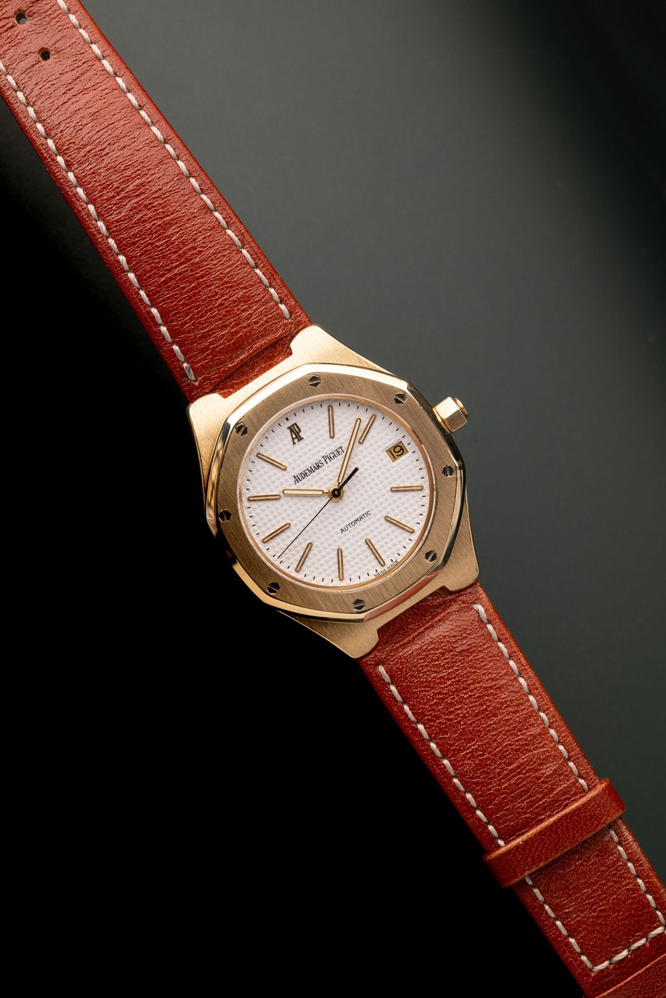 Introduced in 1992, the Royal Oak on strap, without an integrated bracelet, came out years before the Aquanaut. White Stern-made dial contrasts nicely with 18k Yellow Gold case with creamy lume.