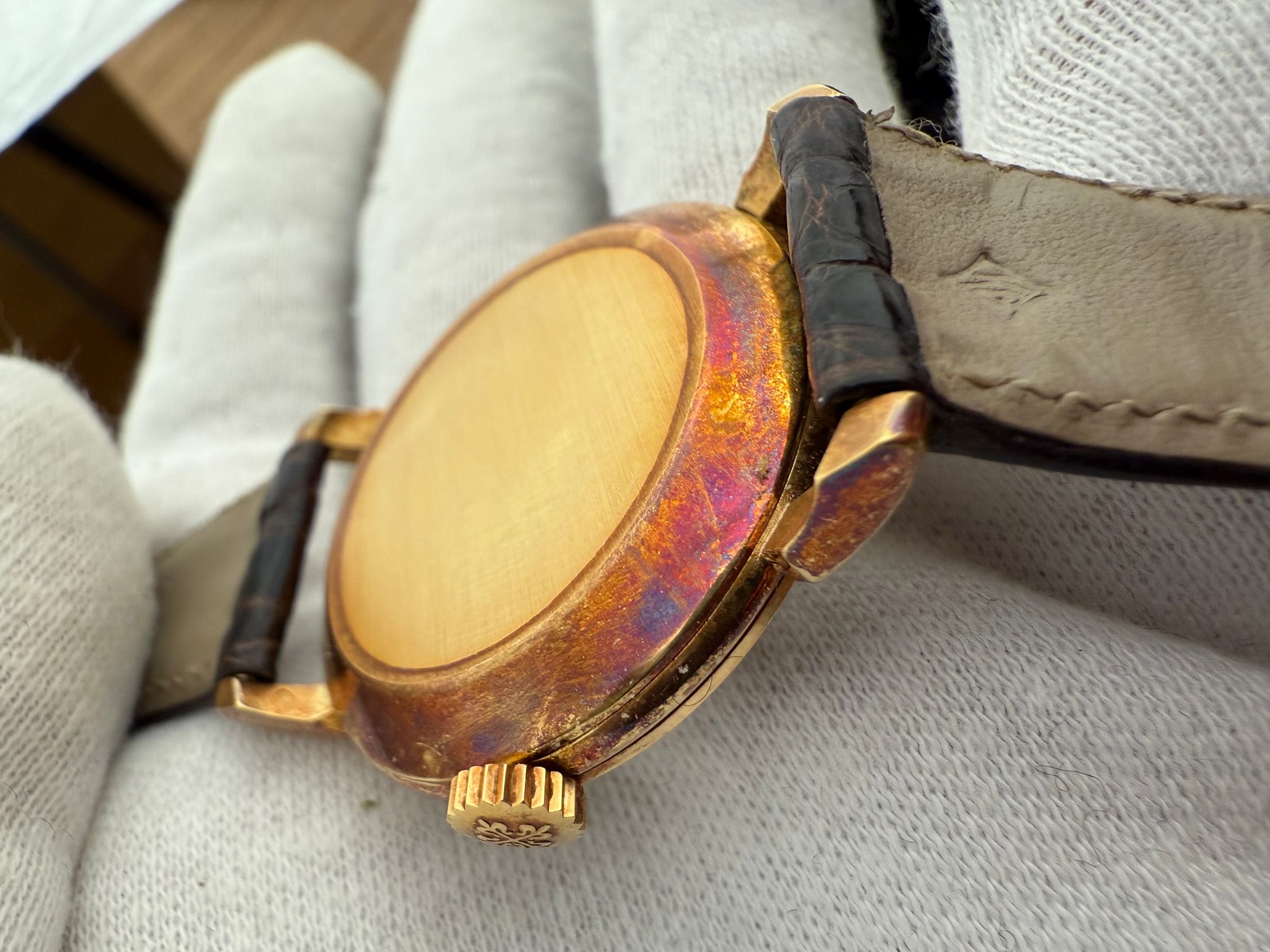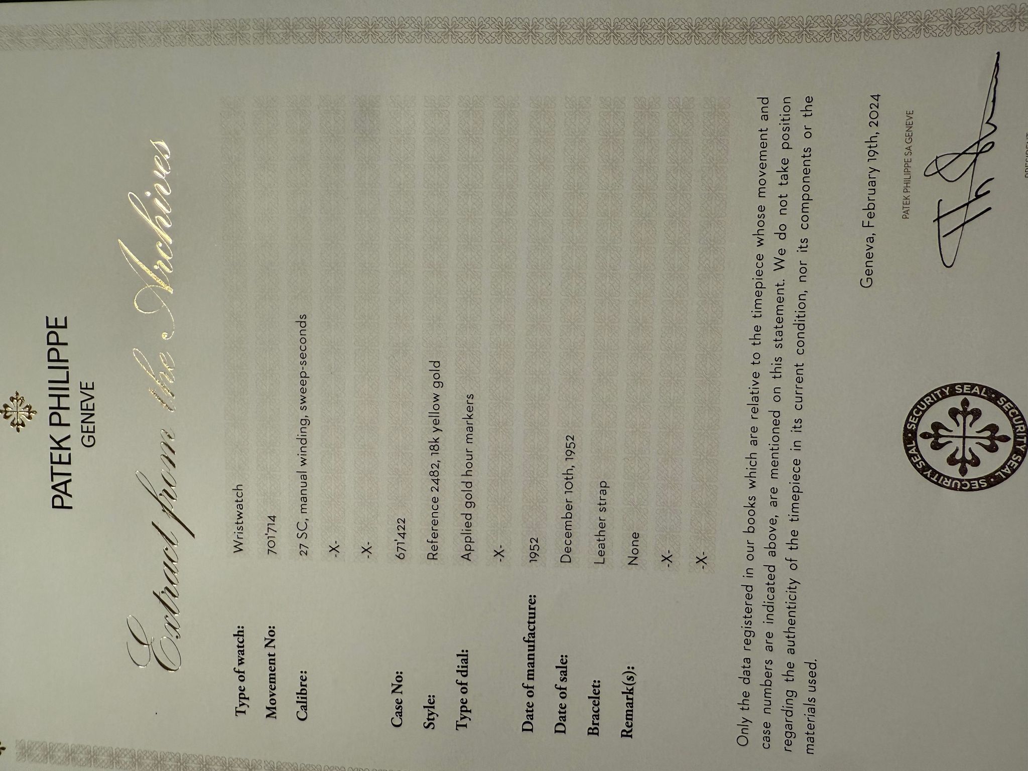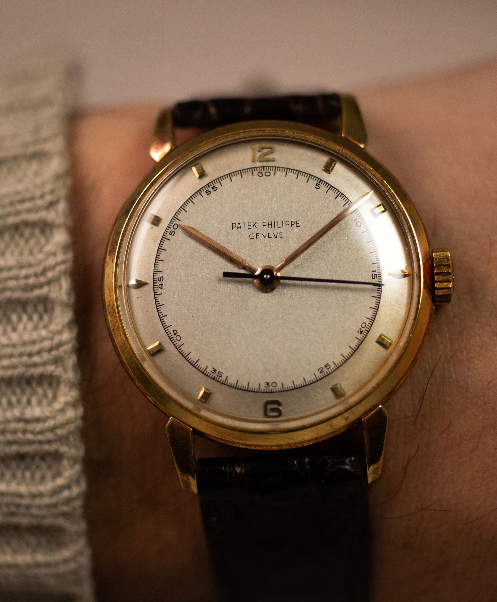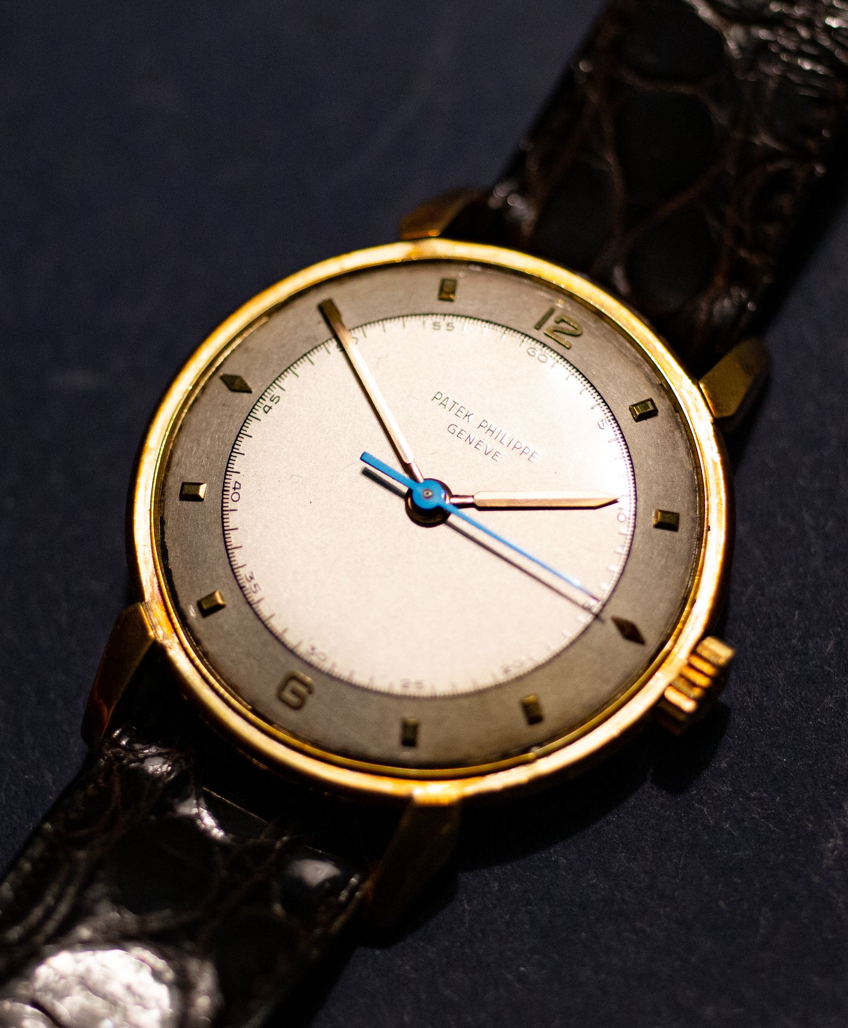 This is a rare Patek Philippe reference 2482. It's a lovely reference with a two tone dial and nice lugs. The case is large at 35.5mm and has very cool oxidation throughout! The watch also has a Patek strap, buckle, and archive.
