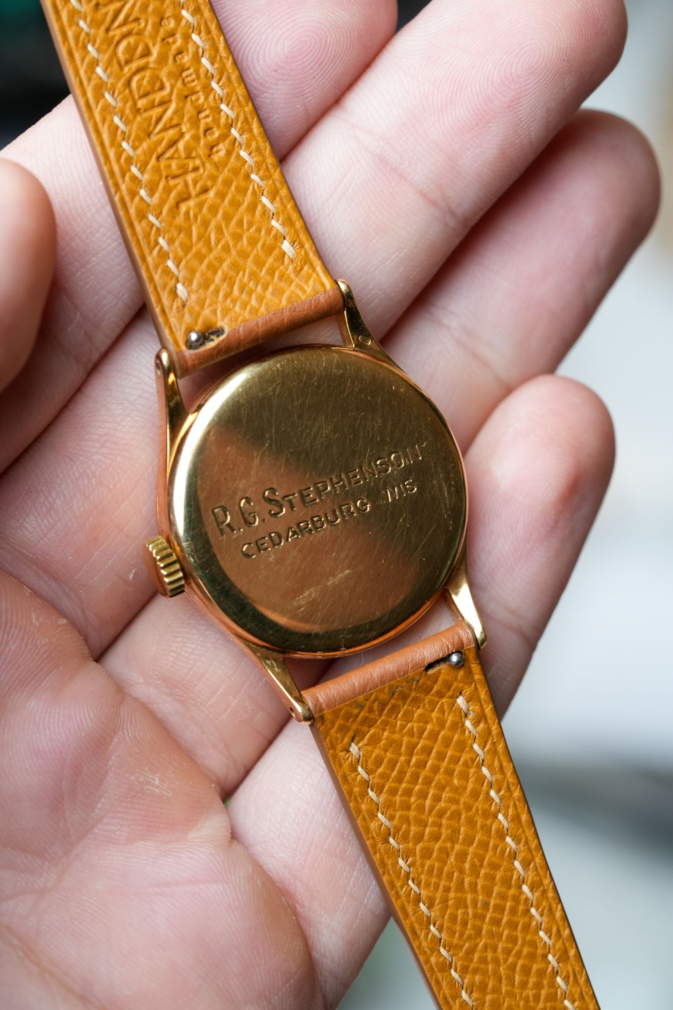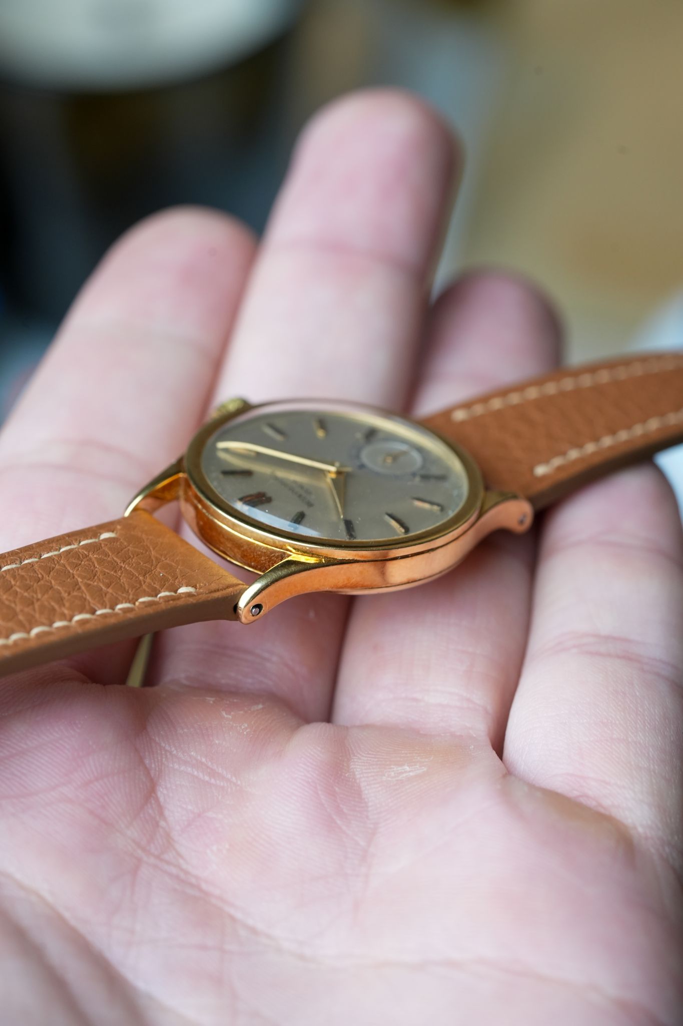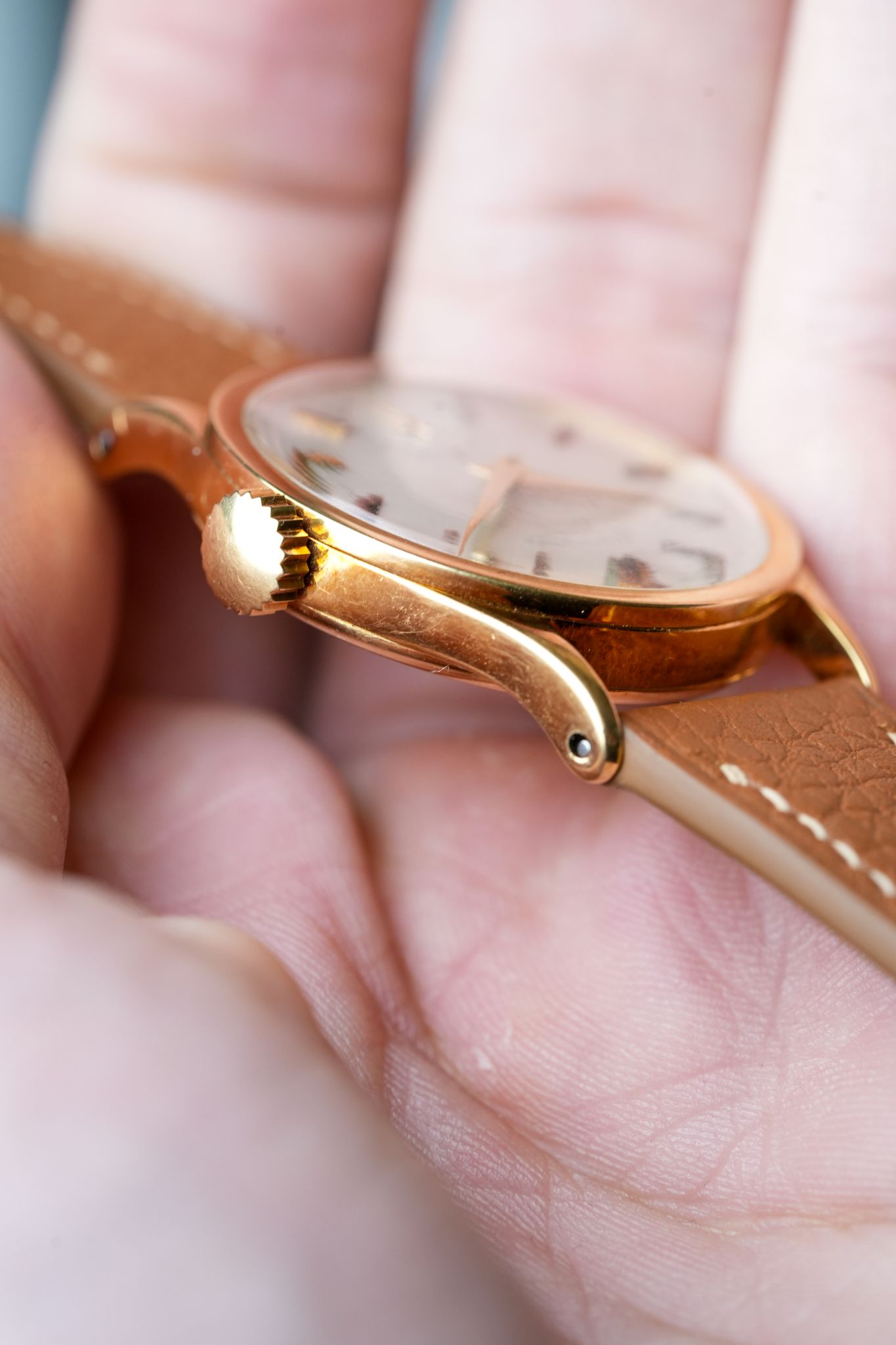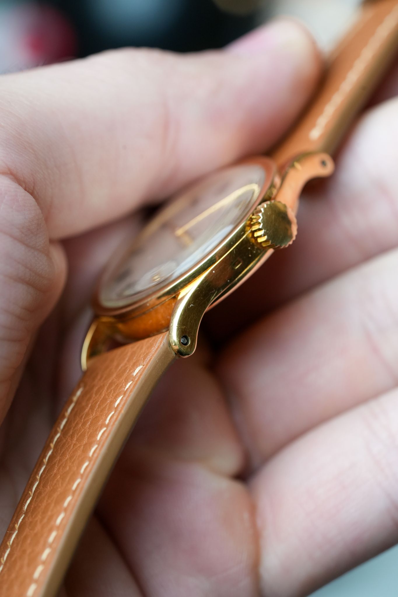 Patek Philippe’s famous reference 96 Calatrava. This example dates to the 1940s and features a desirable “long signature” in raised hard enamel. The watch is preserved in overall good vintage condition and looks as good today as it did 80 years ago.