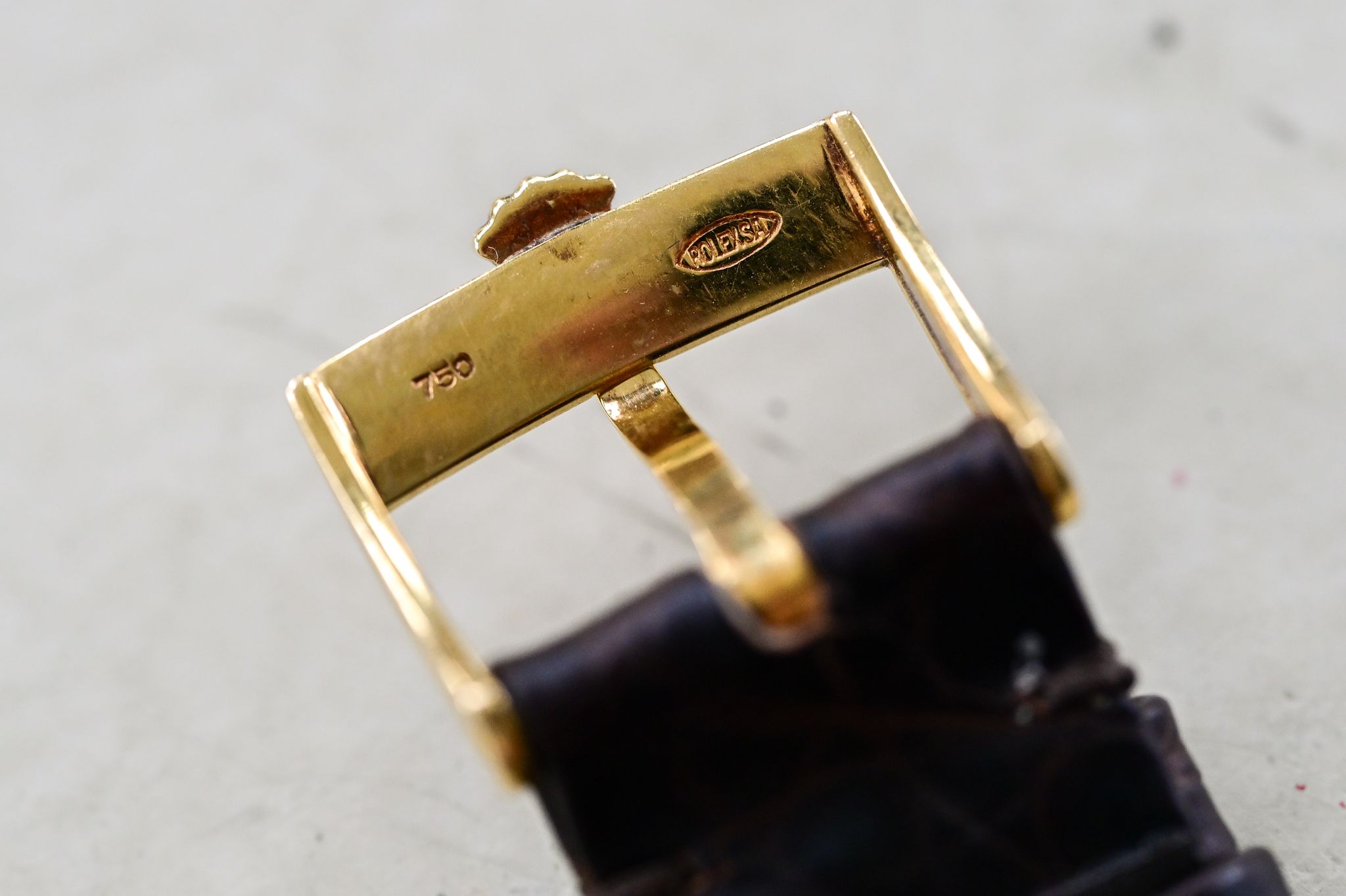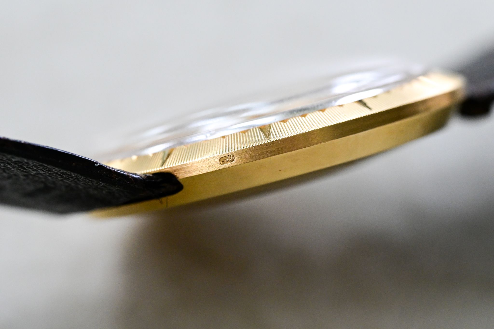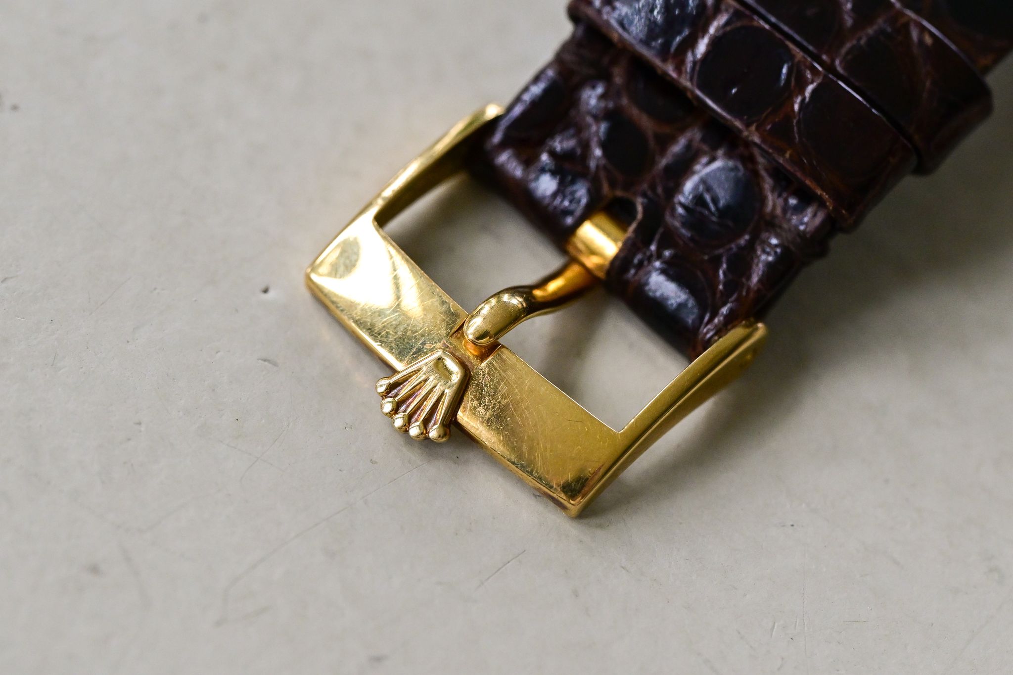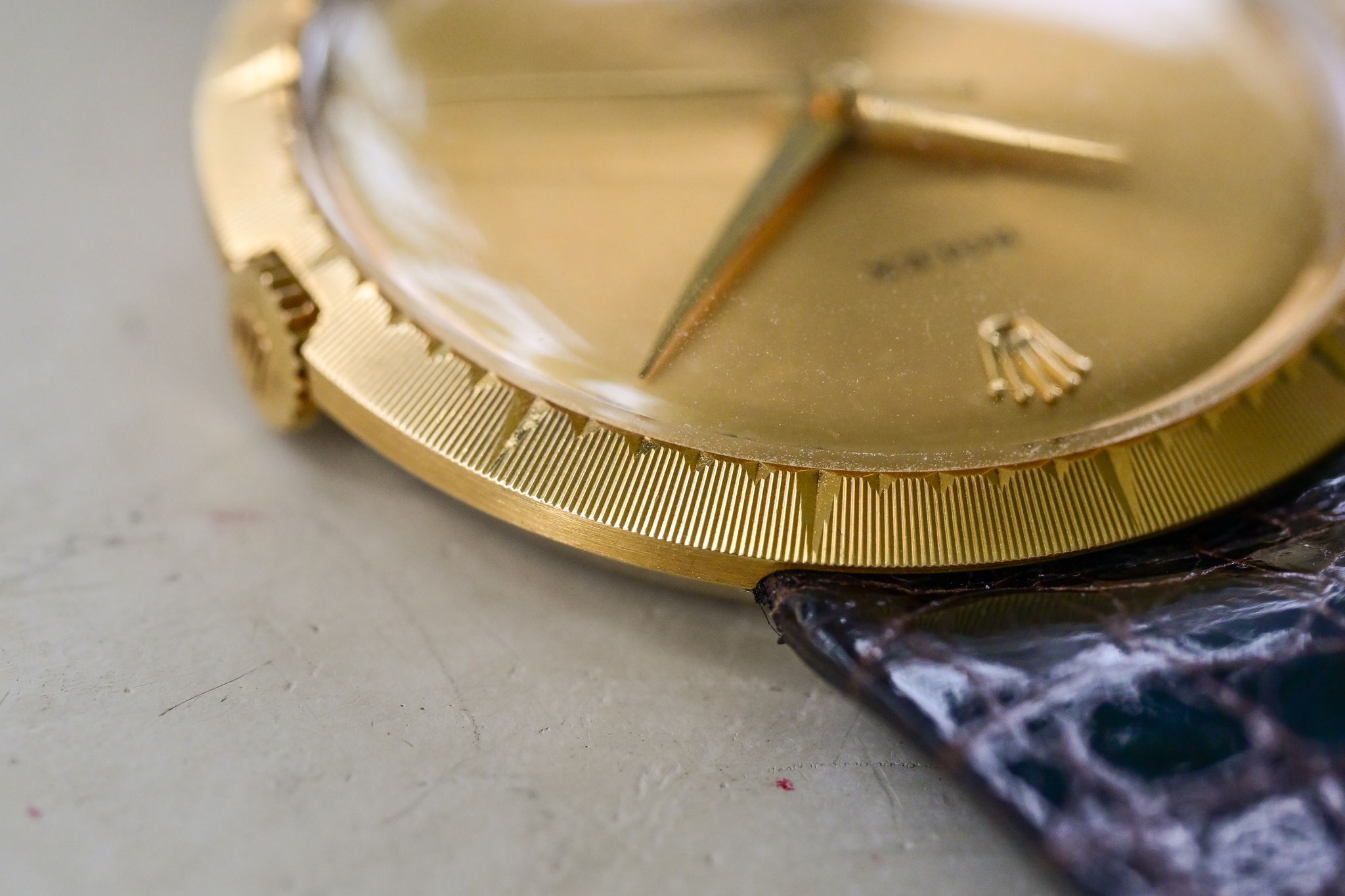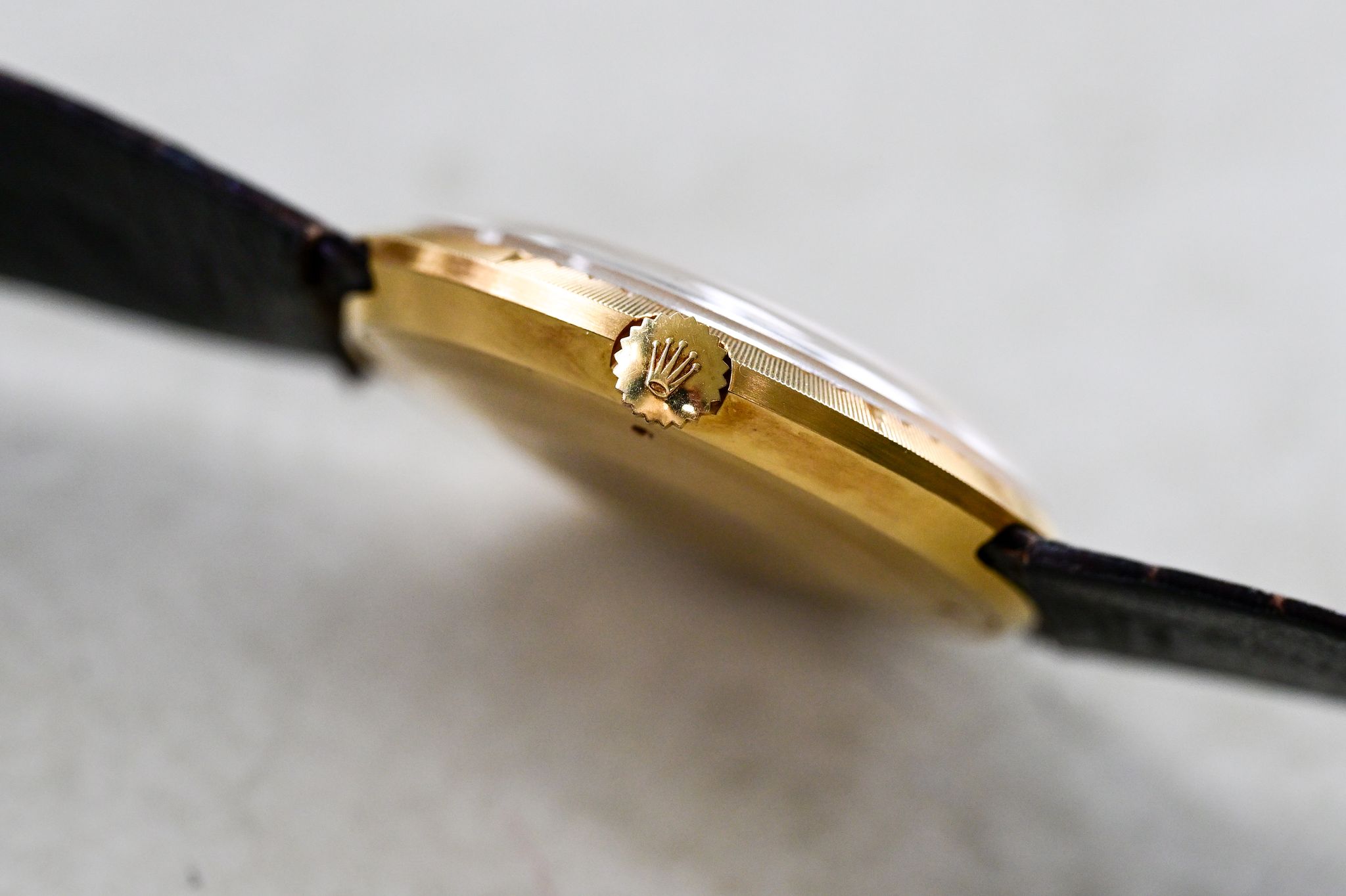 A rare vintage Rolex ref. 9919 dating to 1967! This watch features an 18k yellow gold case measuring 36mm, matching radially brushed gilt dial with dauphine hands. Inside beats a lovely manual wind Rolex cal. 1215 movement. This watch is all original with a sharp case, tucked in crown, signed strap and 18k gold Rolex buckle.