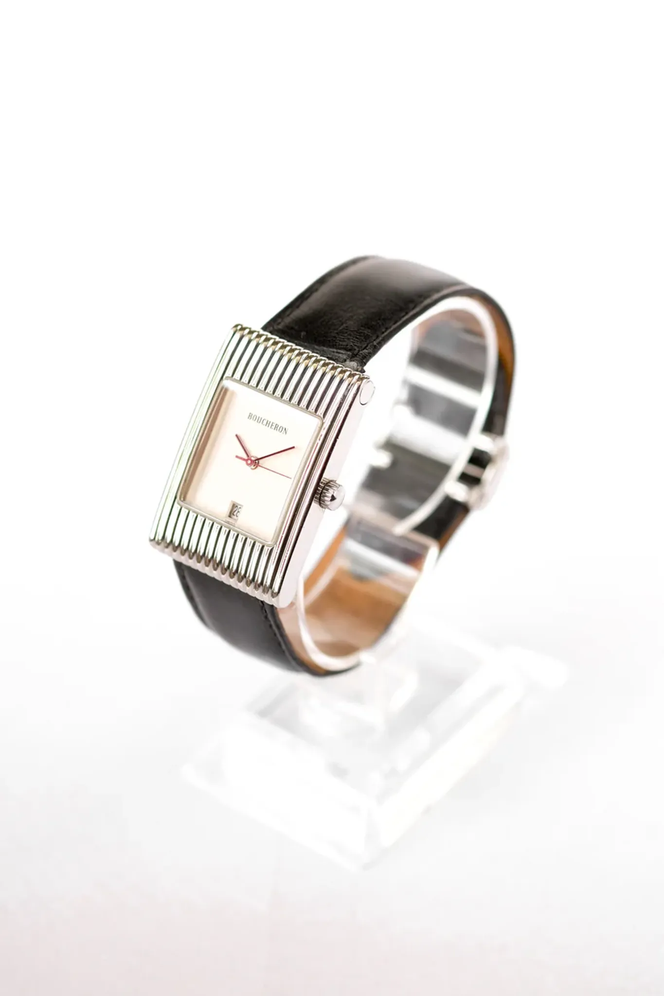 Steel case. Boucheron steel and leather bracelets (leather one to be changed). Boucheron box.
