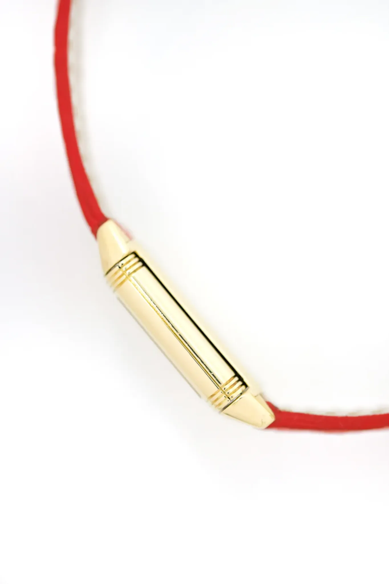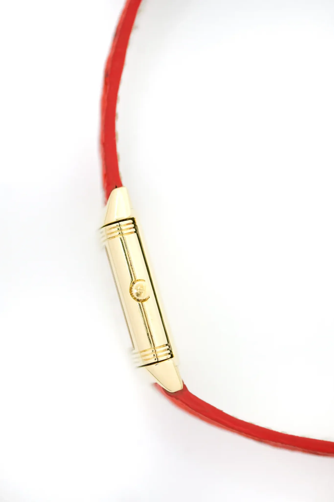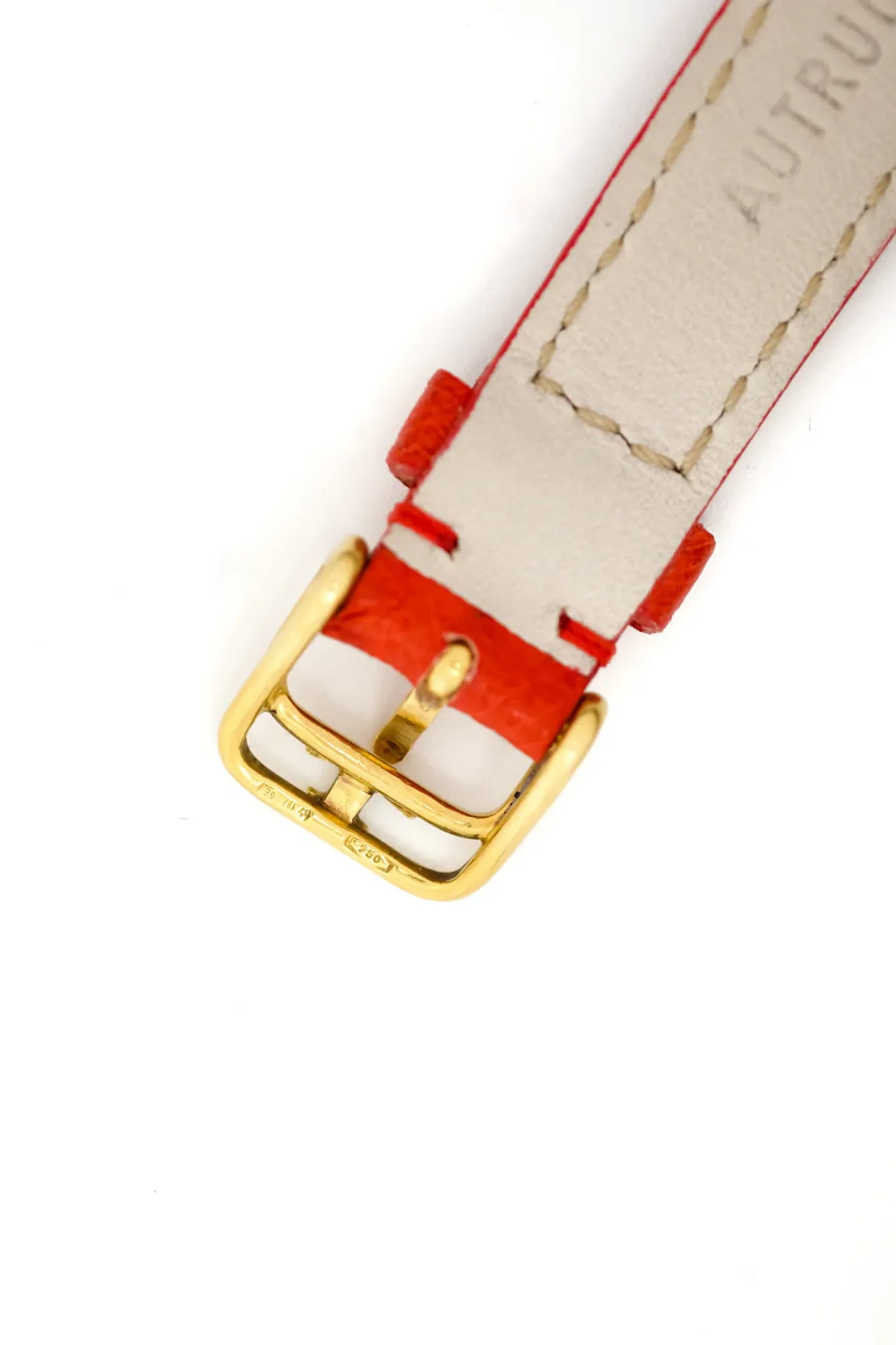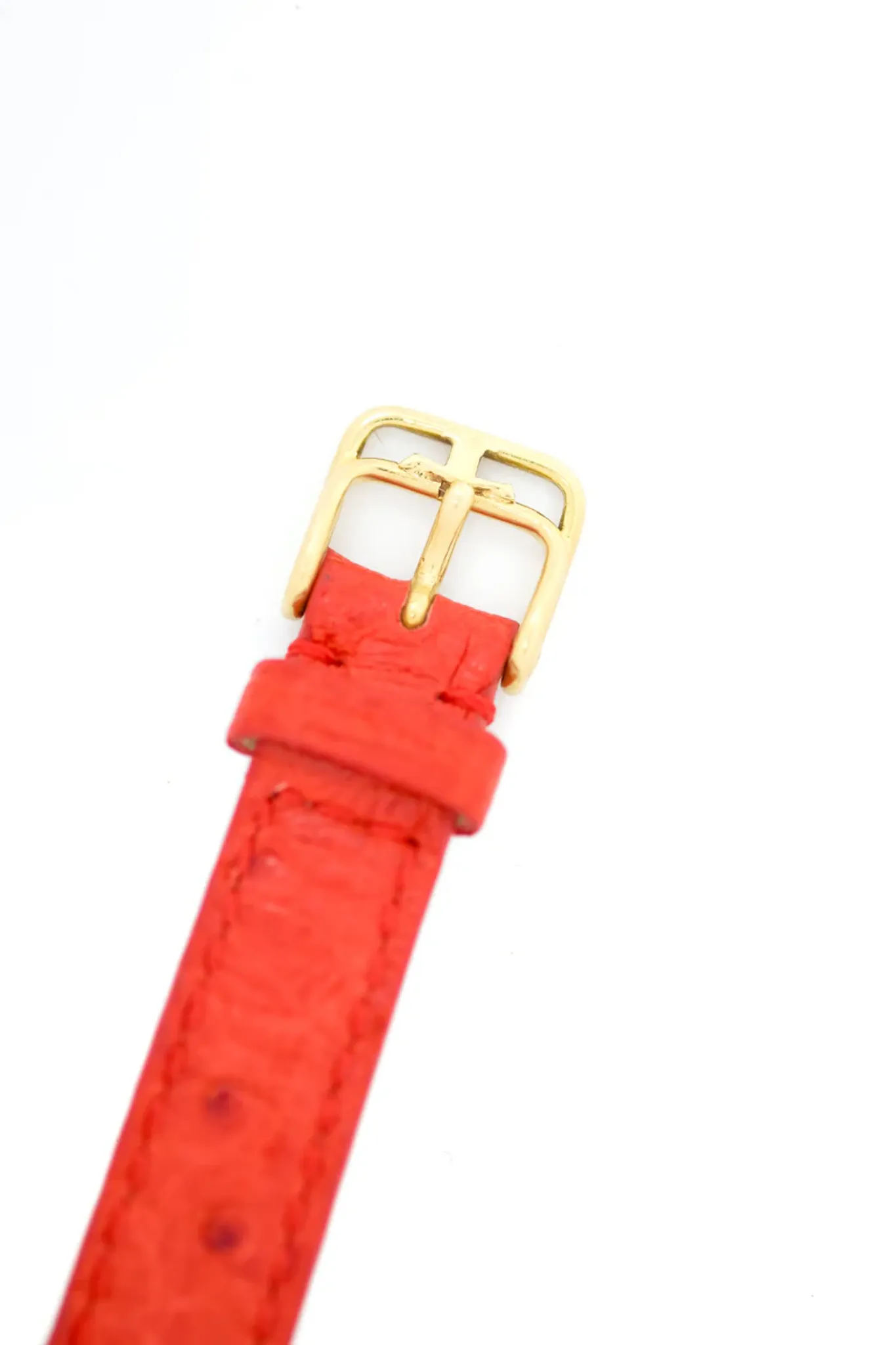 The signed red ostrich strap contrasts perfectly with the yellow gold.
