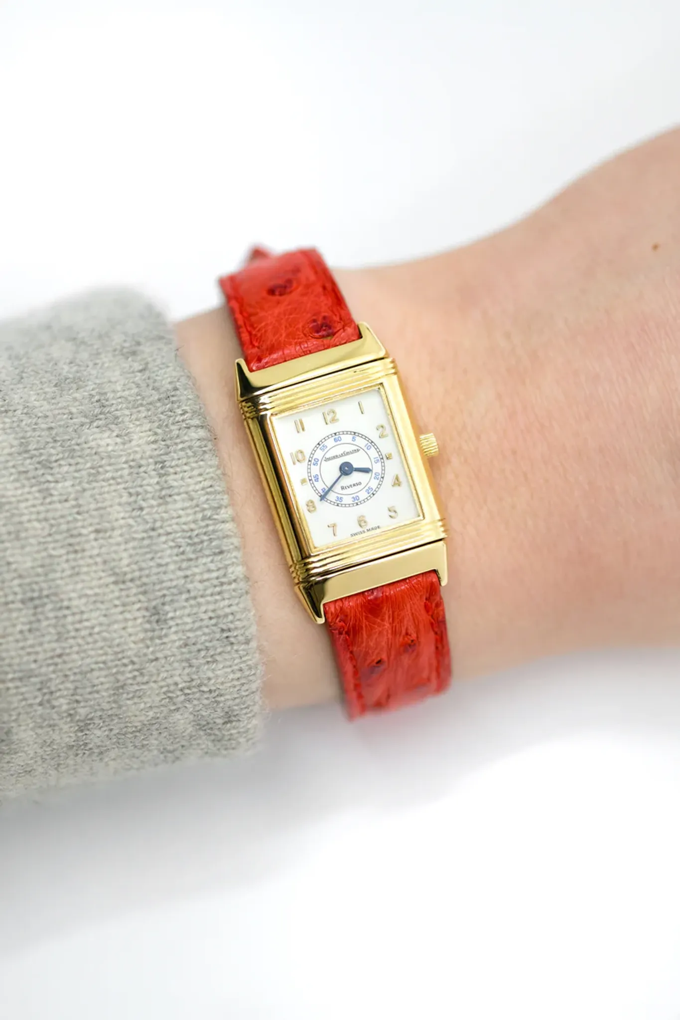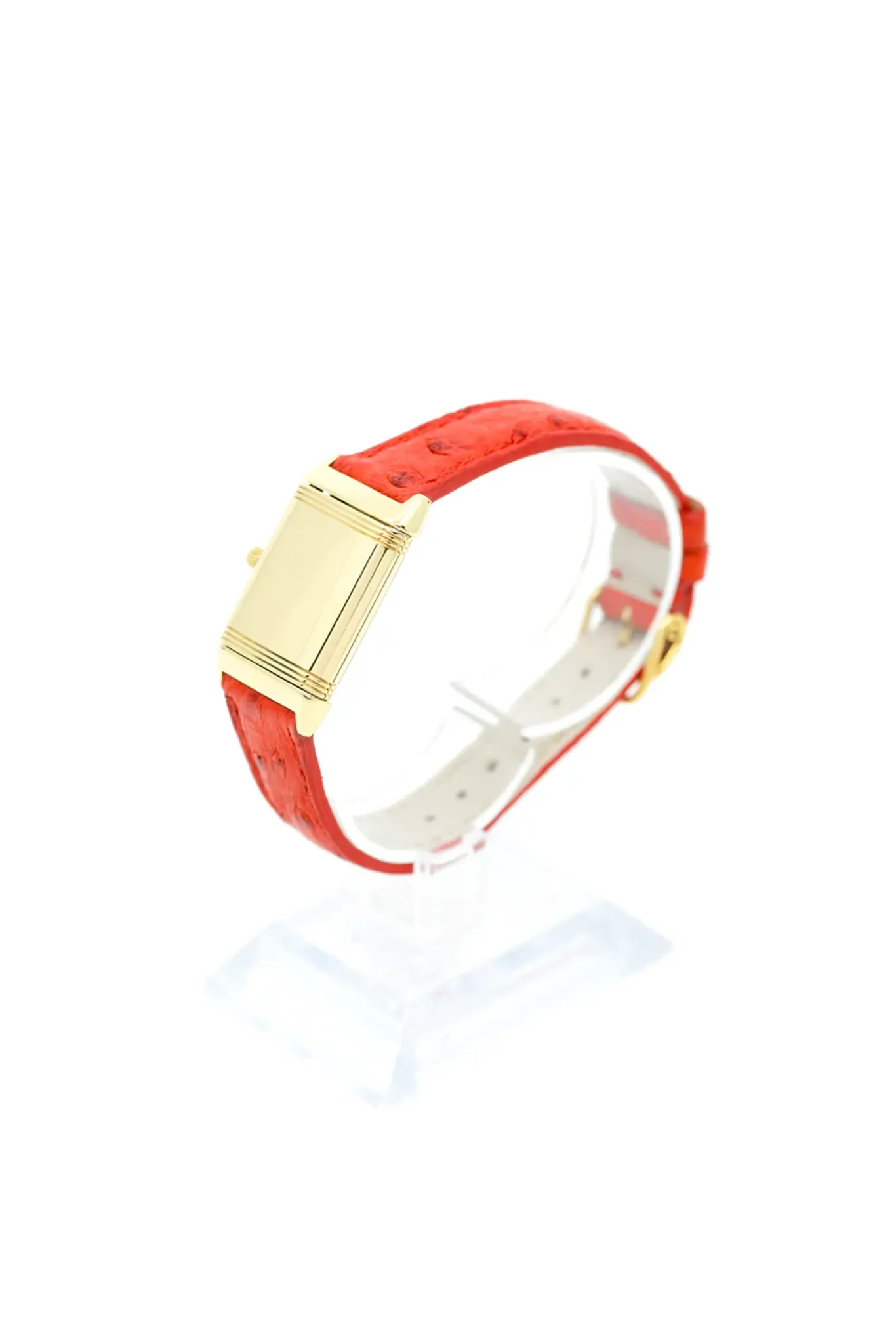 Jaeger-LeCoultre case and pin buckle in 18 carat yellow gold. Jaeger-LeCoultre strap in red ostrich leather.