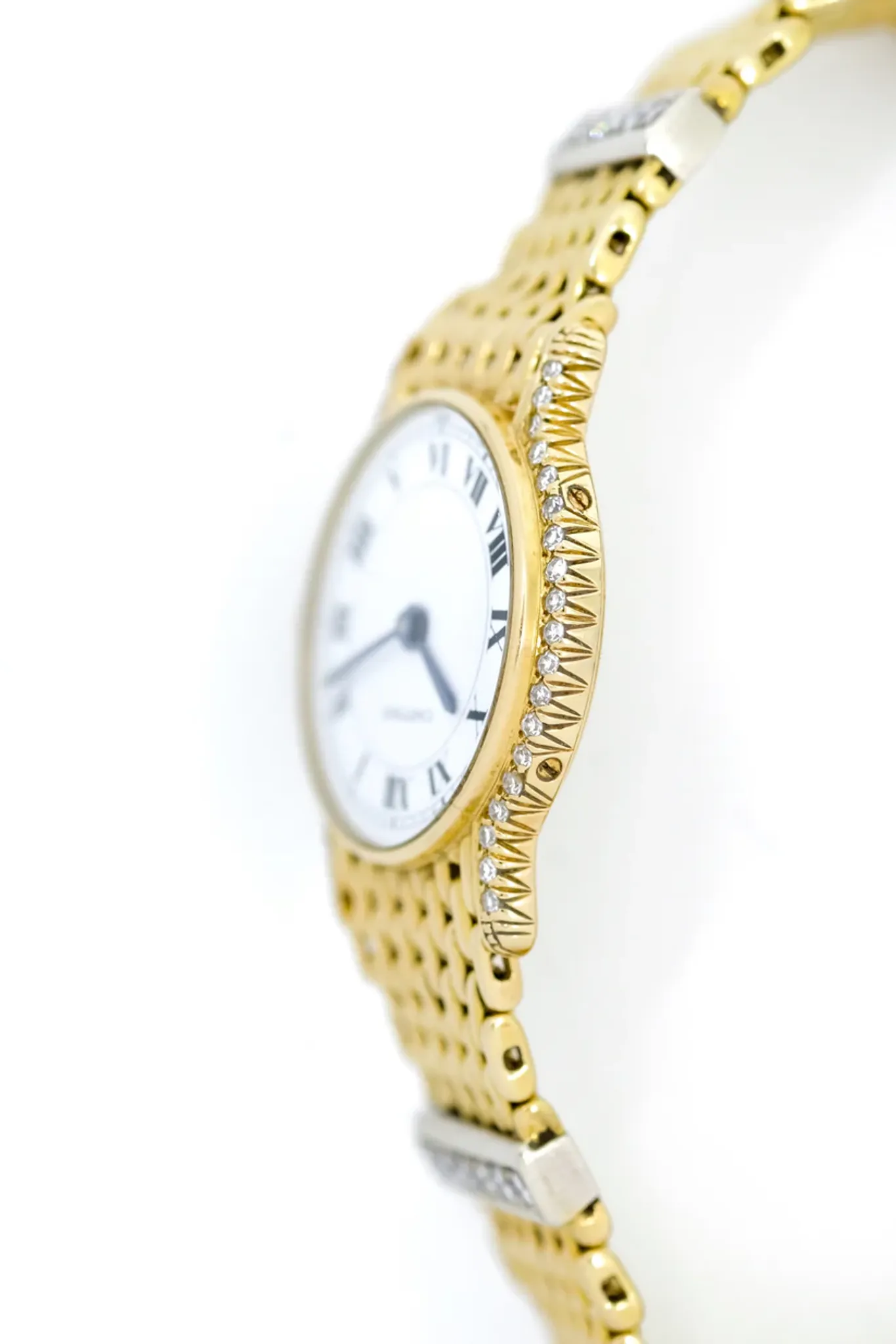 The name Riviera alone evokes sunshine, summer on the terrace, and the Côte d'Azur. This is undoubtedly why this piece was named as such. Thus, with finesse and refinement, the Riviera presented plays with the light thanks to its diamond setting on the bezel and on the baguettes that adorn the 18-carat yellow gold "grain de riz" bracelet. The attention to detail is also reflected on the sides of the case where the gold, like waves, is engraved.