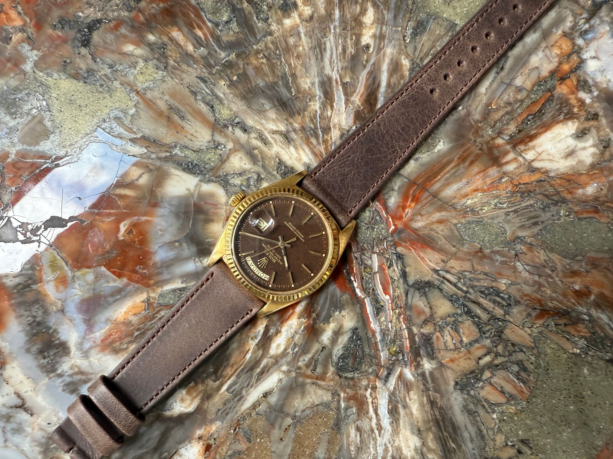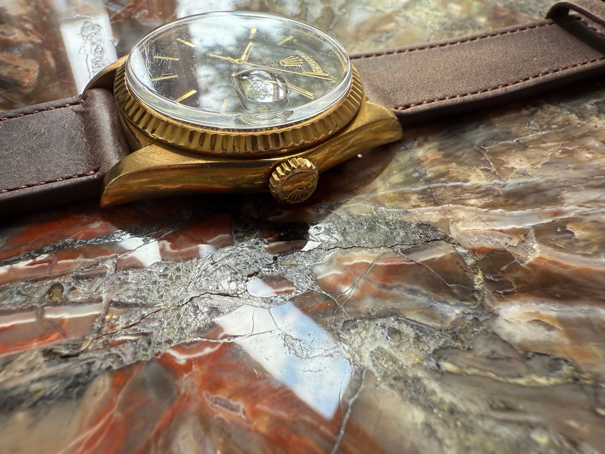 The Rolex Oyster Perpetual Day-Date is the pinnacle watch for any collector. It has been worn by some of the most iconic people in history. It is renowned for its 18K case, day and date functions, and timeless look. This is the ultimate in achievement. This amazing Day-Date watch (reference 1803) from the 1970s features a solid 18K yellow gold case and is one of the most collectible and sought-after examples available. This watch features a beautiful brown confetti matte dial with gold hour markers. The brown confetti dial is rarely seen and highly coveted as it features a confetti appearance of spectacular colors under magnification. The case measures 36mm in size, is fitted with an acrylic crystal, and comes on a handmade brown strap. This is the watch for the connoisseur who wants to achieve that subtle elegance of the Day-Date model with style. Includes a letter of authenticity. The watch has not been serviced in our possession.