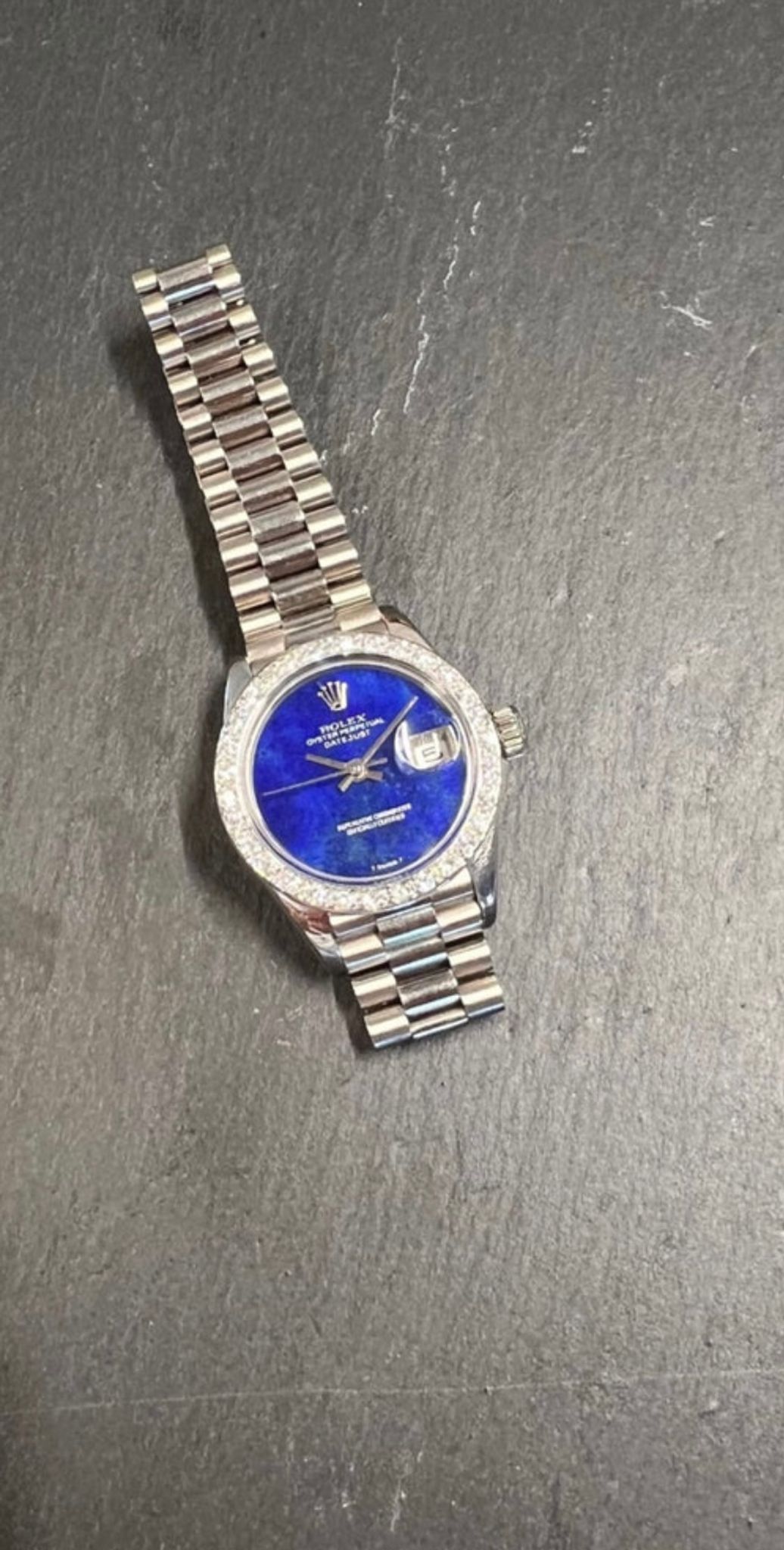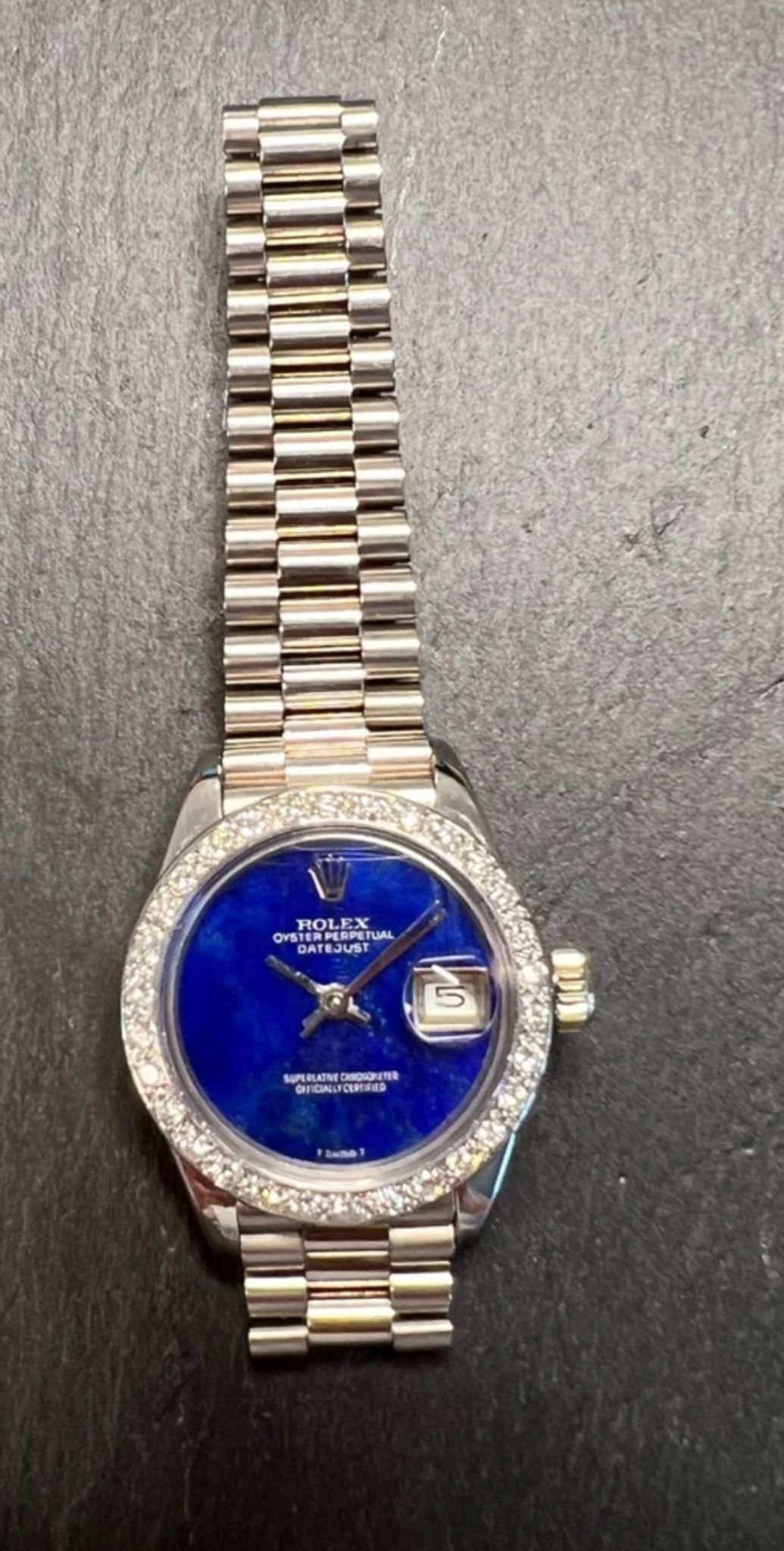 The Rolex Ladies Oyster Perpetual Datejust is a timeless classic. It exudes femininity, confidence and a playful side. This factory lapis lazuli dial truly sets this amazing watch apart. There is rare and then there is RARE. This is it. Stone dials in white gold are exceedingly rare and in 26mm are hardly ever seen. Unicorn? Perhaps. The Rolex hard stone dials are rarely seen today, highly sought after, and incredibly collectible. Lapis is stunning and no two are quite alike. We love the amazing color and natural characteristics of the stone. Lapis is known to inspire confidence, self-expression, and self-awareness. Adding to the allure and beauty is this stunning factory 18k white gold diamond bezel. Wow! This amazing watch (reference 6917) has an automatic movement, acrylic crystal, and 18K yellow gold screw down crown. It comes fitted on a newer heavy factory original 18K white gold President bracelet with hidden clasp. A watch for the true connoisseur and fashionable wearer. Includes a letter of authenticity and one-year limited warranty on the movement of the watch from Veralet. PAYMENT IS ONLY AVAILABLE VIA BANKWIRE.