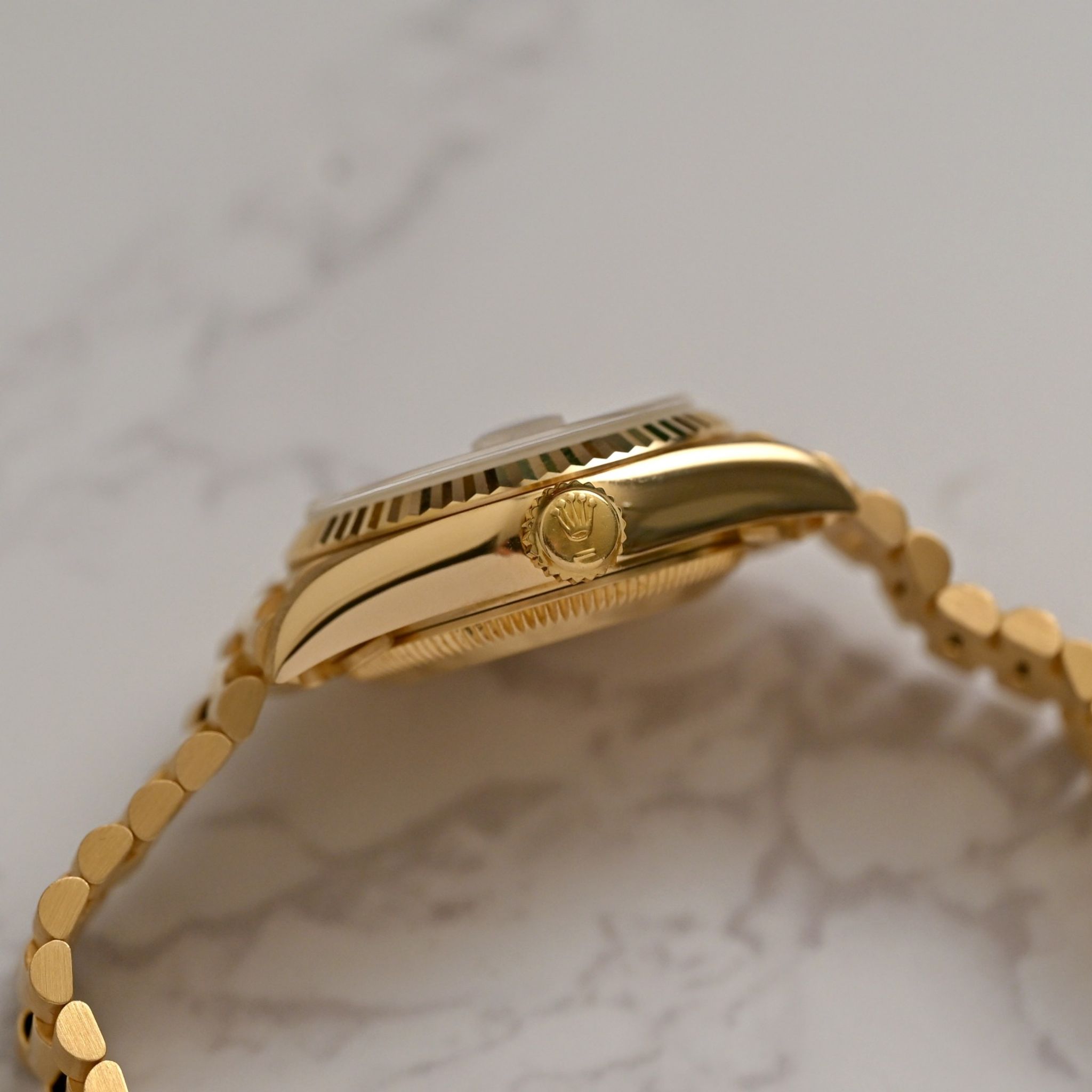 Dial: In excellent condition, this exquisite gold dial showcases diamond hour markers and matching hands, exuding elegance and sophistication.,