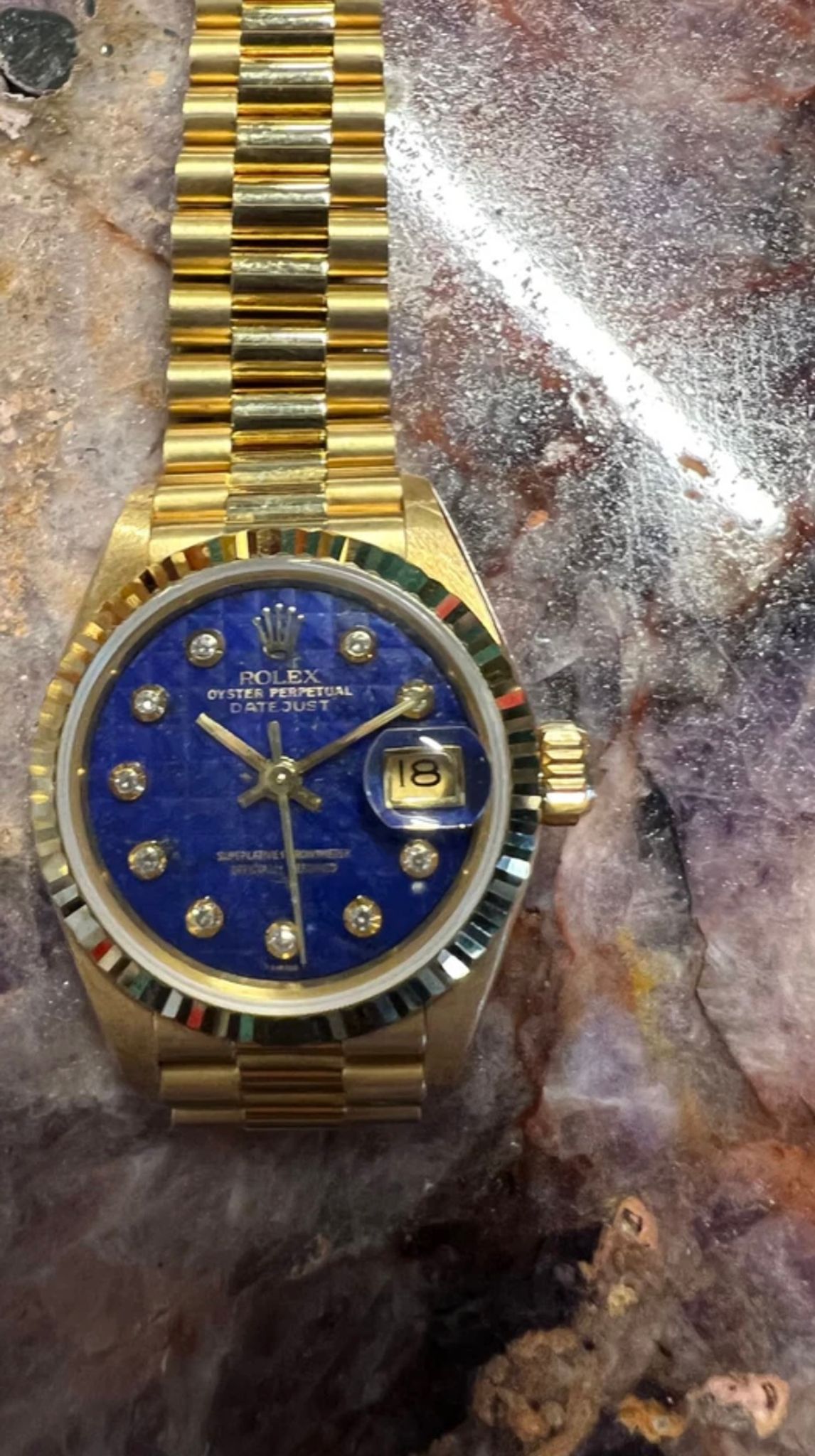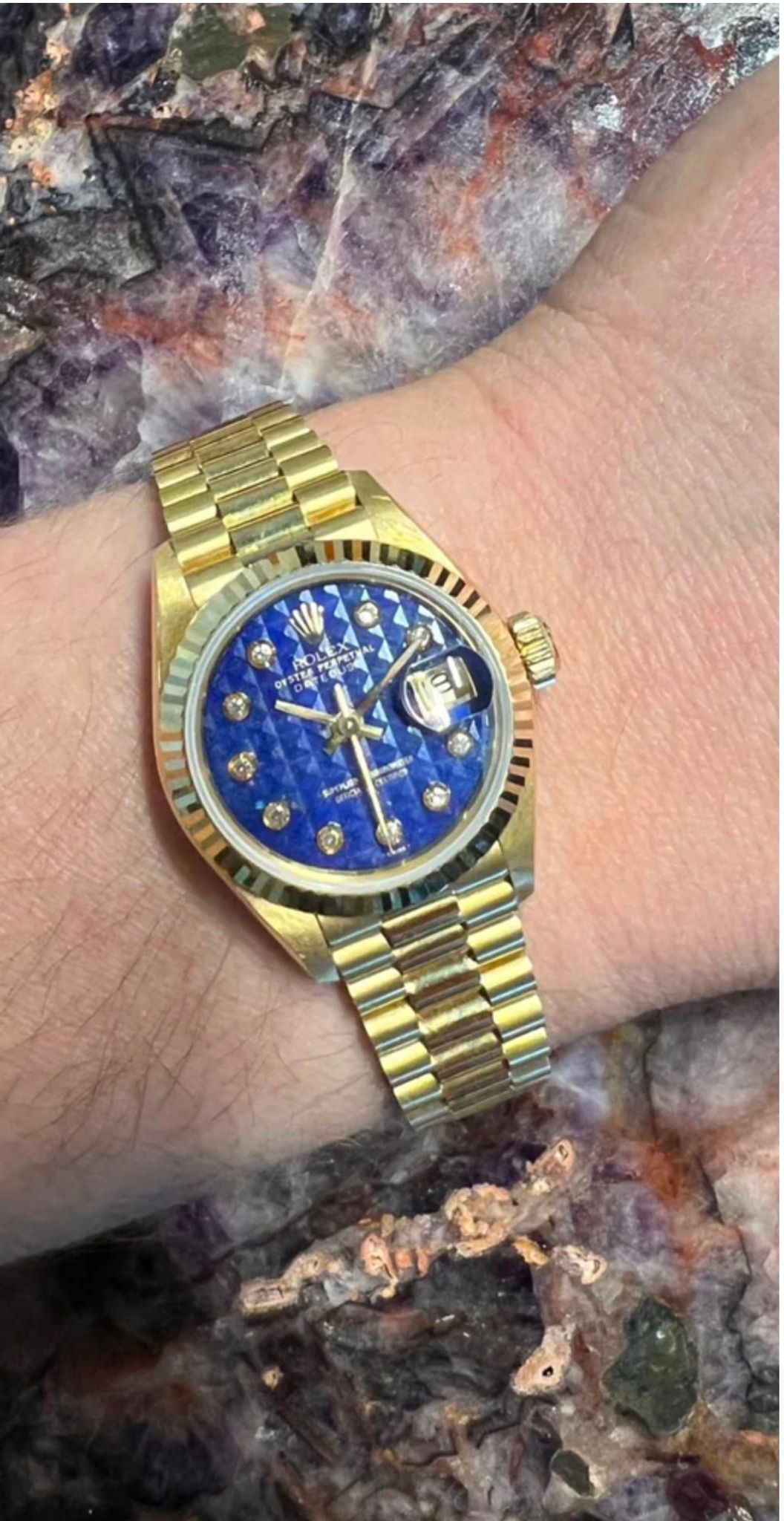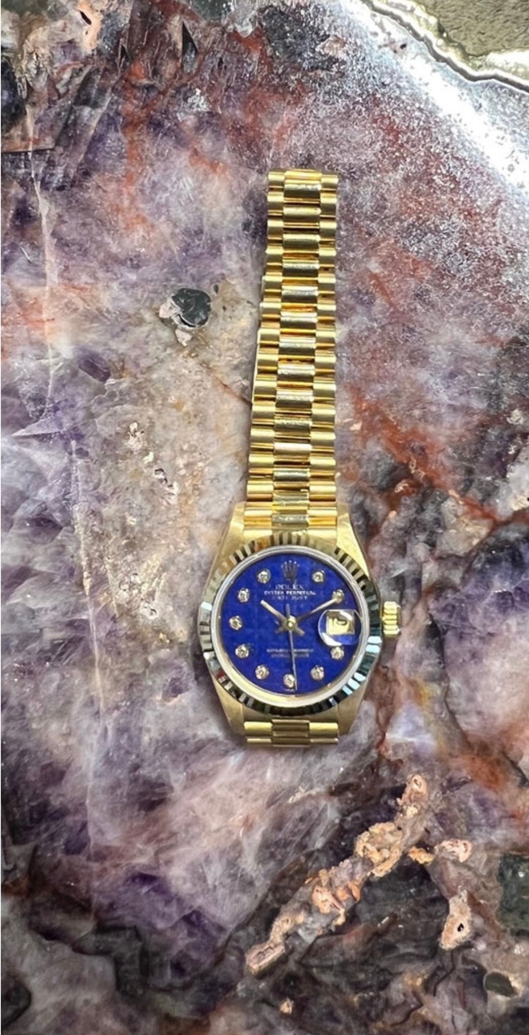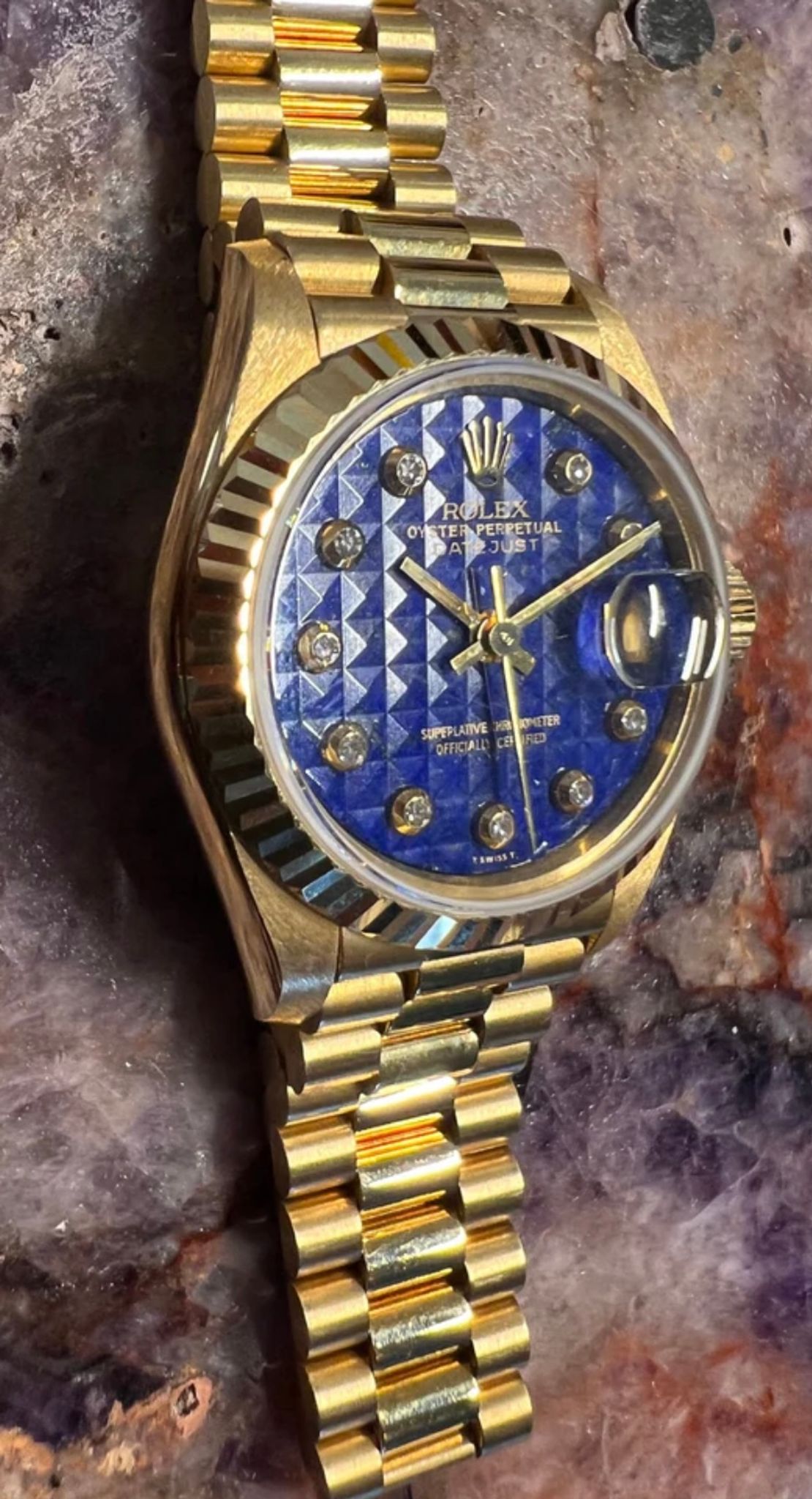 Rolex 18K Yellow Gold Ladies Oyster Perpetual Datejust with Factory Lapis Lazuli Pyramid Serti Dial.