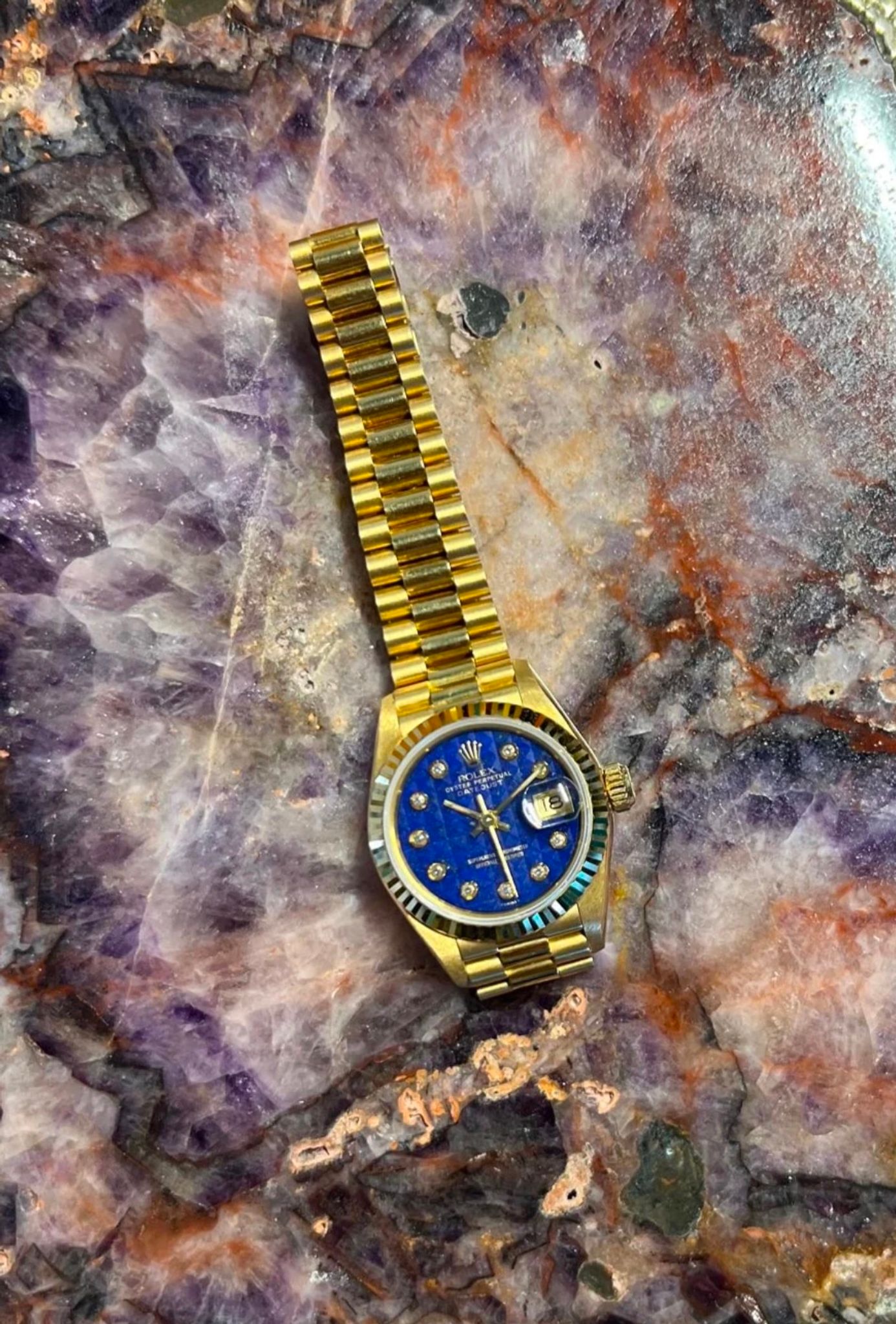 The Rolex Ladies Oyster Perpetual Datejust is timeless. It exudes femininity, confidence, and a playful side. The look, styling, design, and factory coral dial truly set this amazing watch apart. The Rolex hard stone dials are rarely seen today, highly sought after, and collectible. Did you know that Rolex produced in exceedingly limited numbers hard stone dials that were hand cut into a pyramid shape? Well, now you know! To top it off they were hand set with bezel set diamond hour markers. Talk about cool! They were made in a few different stones and we are in love with this lapis lazuli example. Did we mention it is in pristine condition? What’s not to love about this gemstone? This 26mm watch has an automatic movement, sapphire crystal, and 18K yellow gold screw down crown. It comes fitted on its original 18K yellow gold president bracelet. A watch for the true connoisseur and fashionable wearer. Includes a letter of authenticity and one-year limited warranty on the movement of the watch from Veralet.