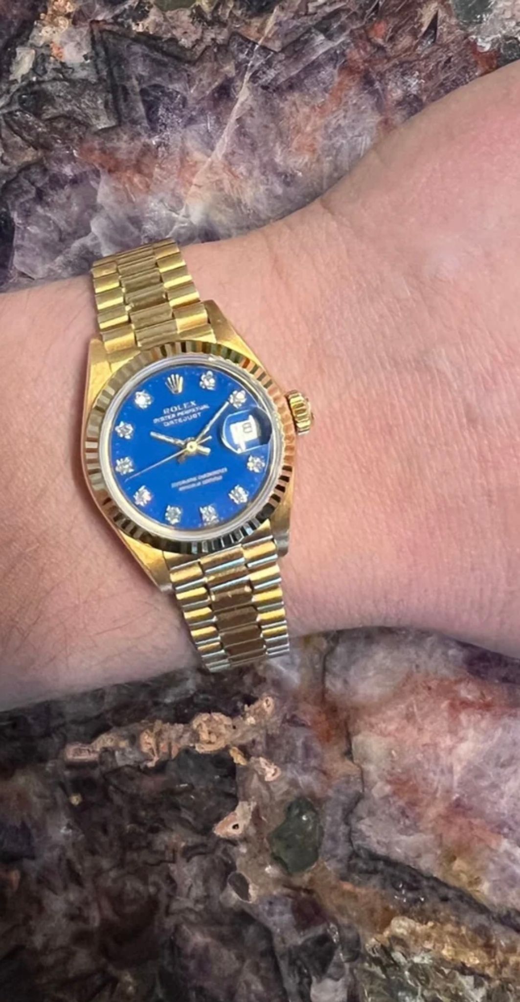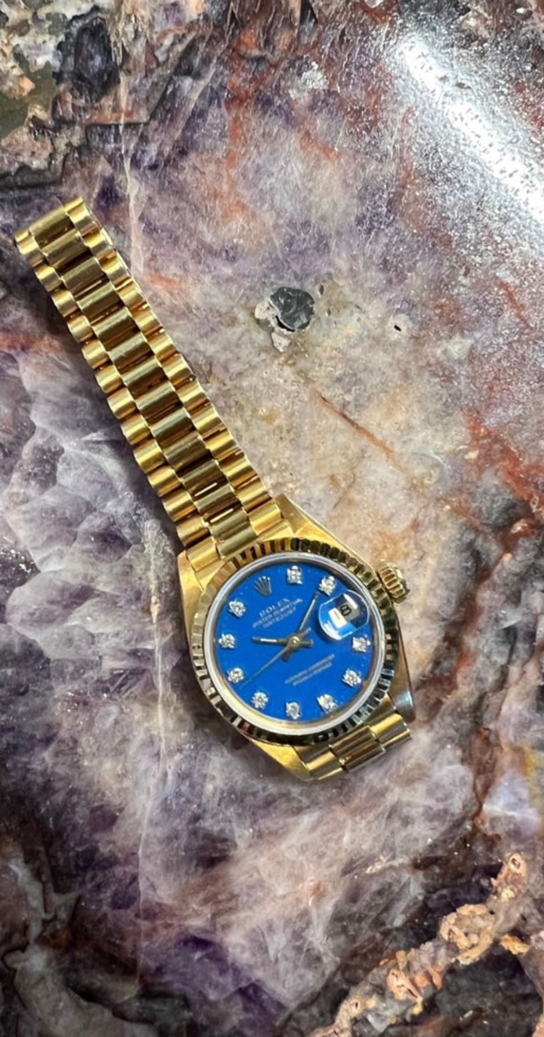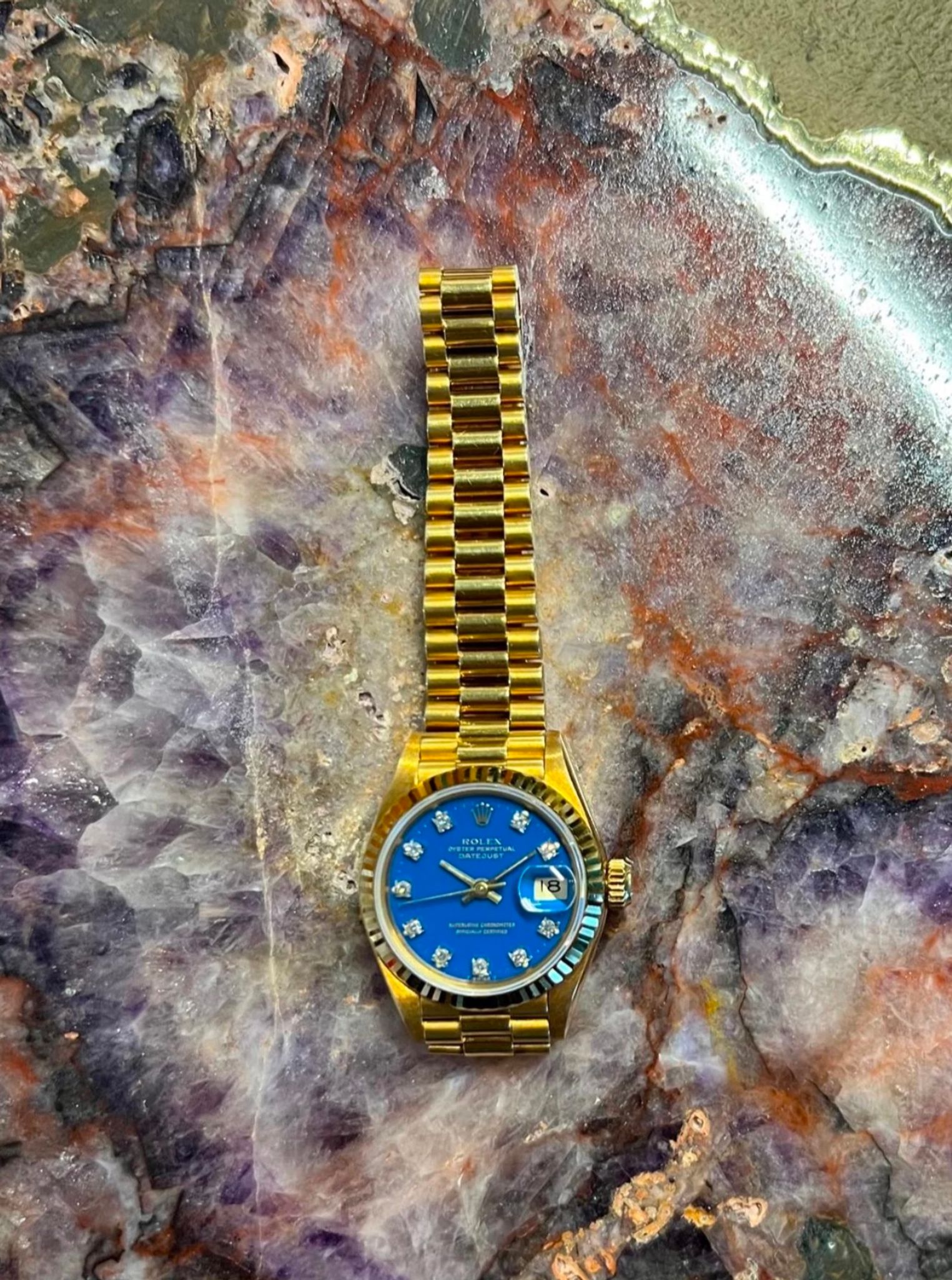 The Rolex Ladies Oyster Perpetual Datejust is timeless. It exudes femininity, confidence, and a playful side. The look, styling, design, and factory coral dial truly set this amazing watch apart. The Rolex Stella dials are rarely seen today, highly sought after, and collectible. Did you know that in the 1970s and 1980s Rolex watches in very limited quantities in a variety of bright and beautiful colors.Some of these delightful Stella dials were even made with factory diamond hour markers. Blue, is a color rarely seen and the majority of the time it is without diamonds. Did we mention it is in pristine condition? What’s not to love about this gemstone? This 26mm watch has an automatic movement, sapphire crystal, and 18K yellow gold screw down crown. It comes fitted on its original 18K yellow gold president bracelet. A watch for the true connoisseur and fashionable wearer. Includes a letter of authenticity and one-year limited warranty on the movement of the watch from Veralet.