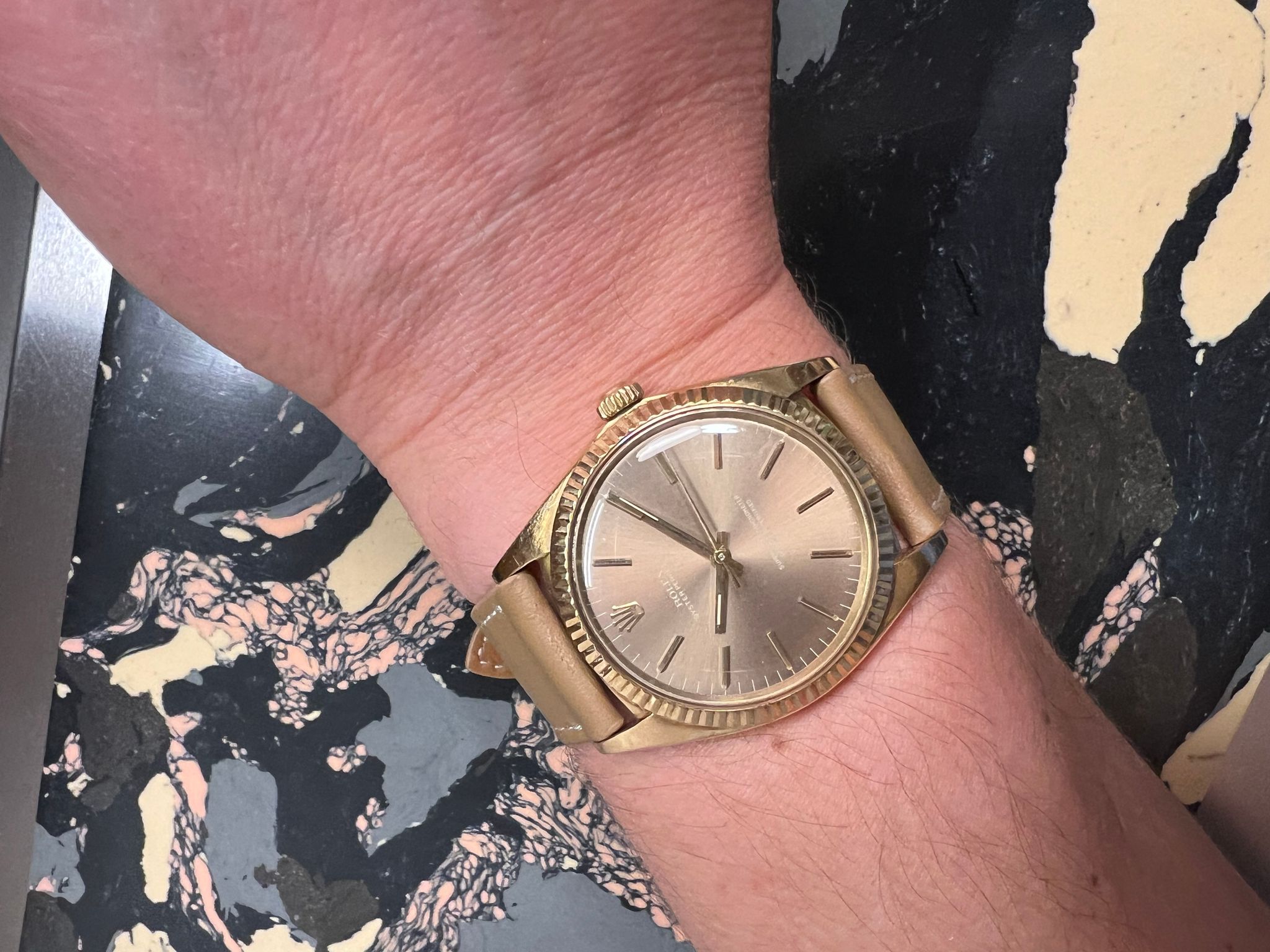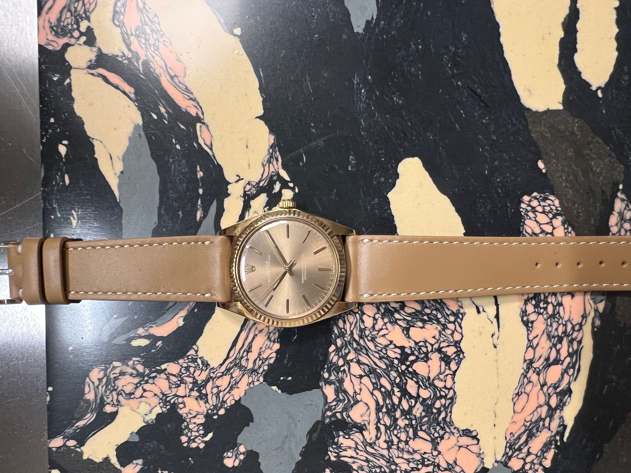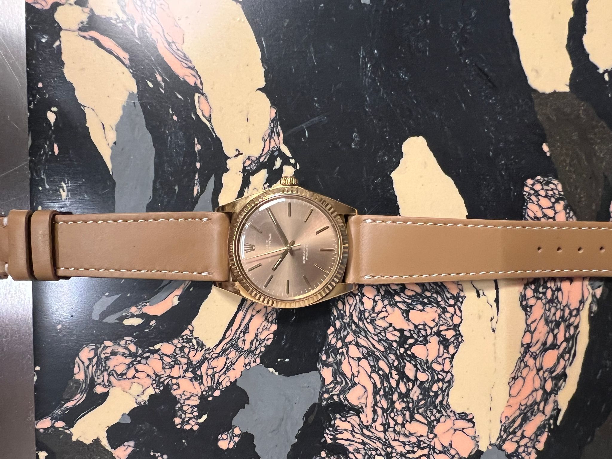 Up for sale is an insanely cool and very collectible vintage Rolex Oyster Perpetual. Perhaps it is the oversized 36mm case made of 18k yellow gold or the stunning ghost dial that makes this special watch so appealing. The oversized Oyster Perpetual watches are few and far between especially on 18k yellow gold. The watch features a striking ghost dial perfectly paired with a handmade matching strap. The watch is in working order but has not been serviced.