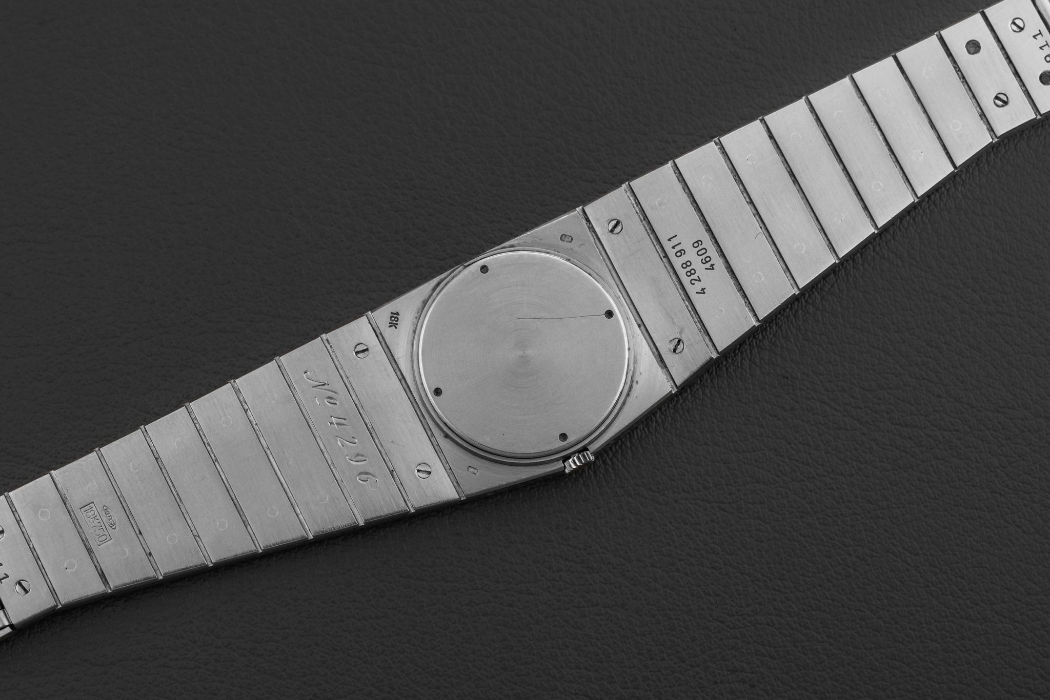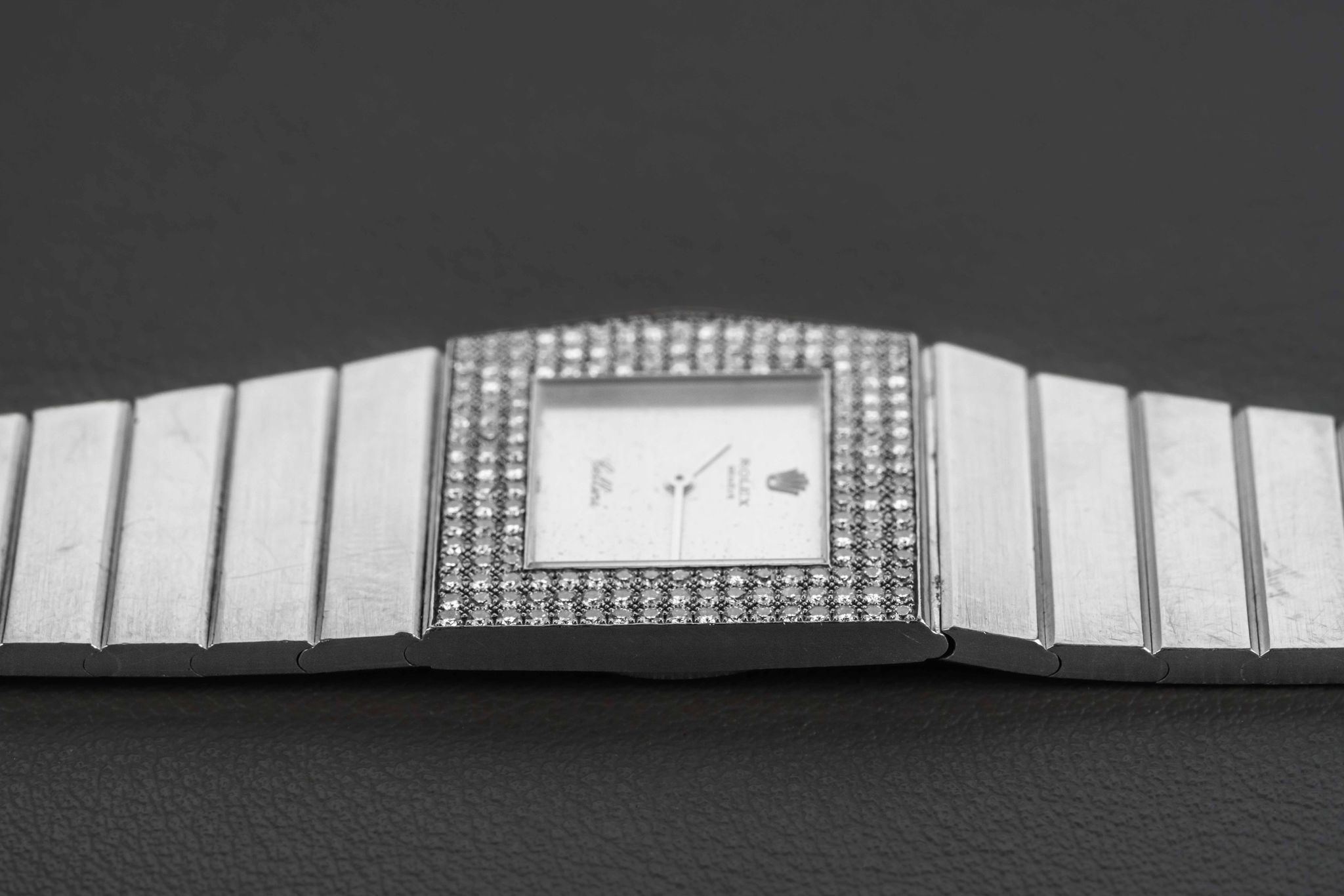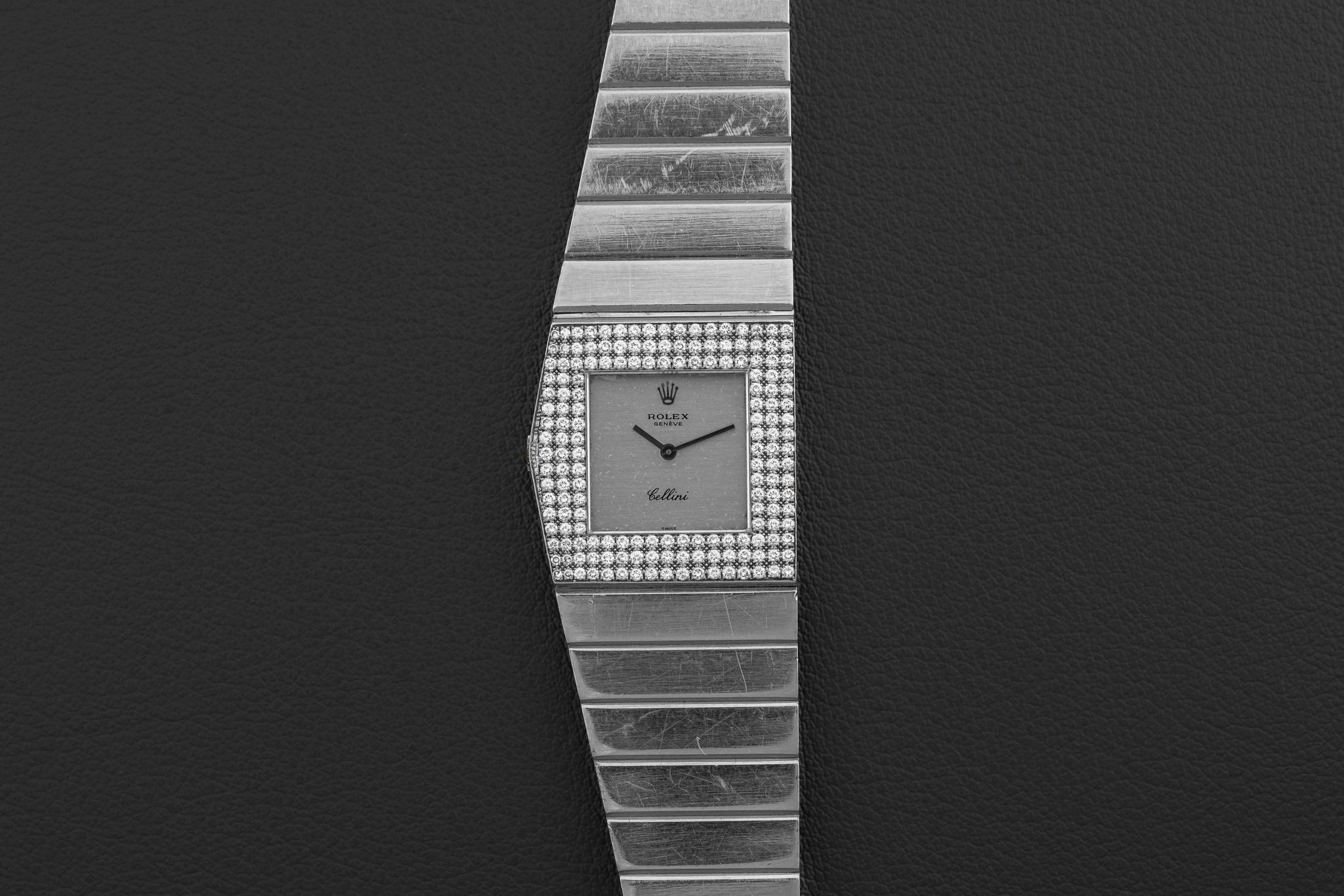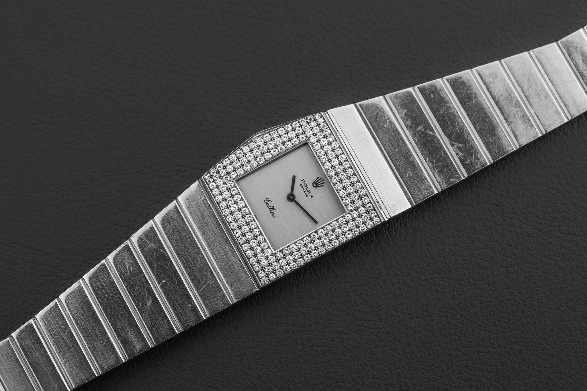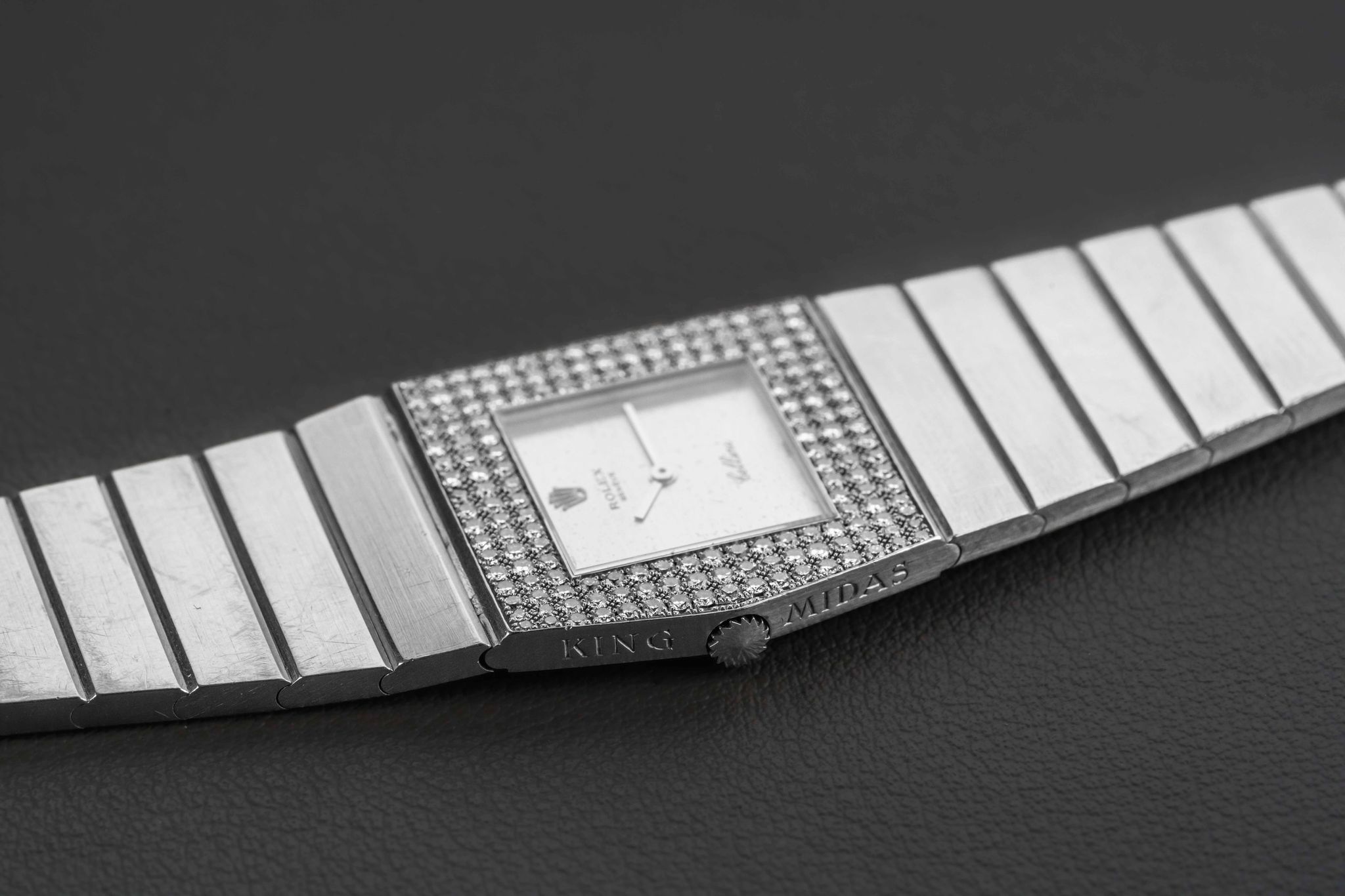 Up for grabs is a very rare Rolex King Midas, produced circa 1975, given the reference 4609. The 4609 reference number specifically denotes an asymmetric case in white gold (rare its own regard) and with a factory diamond-set bezel. Many original King Midas were customized in the 70-80s with aftermarket diamonds, as presumably the retail price of a factory-set diamond bezel was much costlier than the standard fare. This Rolex King Midas is in good vintage condition, with a sharp case (maybe lightly polished once in the past), and original dial showing some light aging/patina. The bracelet will fit an approximate 7.25″ wrist.