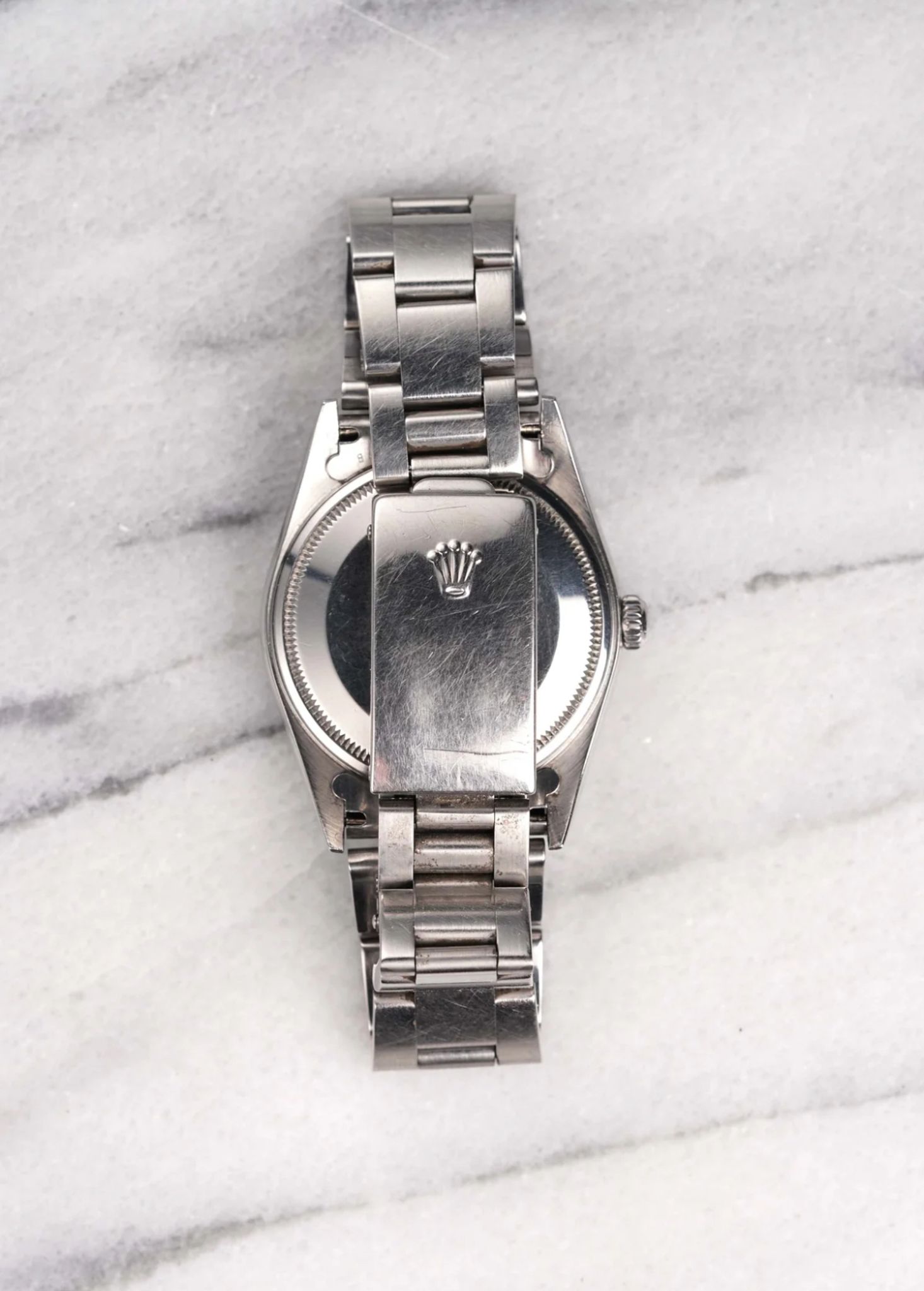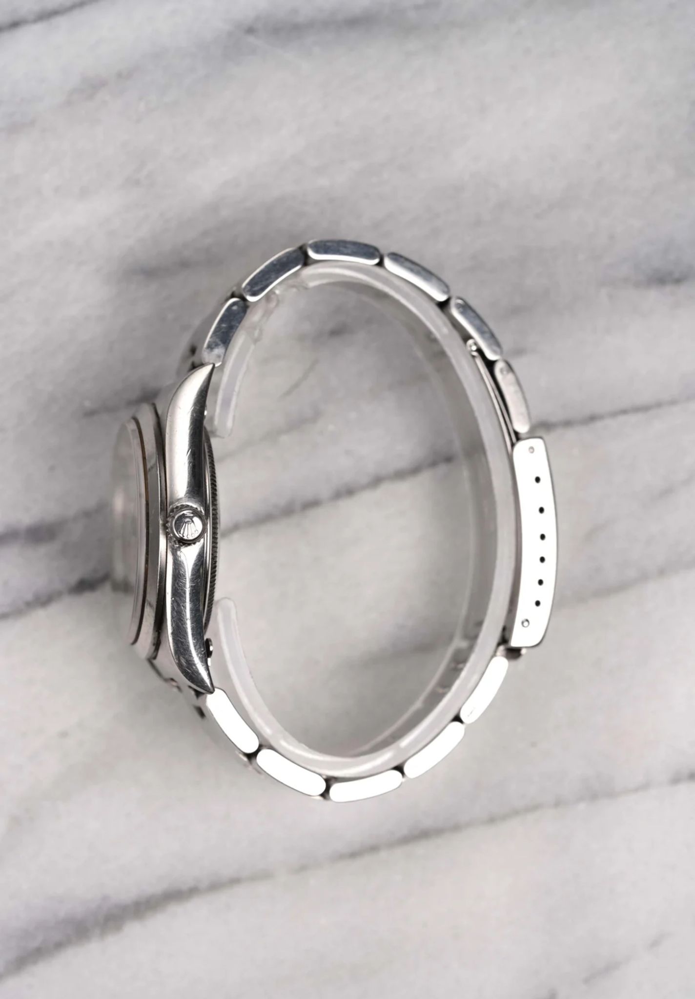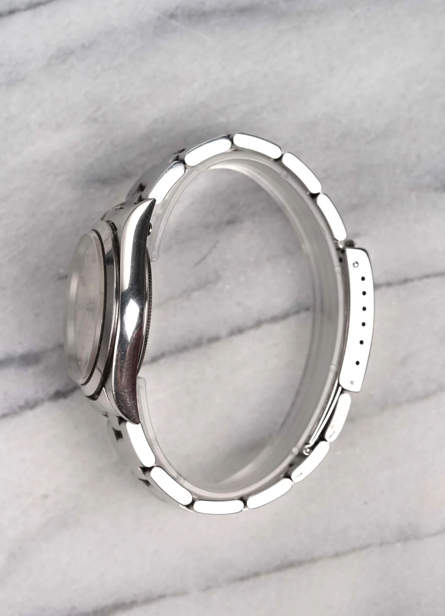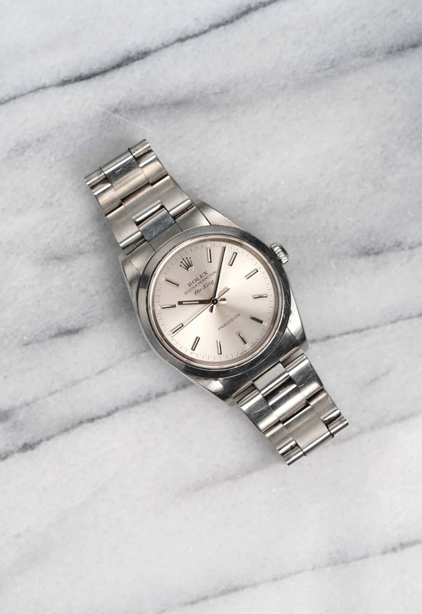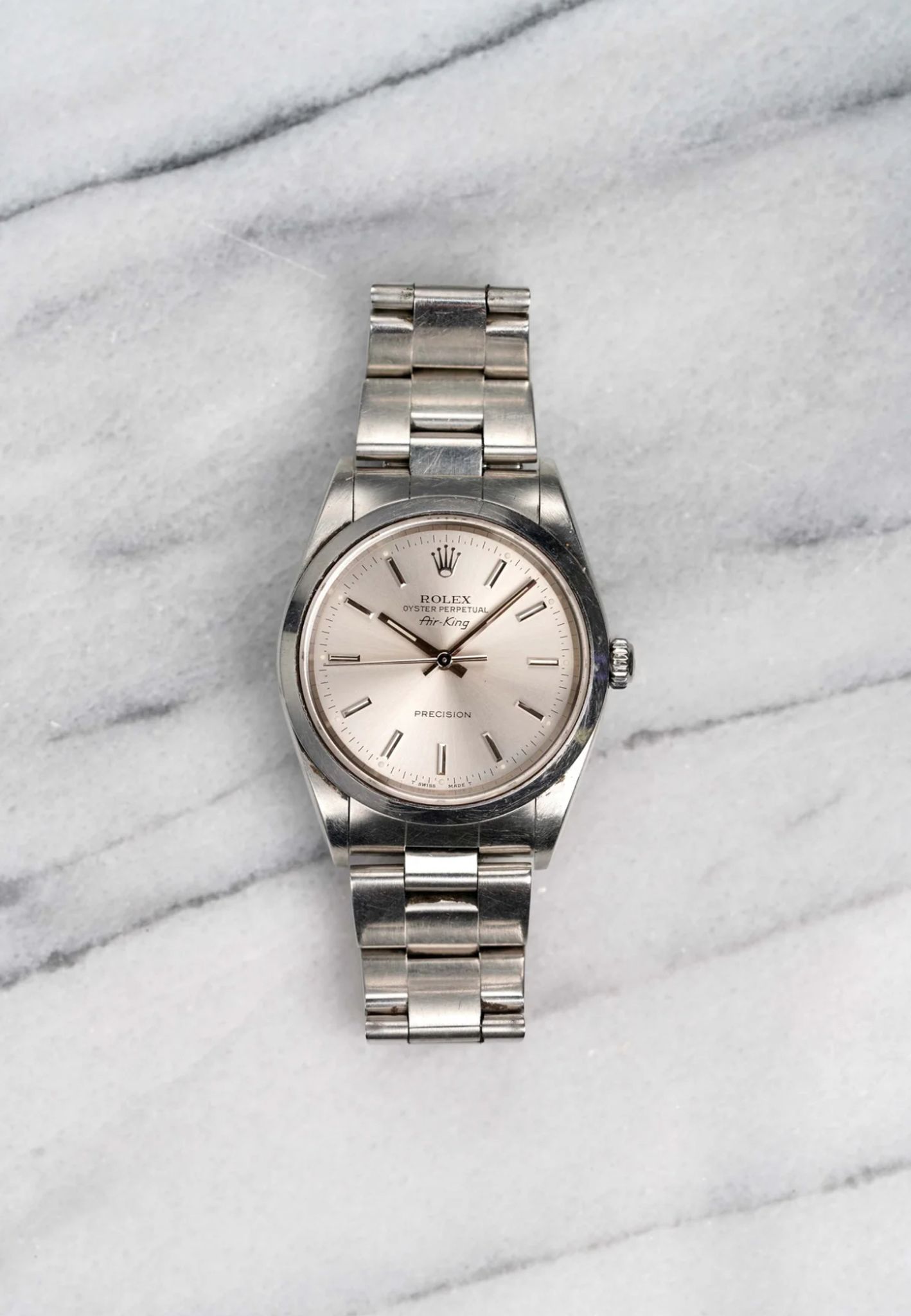 Here's a Rolex Air King Oyster Perpetual reference number 14000 automatic with a silver sunburst dial from the 1990s. Keeps great time and is fully functional. Measurements include a 34mm oyster case and 19mm lug width. It's on its original hard oyster bracelet that fits up to a 7 inch wrist (557 B endlinks, 78350 oyster bracelet). Time only. Clean sunburst silver dial with matching white lume in both the hands and lume plots. No Holes case. There is a slight cream hue on the dial as seen in photos. Stainless steel case and caseback. Both the dial and crystal are free from any scratches or marks. All parts are original including the signed Rolex crown, dial, movement, and caseback. Both the dial and case are in great cosmetic, untouched condition.