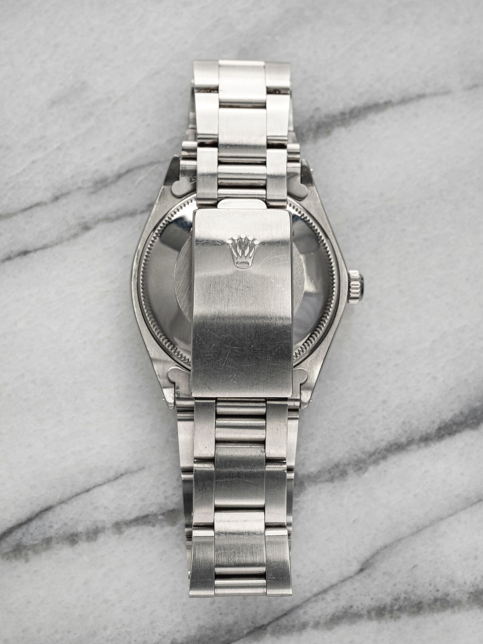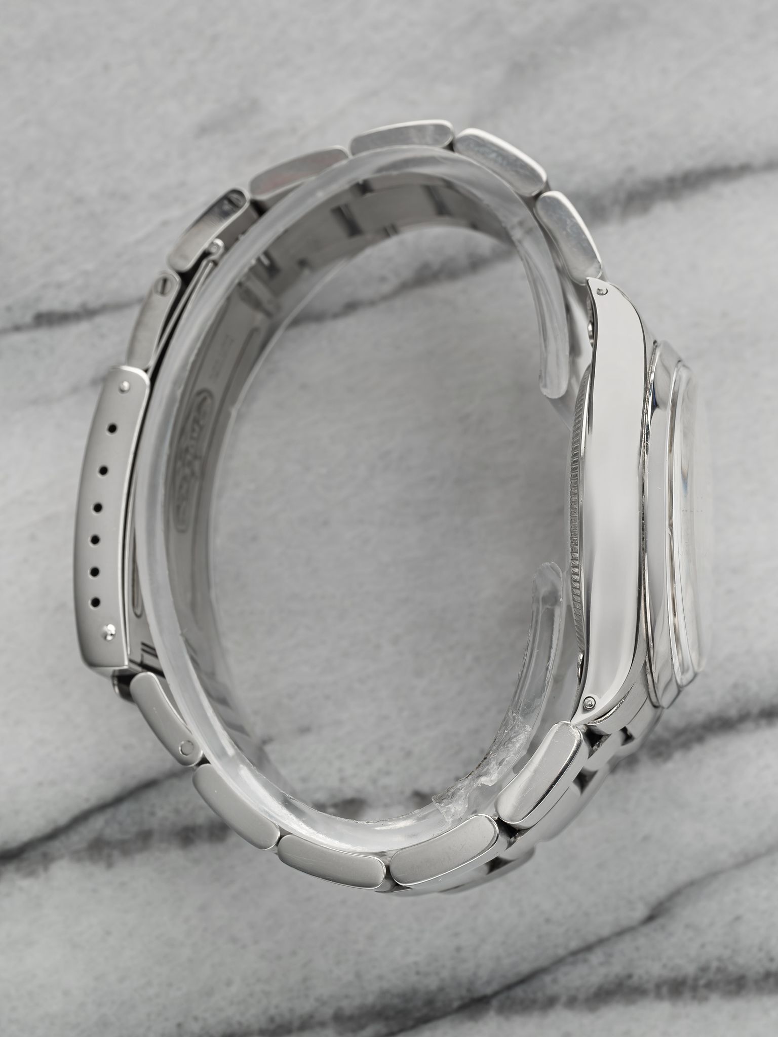 Here's a vintage Rolex Air King precision reference 5500 automatic with a silver cream dial from the 70s. Keeps great time and is fully functional. Measurements include a 34mm oyster case and 19mm lug width. It's on its original heavy oyster bracelet that fits up to a 7 inch wrist (557 endlinks, 78350 bracelet) Time only. This gorgeous silver dial is clean. Drilled lug holes. Stainless steel case and caseback. Both the dial and crystal are free from any scratches or marks. All parts are original including the signed Rolex crown, dial, movement, and caseback. Both the dial and case are in great cosmetic, untouched condition.