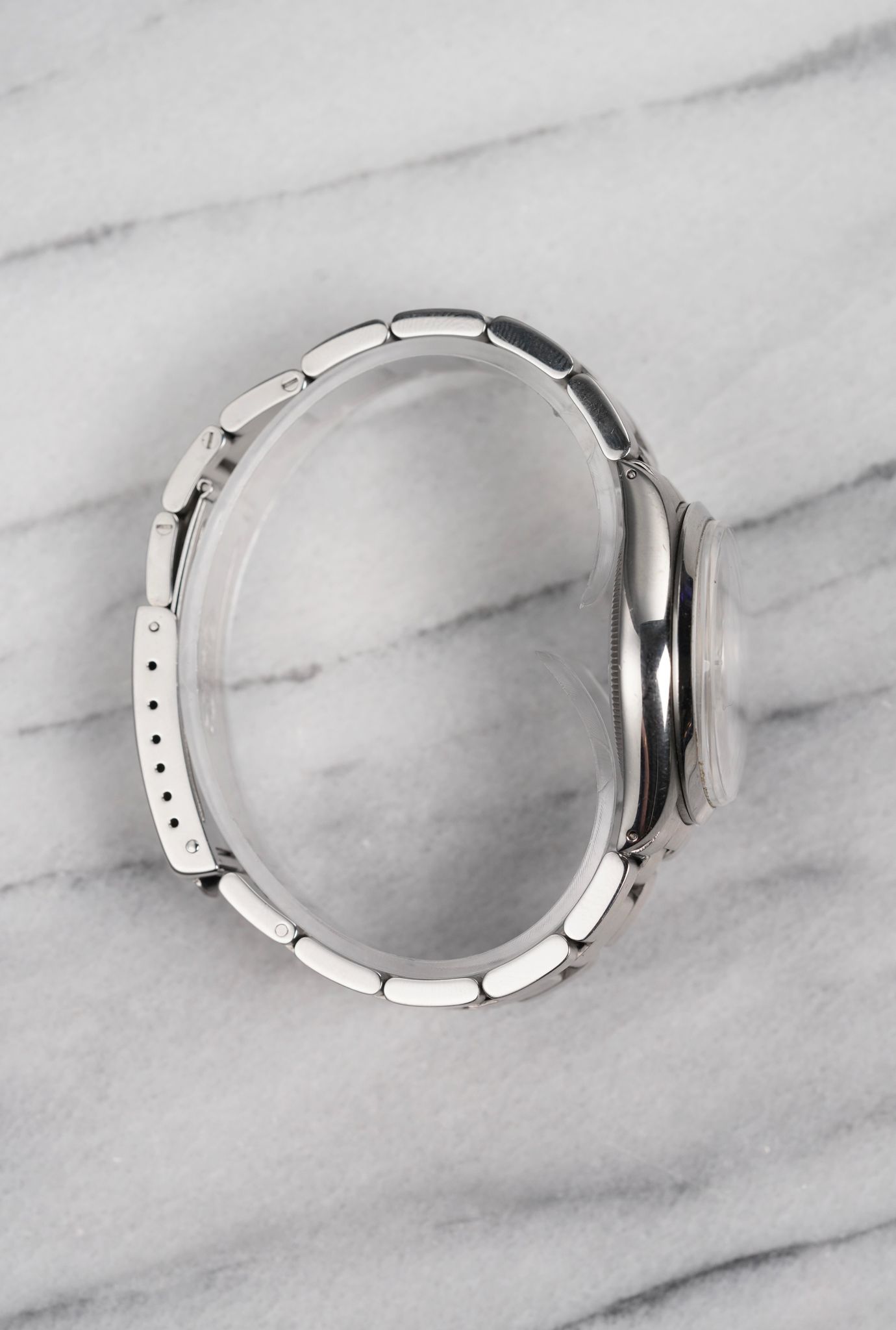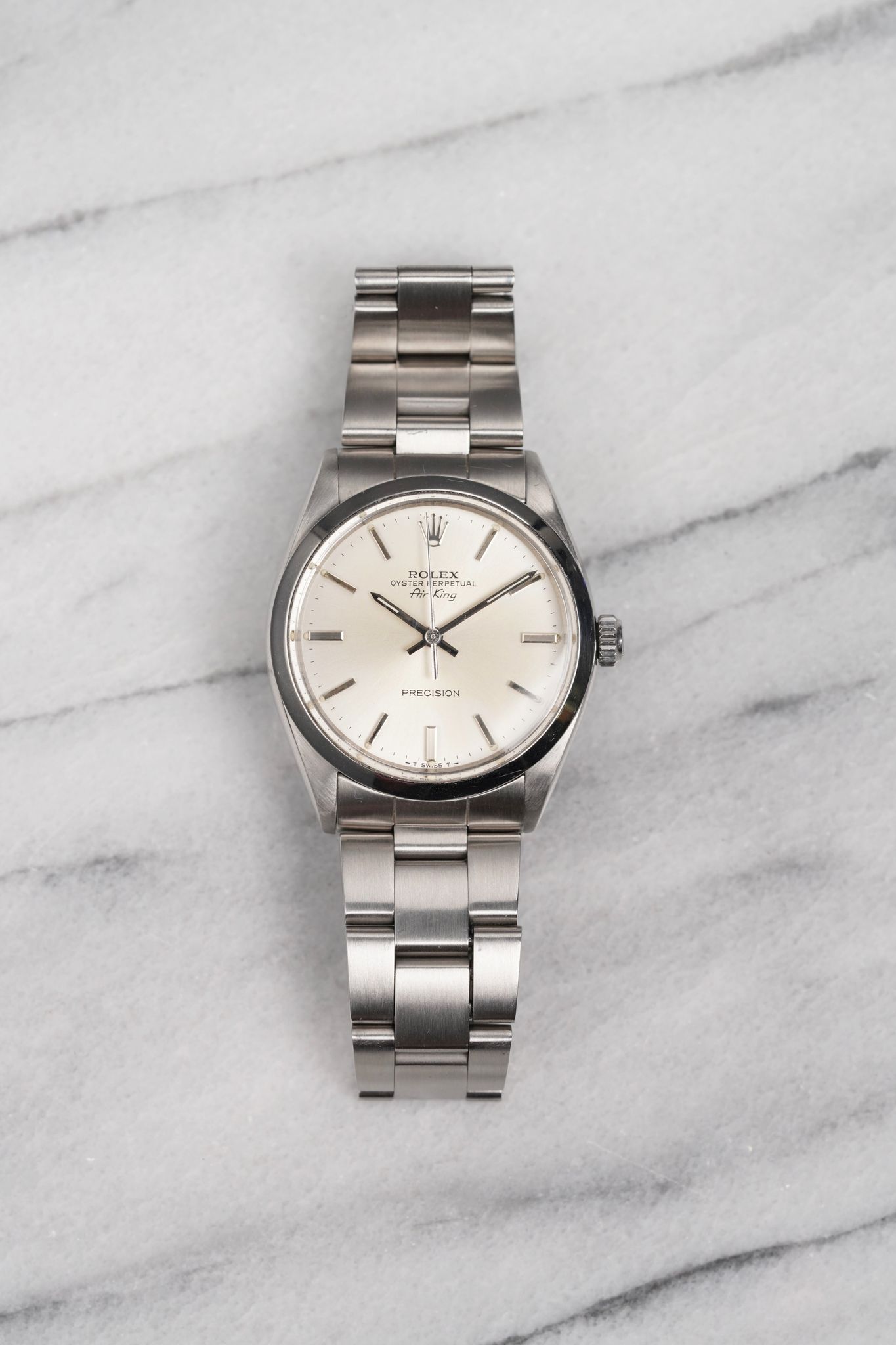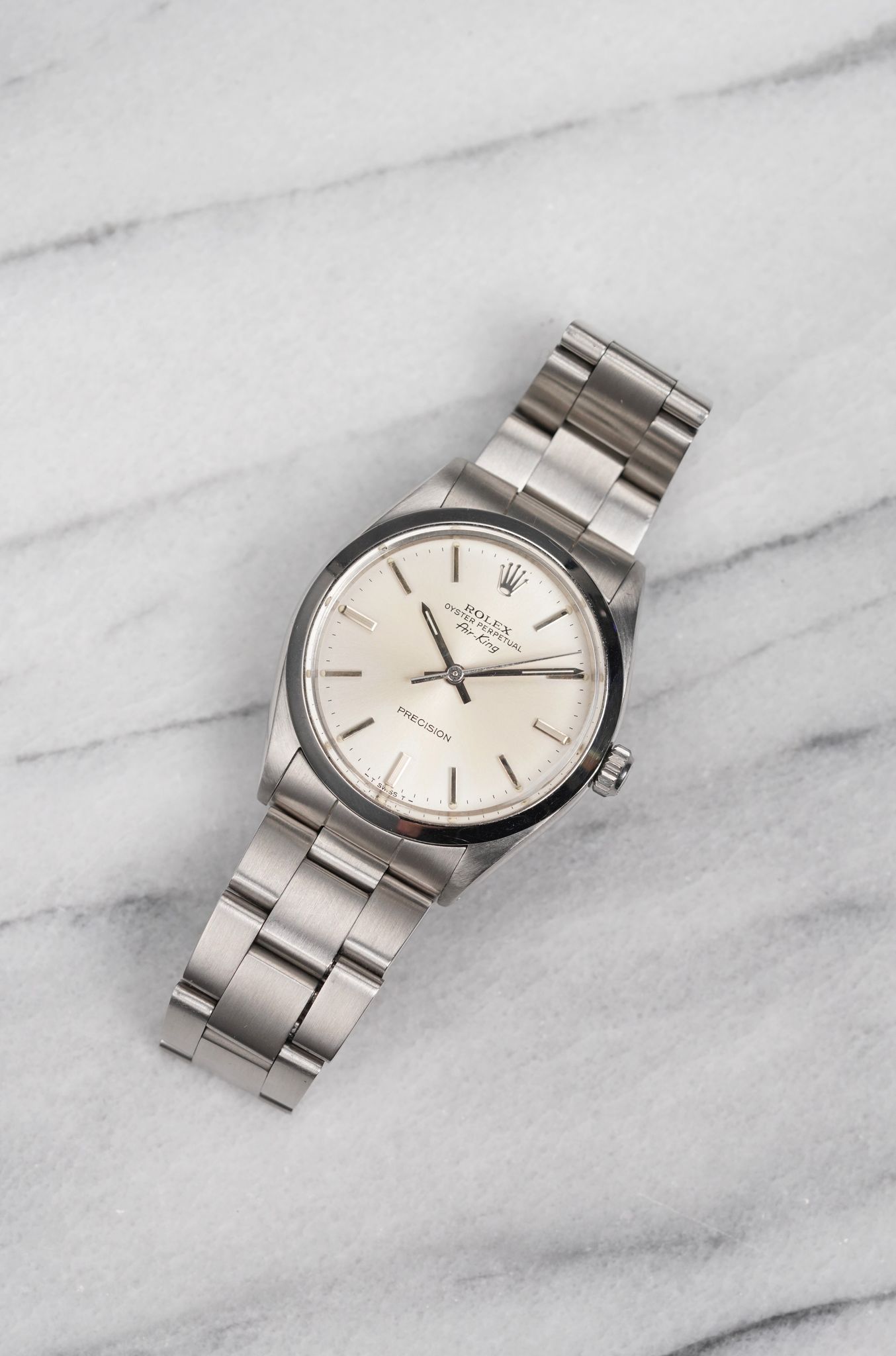 Here's a vintage Rolex Air King precision reference 5500 automatic with a silver cream dial from the 70s. Keeps great time and is fully functional. Measurements include a 34mm oyster case and 19mm lug width. It's on its original heavy oyster bracelet that fits up to a 7 inch wrist (557 endlinks, 78350 bracelet) Time only. This gorgeous silver dial is clean. Drilled lug holes. The lume in both the hands and lume plots have an even patina Stainless steel case and caseback. Both the dial and crystal are free from any scratches or marks. All parts are original including the signed Rolex crown, dial, movement, and caseback. Both the dial and case are in great cosmetic, untouched condition.