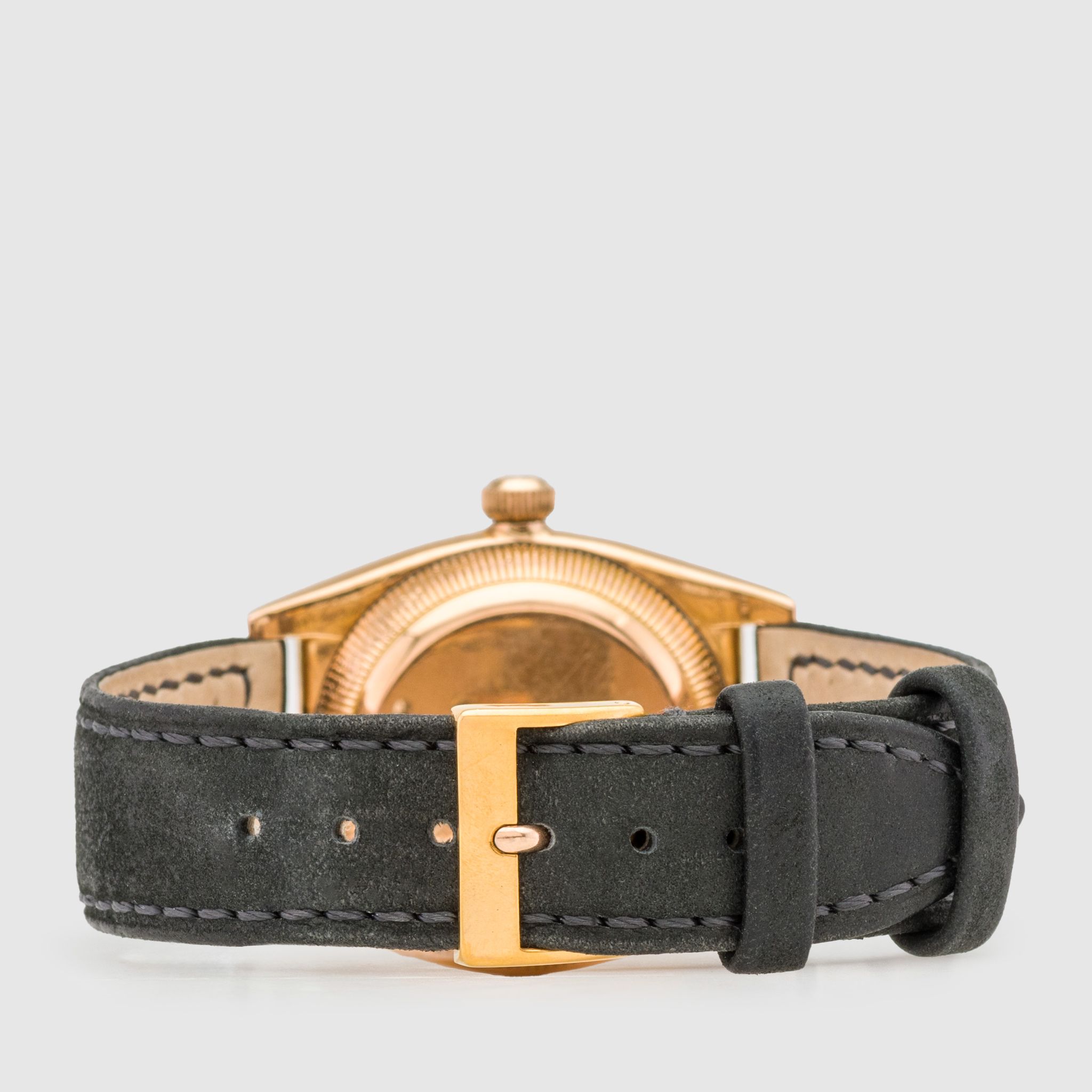 A prime example of this iconic model is the reference 3372, which excels in rarity and design. Crafted from 18k pink gold, this watch remains in exceptionally well-preserved condition. One of its standout features is the beautifully decorated bezel, adorned with chased hour markers and concentric engravings—details so delicate that they would disappear with polishing. Remarkably, this bezel retains its original finish, a rarity among surviving Bubblebacks.