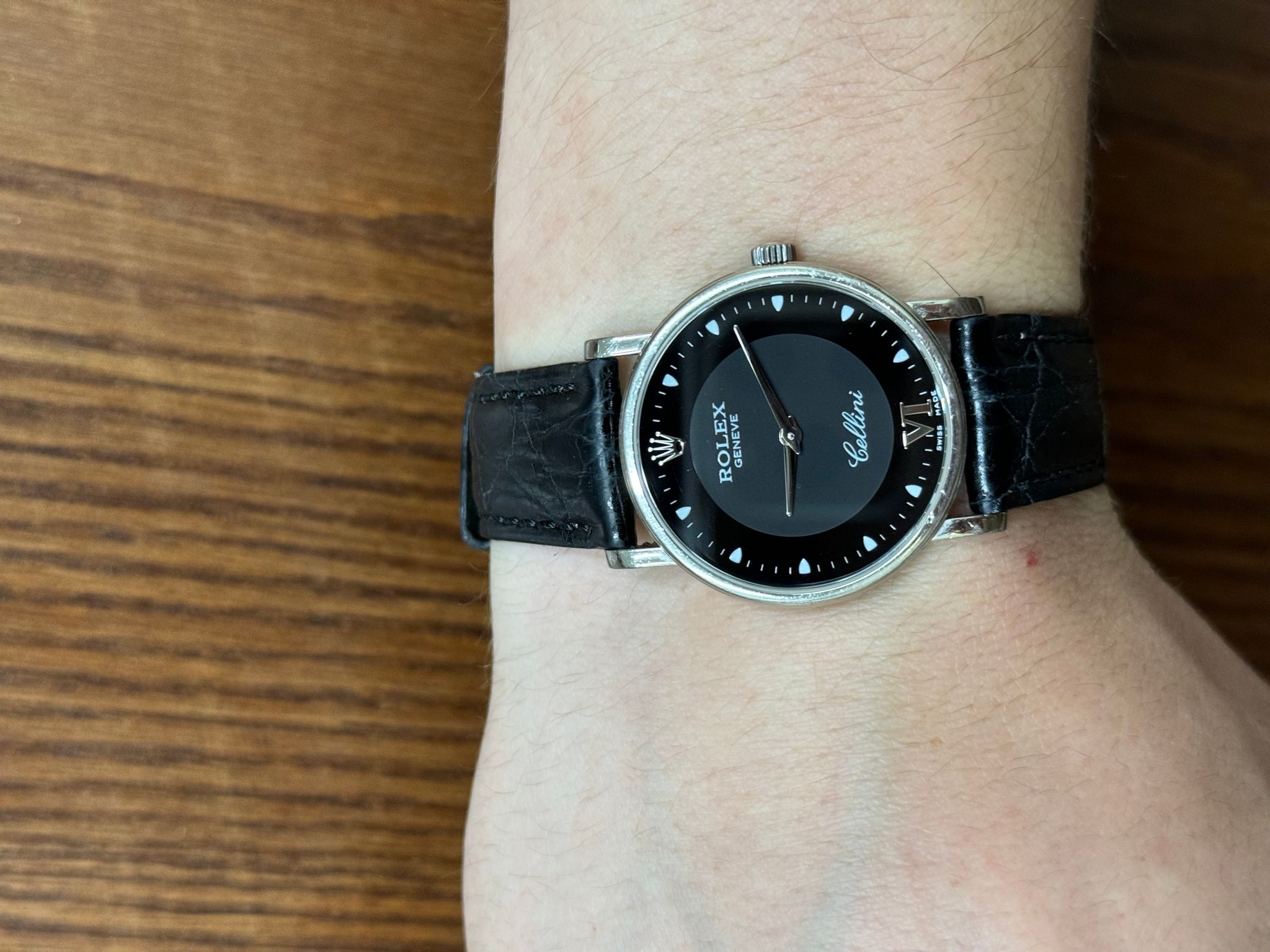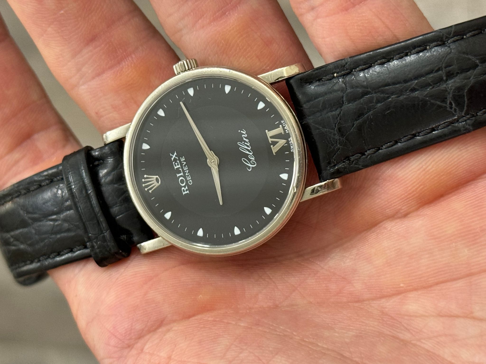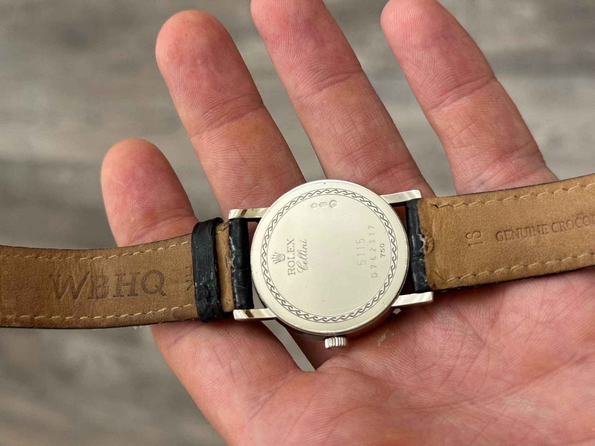 Rolex Cellini 18k Gold 5115. Watch is in great pre-owned condition, D serial dates the watch to 2005/2006, on aftermarket leather strap, original 18k White Gold Rolex buckle. Minor knick on case near 7 o'clock and on bottom left lug.
